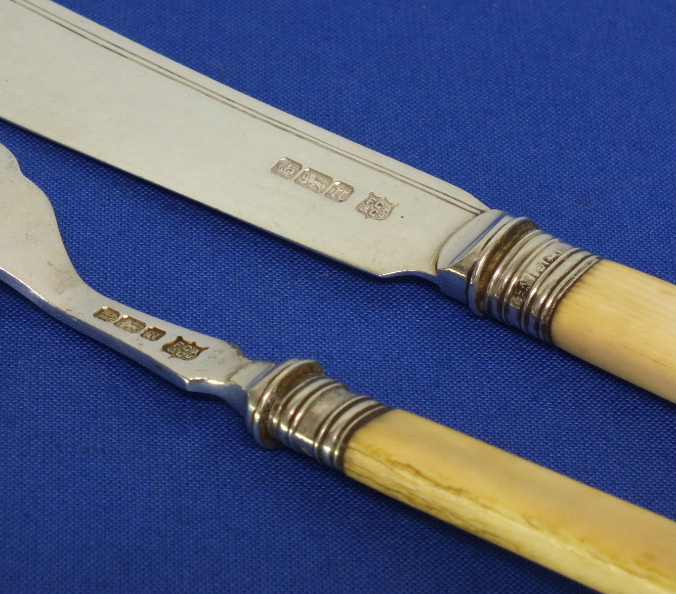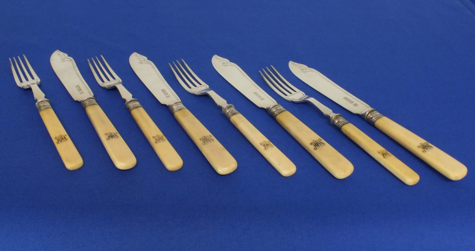 A very nice Set of for English Silver Fish Eaters, Sheffield 1905, length knife 20 cm, in very good condition.