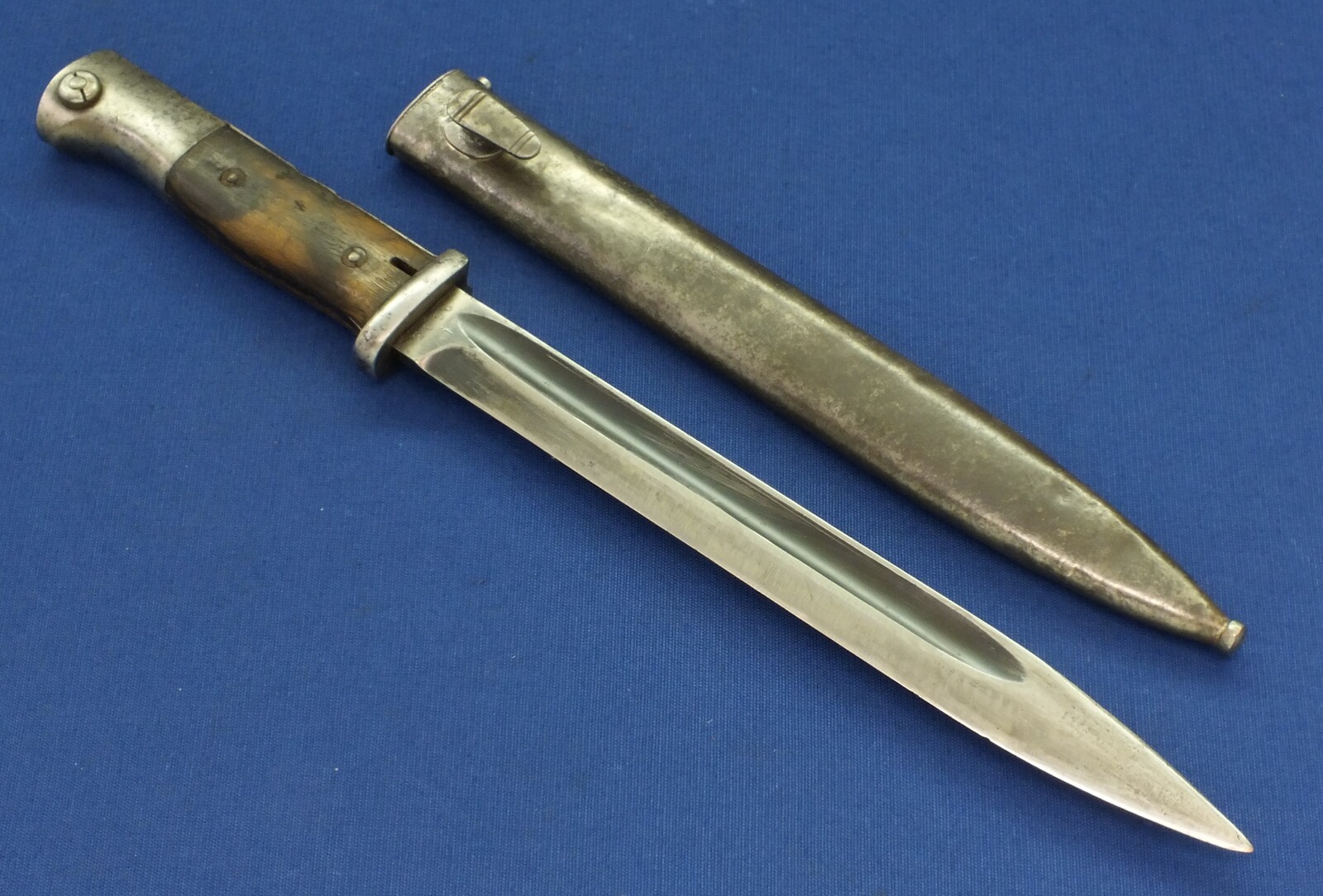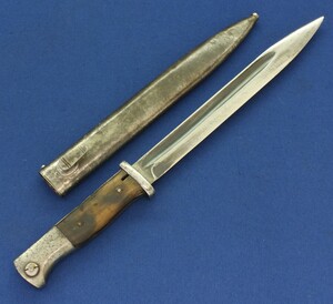A German WW2 Model 1884/98 Bayonet dated 1938. Bayonet marked Coppel Gmbh, nr. 2696 I, Scabbard marked Carl Eickhorn 1938, nr.3995 S. Waffenambt stamps WaA255 on pommel. Length 40cm. In good condition. Price 215 euro