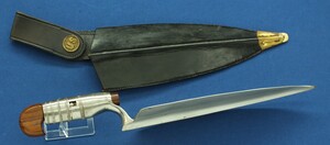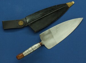 A reproduction American Rock Island Armory Springfield Model 1873 Trapdoor Rifle Trowel Bayonet with handle and scabbard. Length 44 cm. In very good condition. Price 225 euro