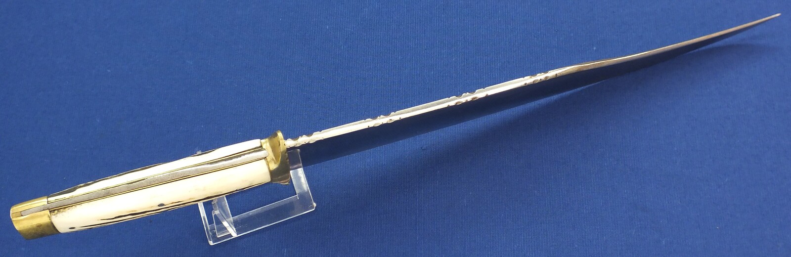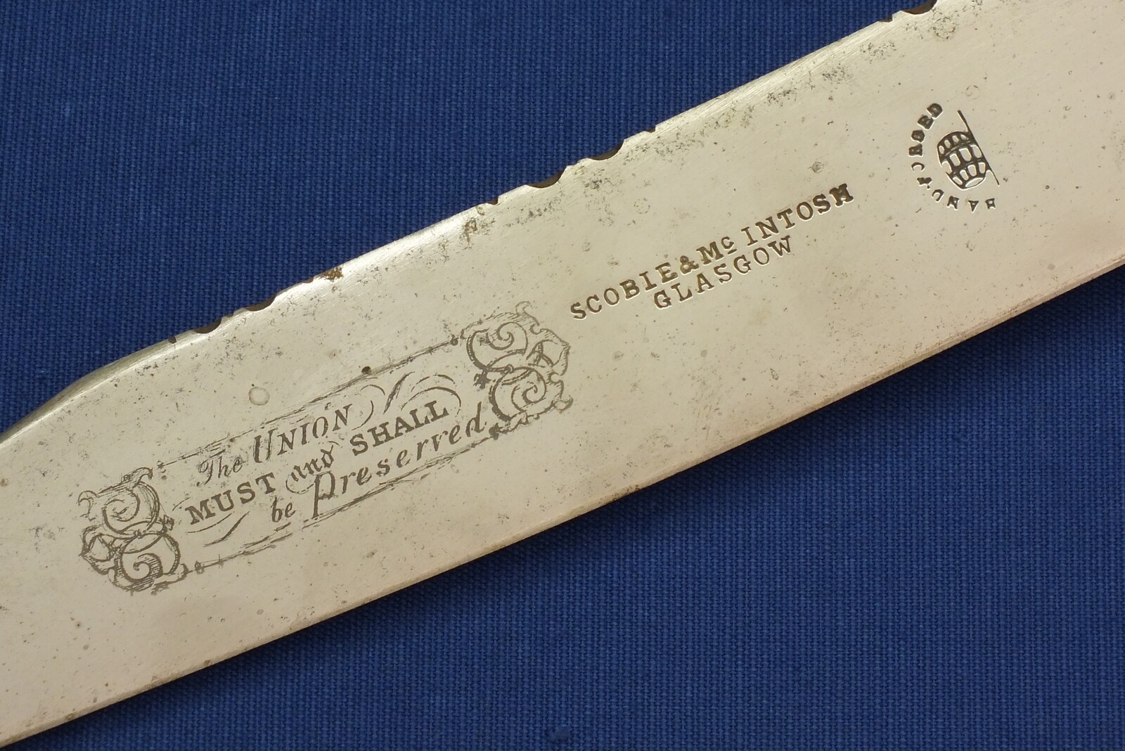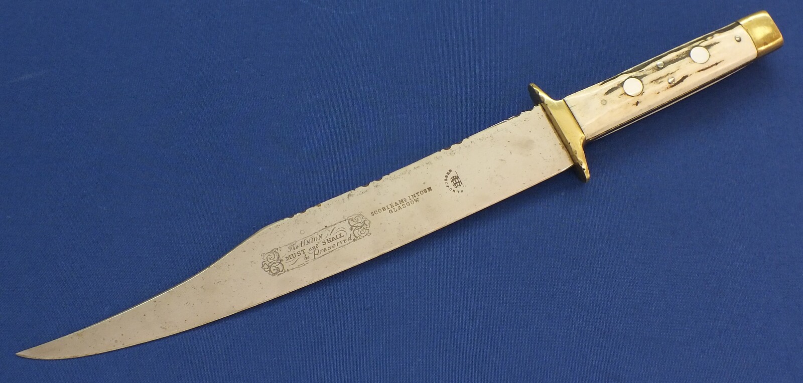 A Scottish made Bowie Knife by SCOBIE & Mc INTOSH GLASGOW. Length 49cm, blade 33cm. In very good condition. Price 695 euro.