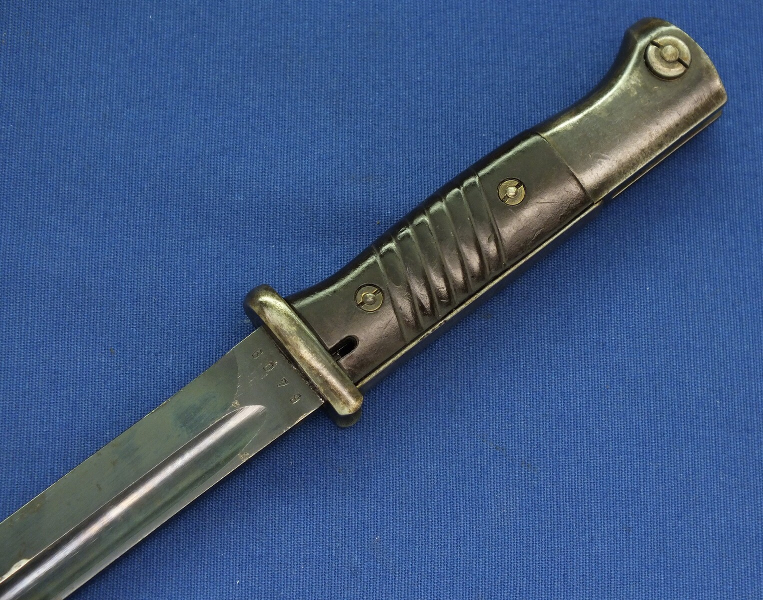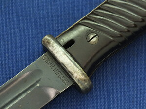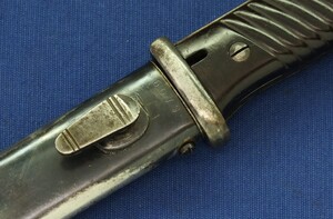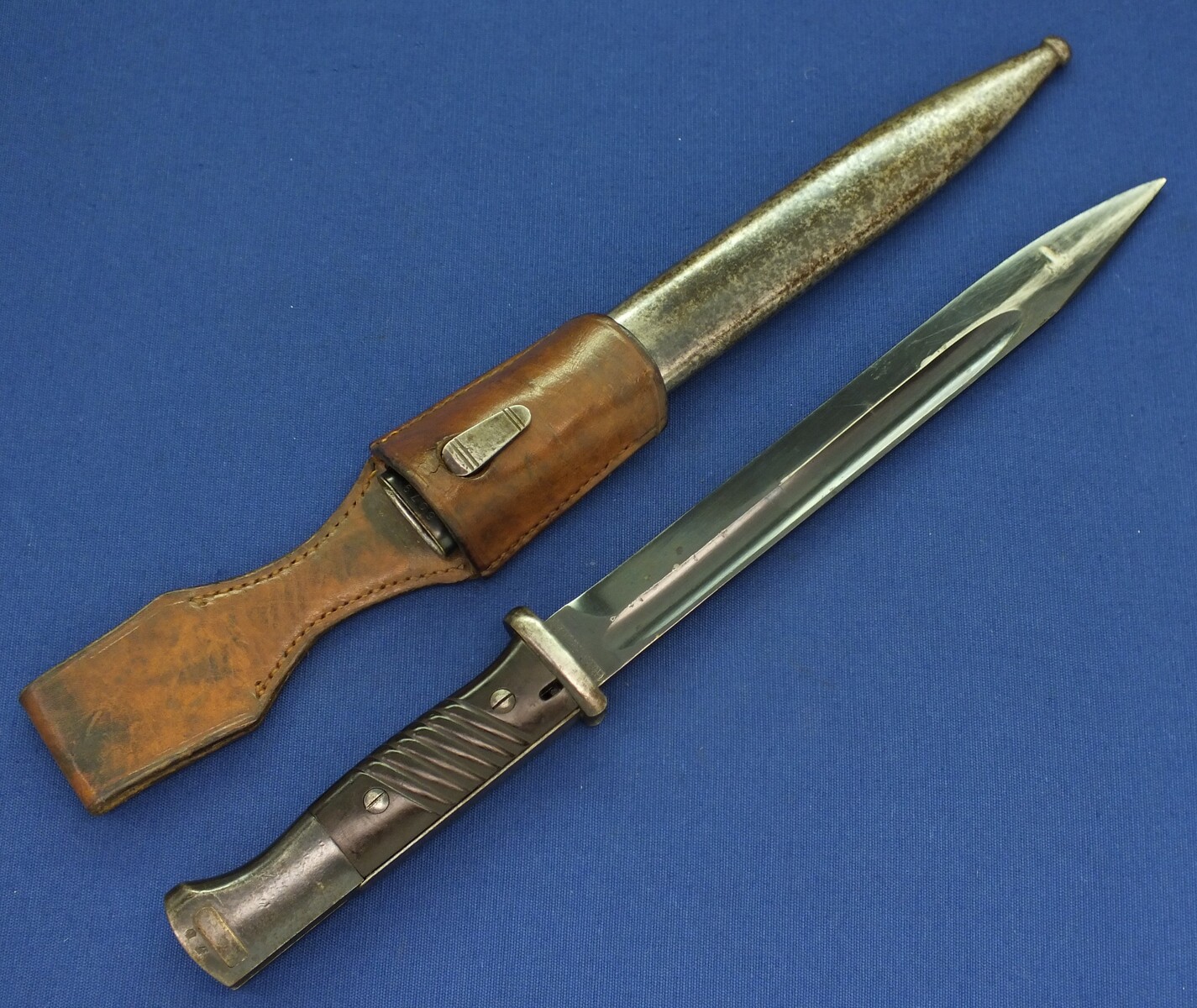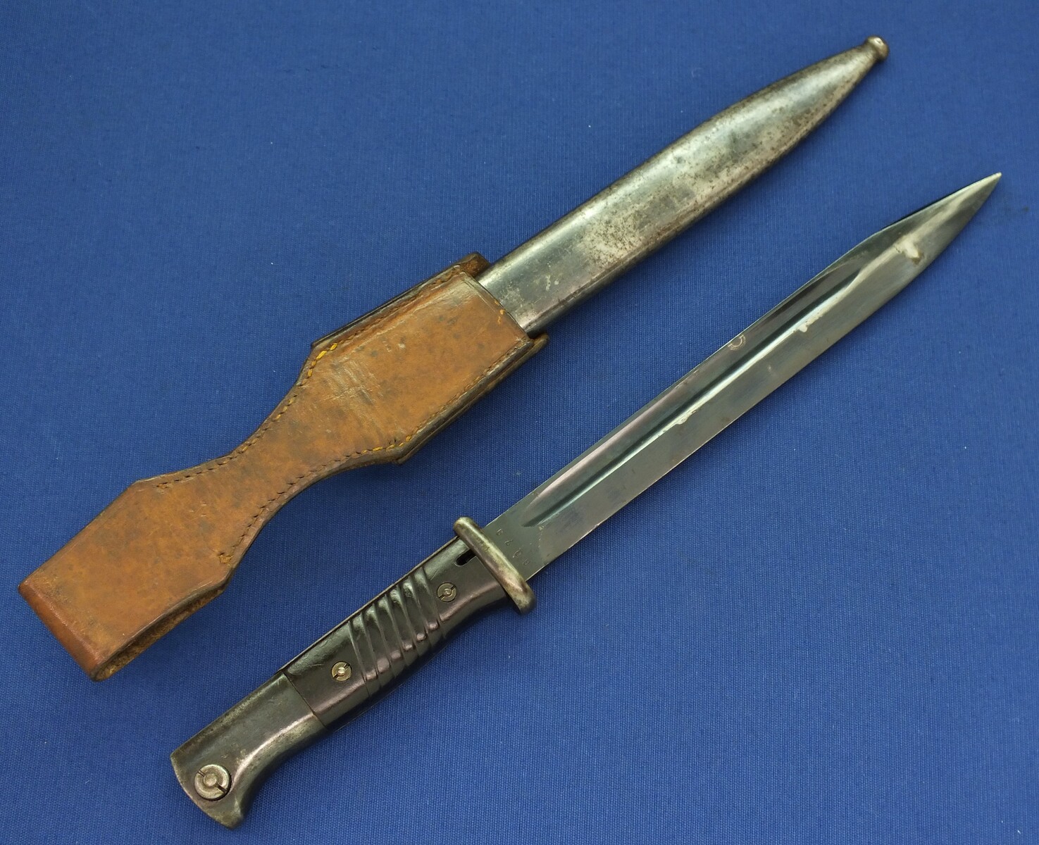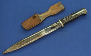 A WW2 German K98 Mauser Bayonet made by Gebruders Heller 1940 with original leather Frog and matching numbered 6079 scabbard. Length 40cm. In very good condition.