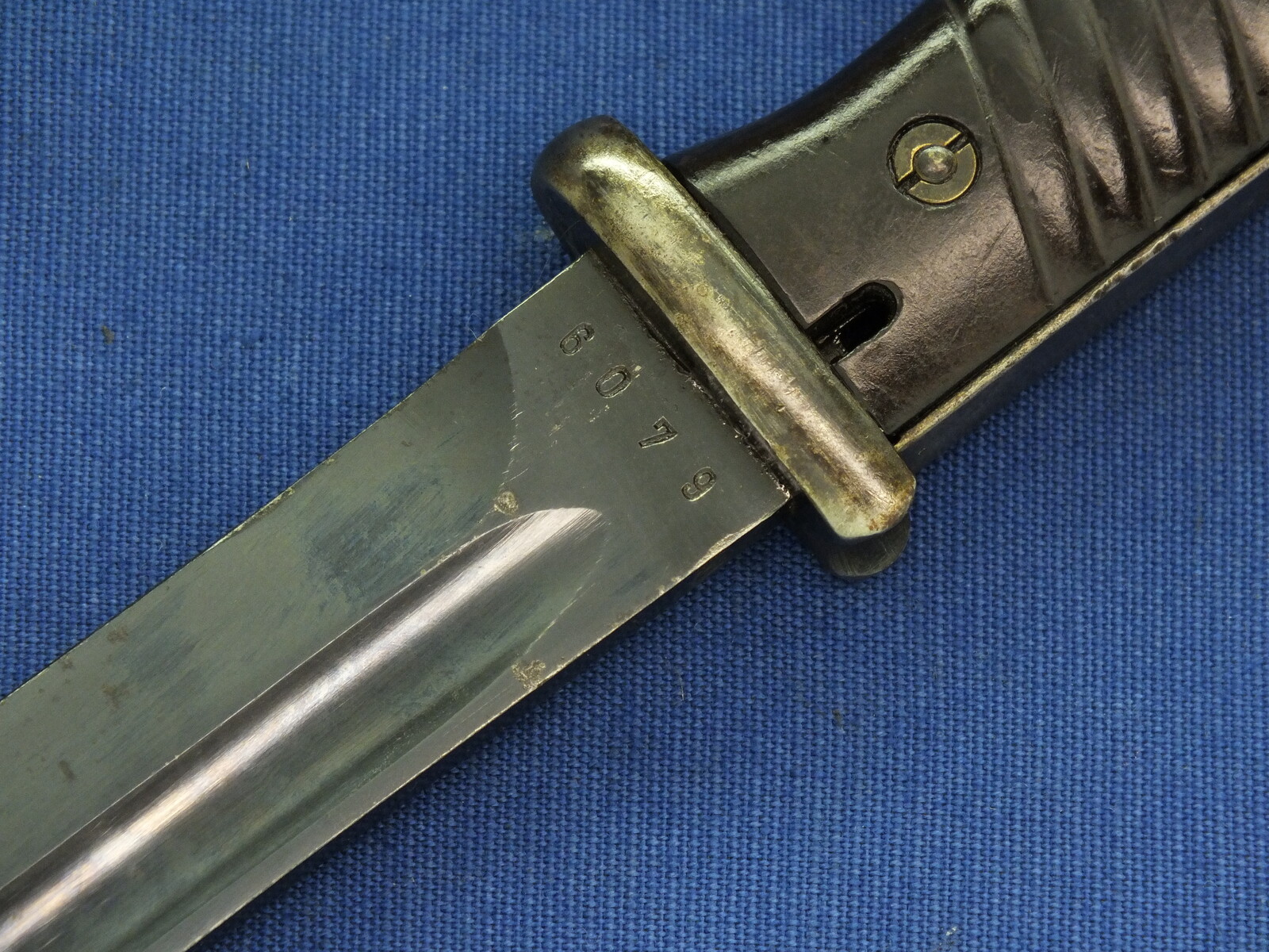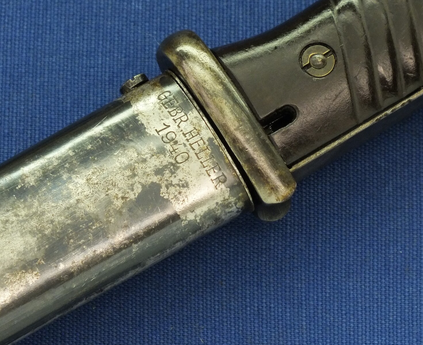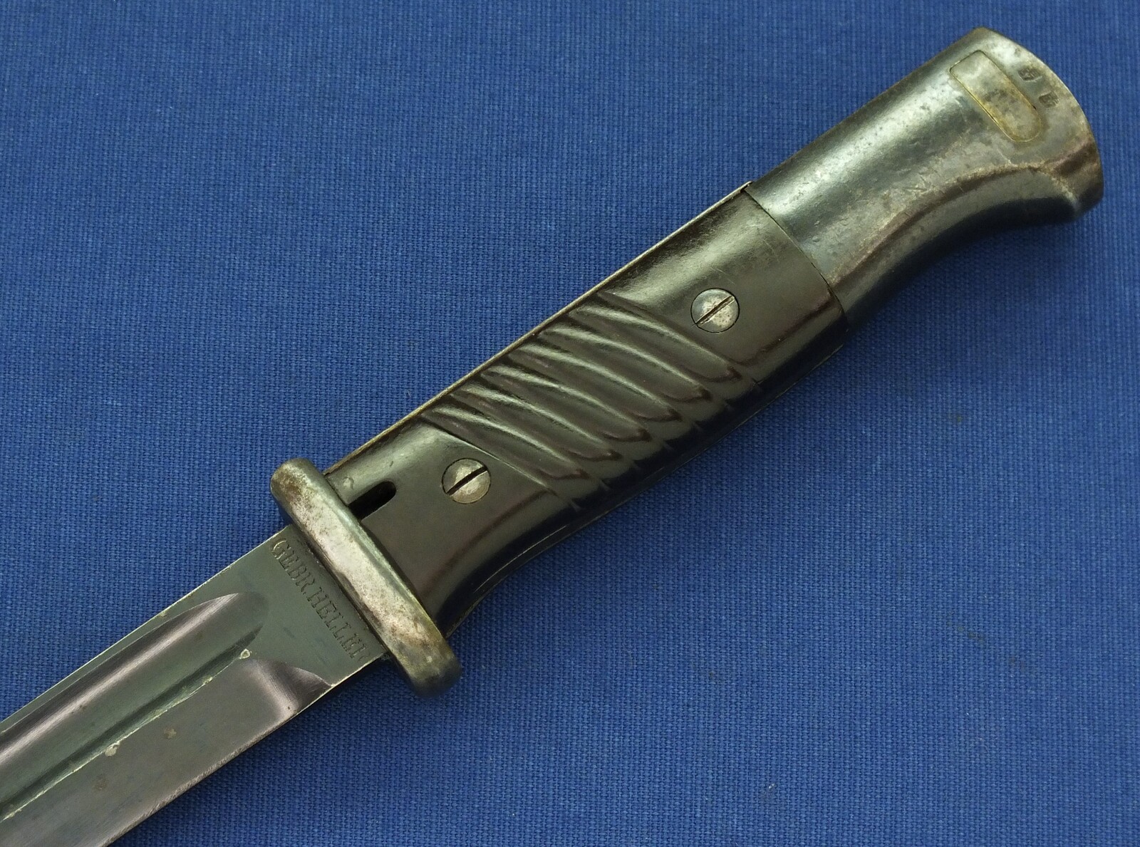 A WW2 German K98 Mauser Bayonet made by Gebruders Heller 1940 with original leather Frog and matching numbered 6079 scabbard. Length 40cm. In very good condition.