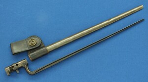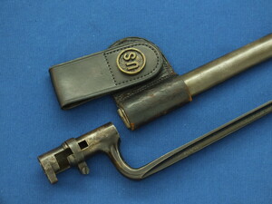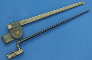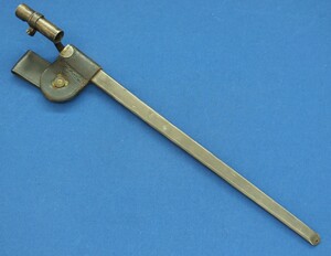 An antique American US Model 1873 Springfield Trapdoor Rifle Bayonet with original scabbard. Length 54cm. In very good condition