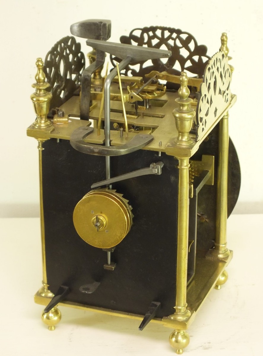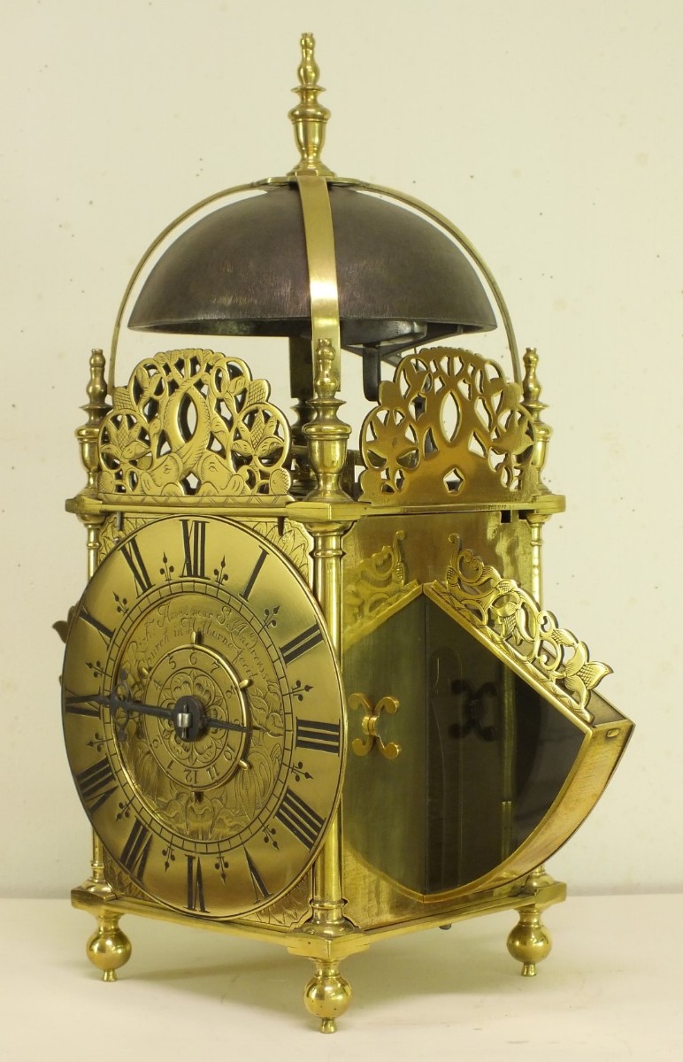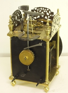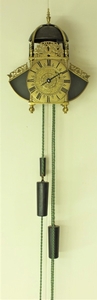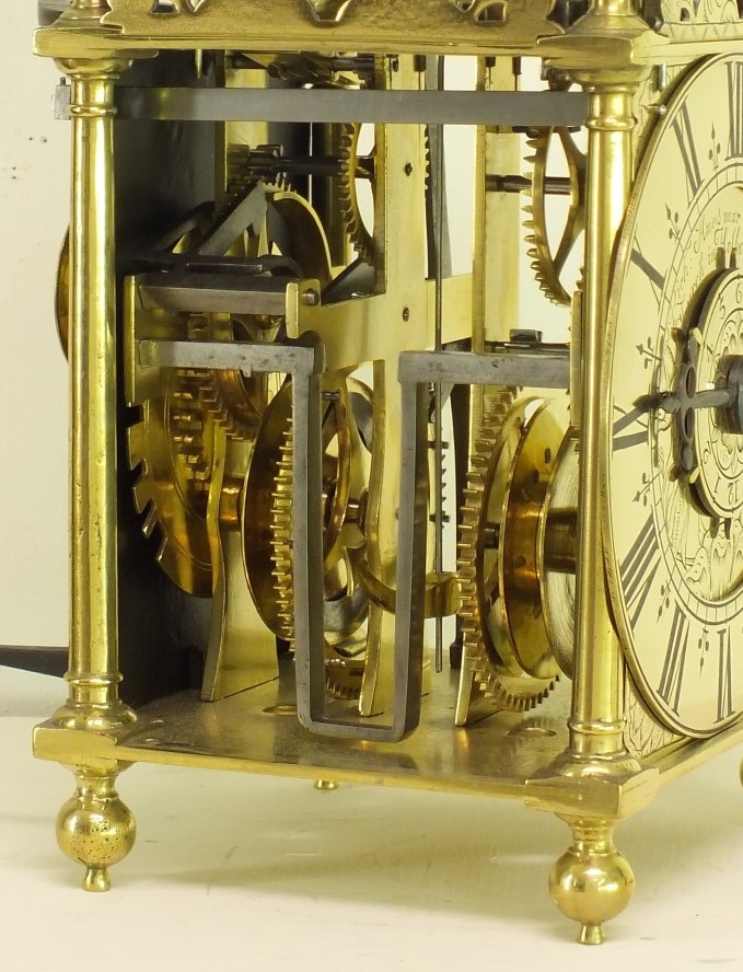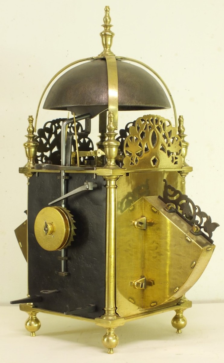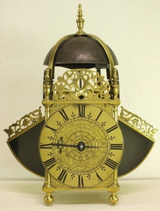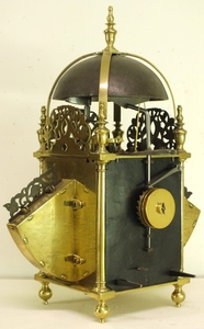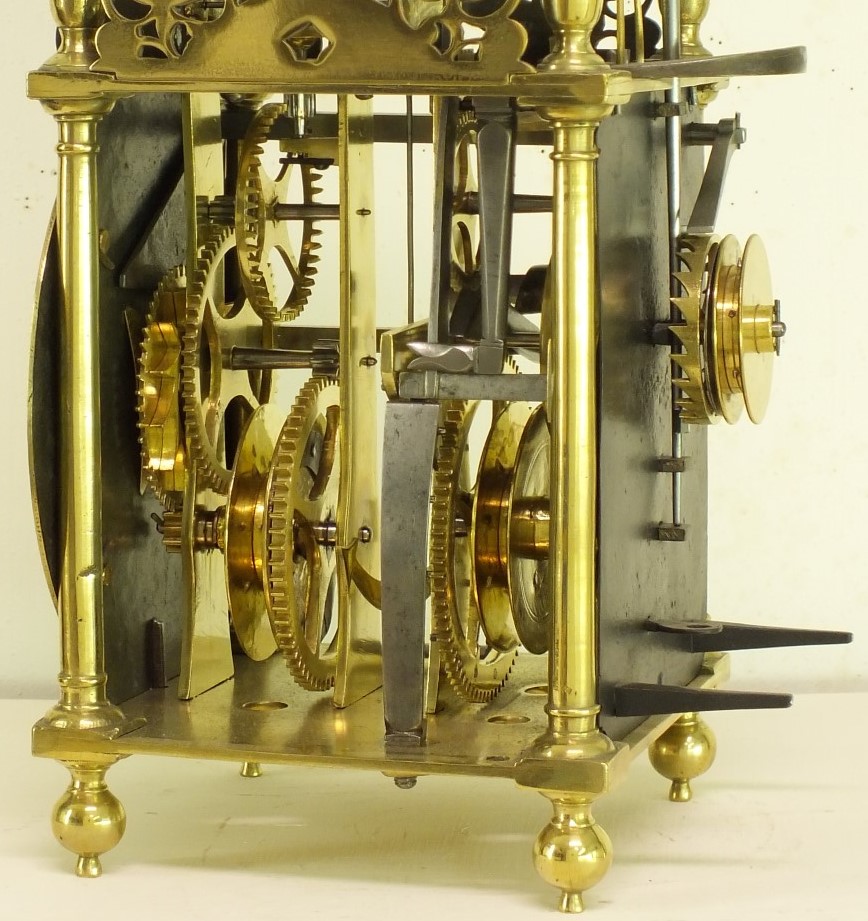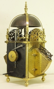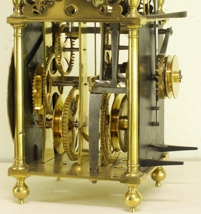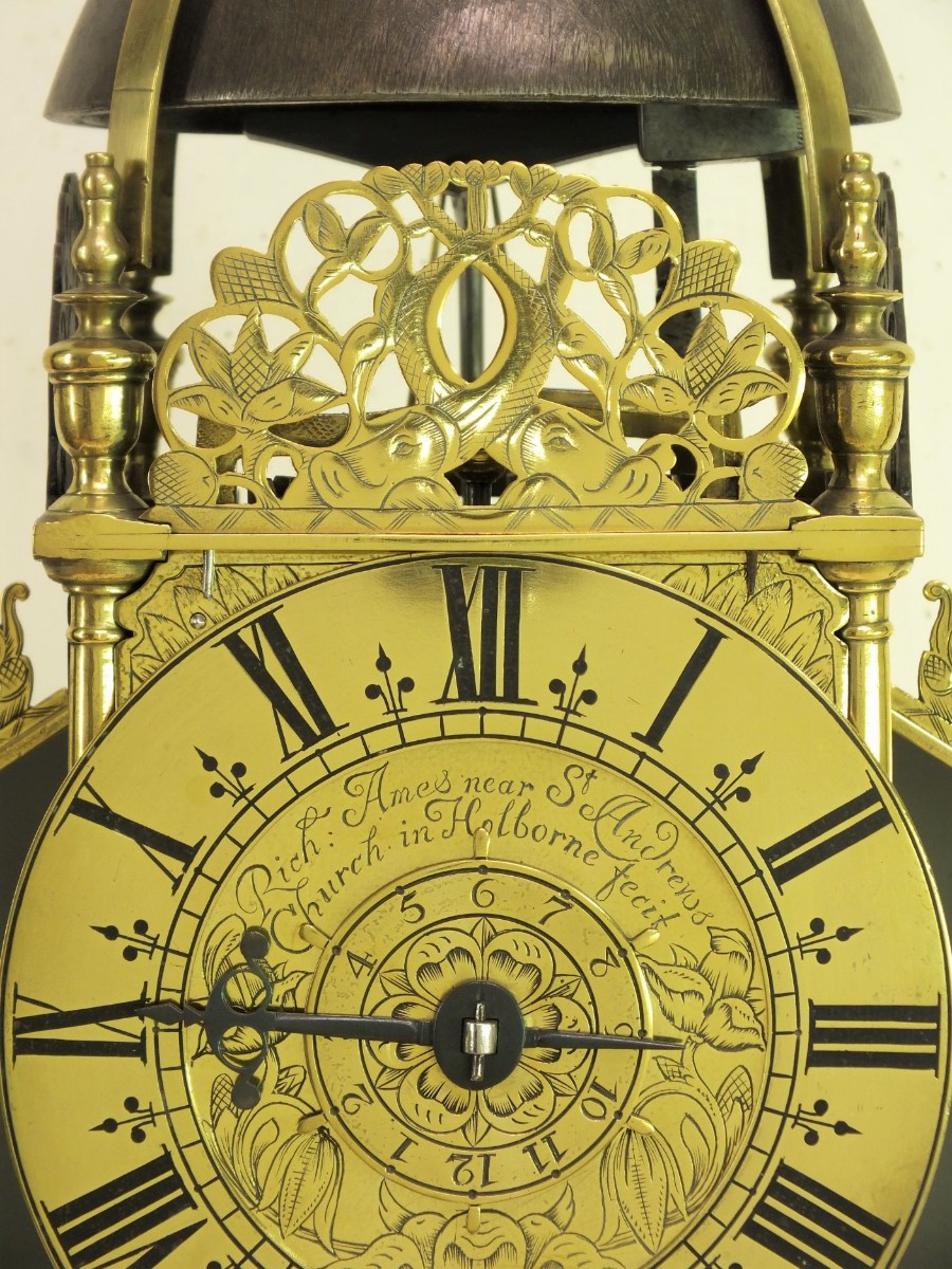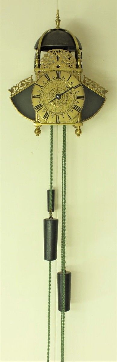 A very early type by Richard Ames with two weights for going and striking train simmilar as with Balance lantern clocks. The striking train has the typical Ames number of teeth on it's wheels.
