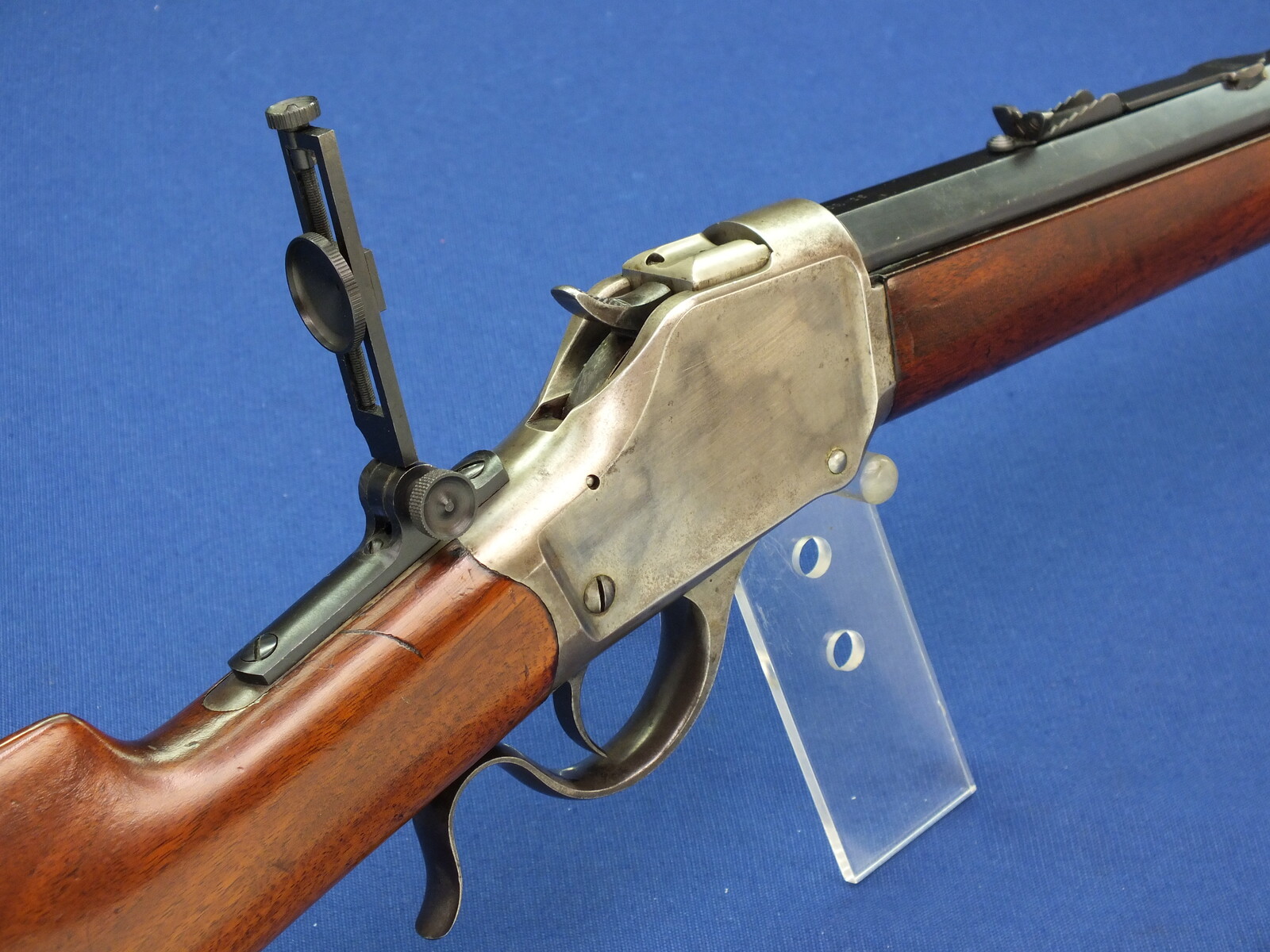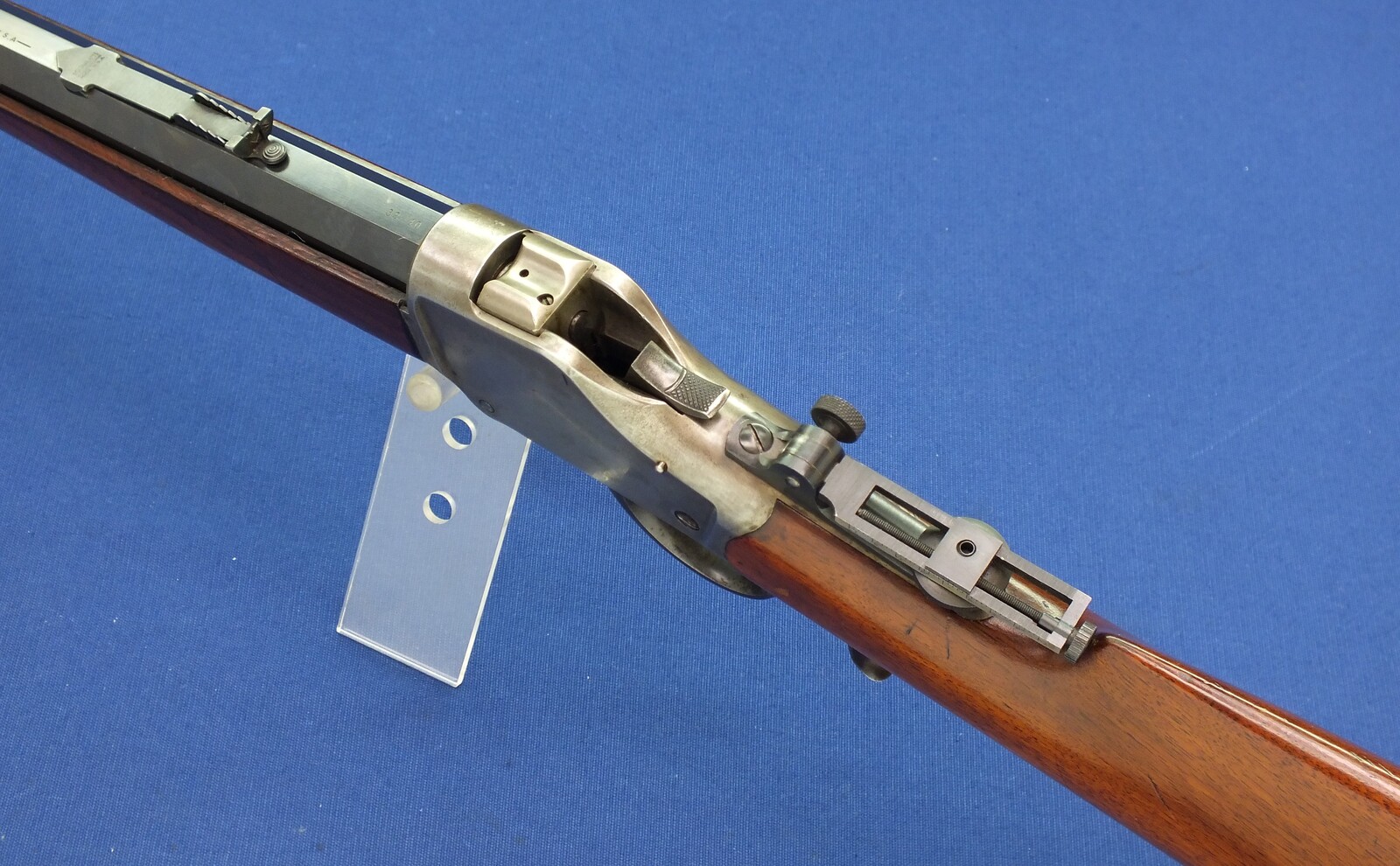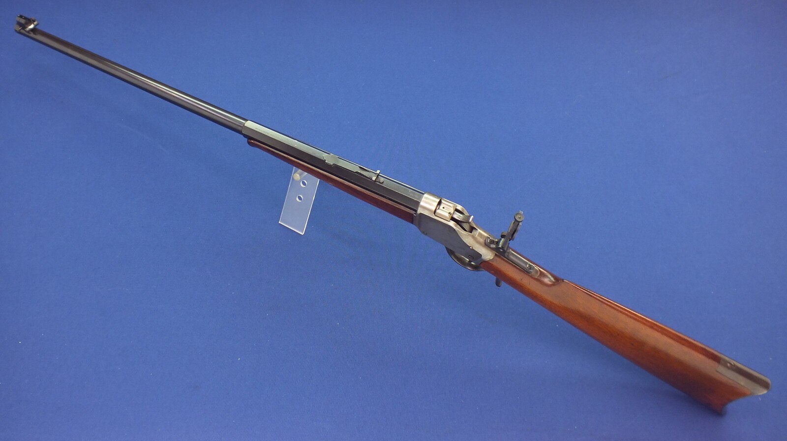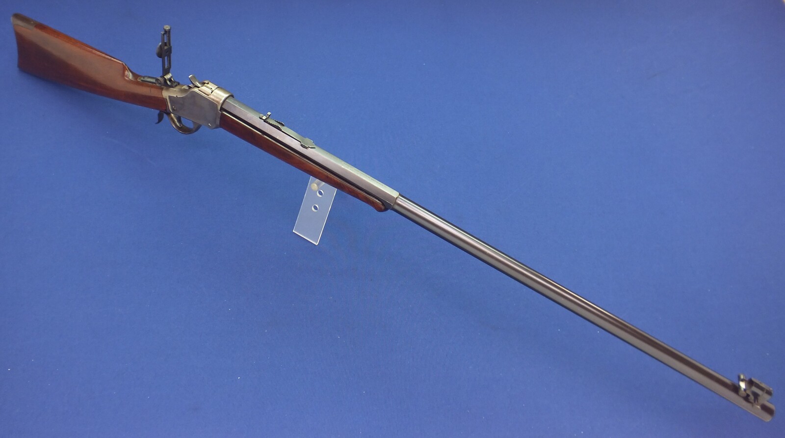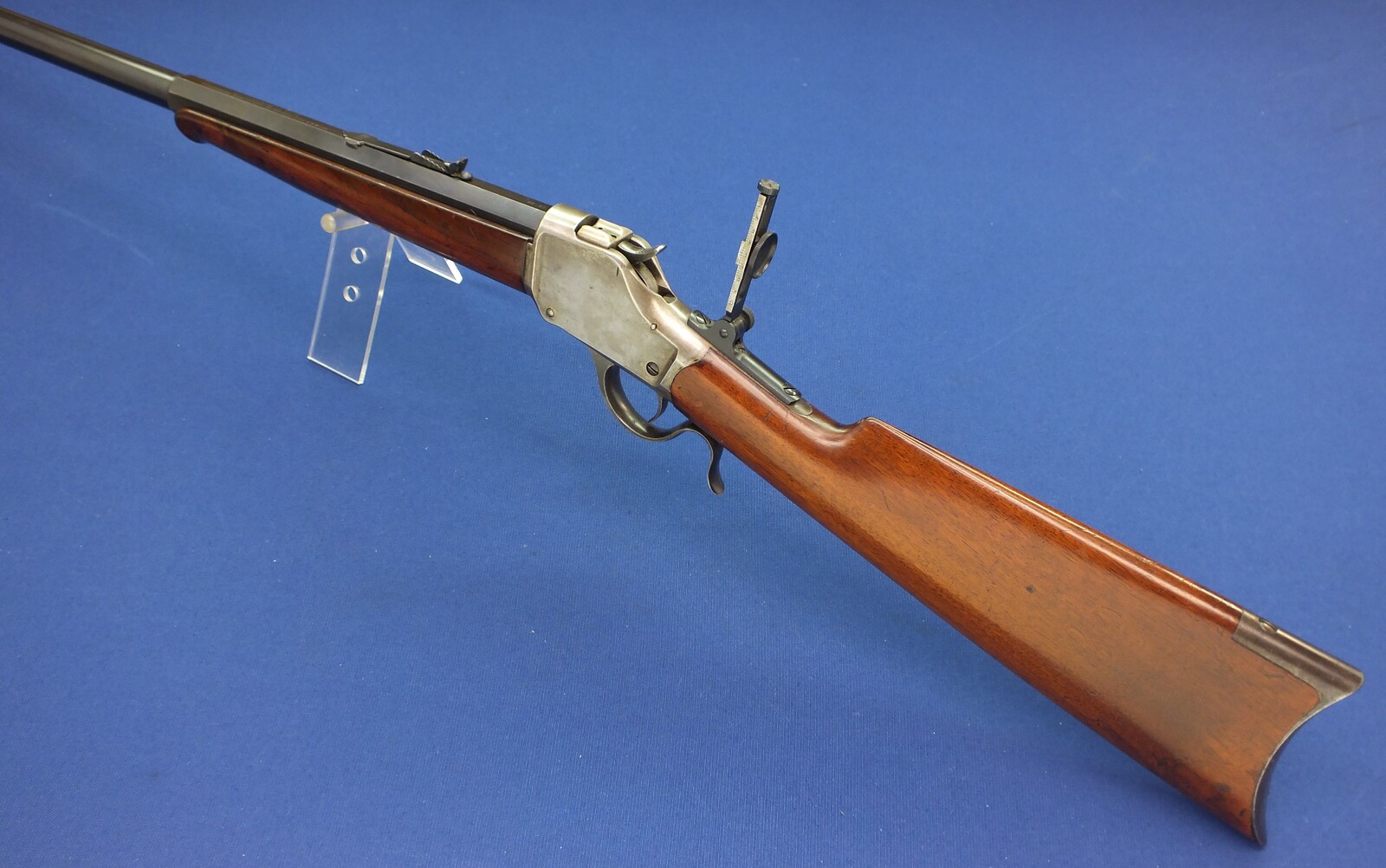 SN 30731. Lot of original blue with clear address and caliber. Reproduction graduated rear sight. Rests case hardening on the frame. Fine stock in original finish.