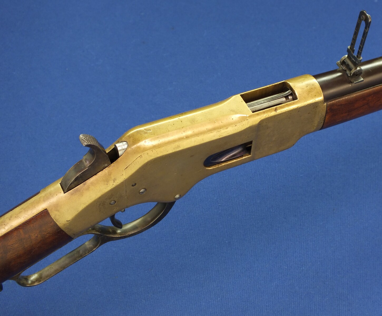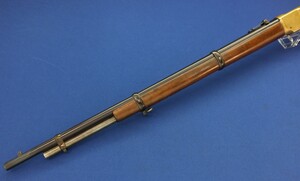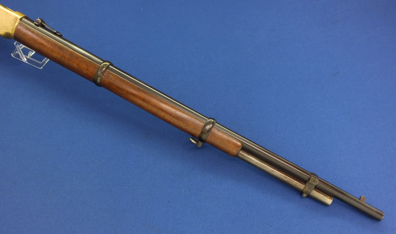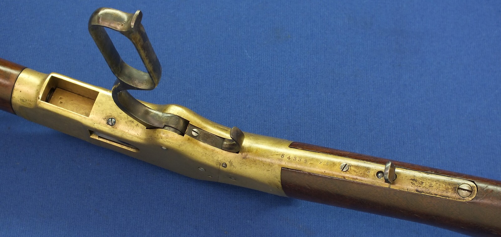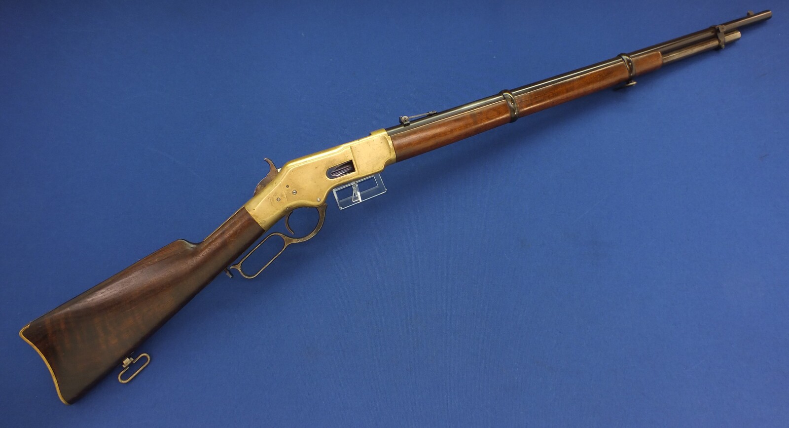 A rare antique American Winchester Model 1866 Yellow Boy Musket with Saber Bayonet fitting. 27 inch barrel with clear address. Caliber 44 Henry Rimfire. Length 116cm. In very good condition.