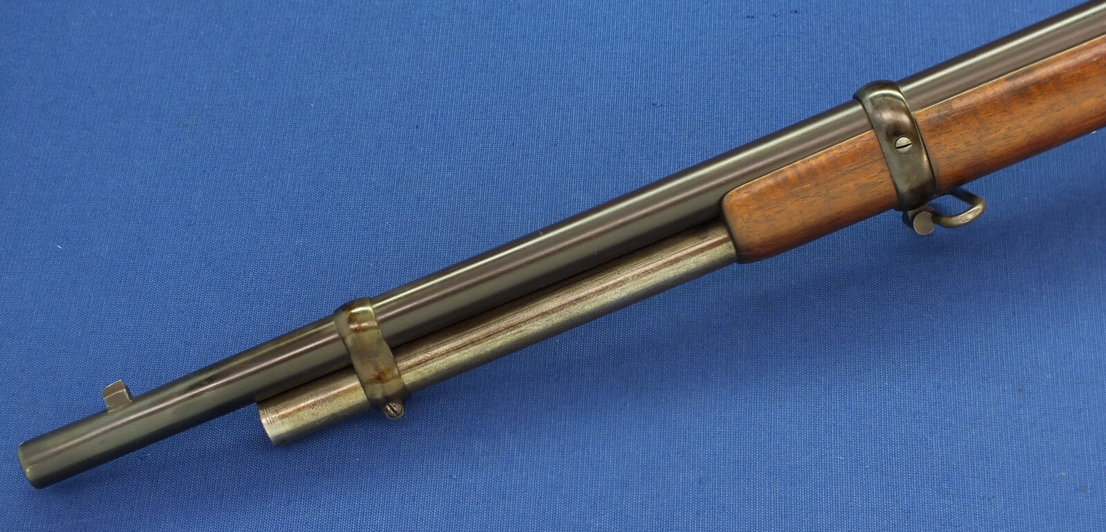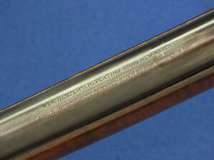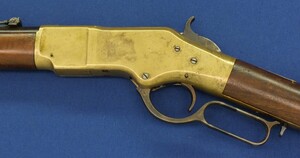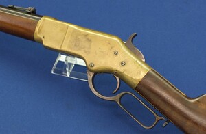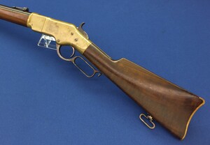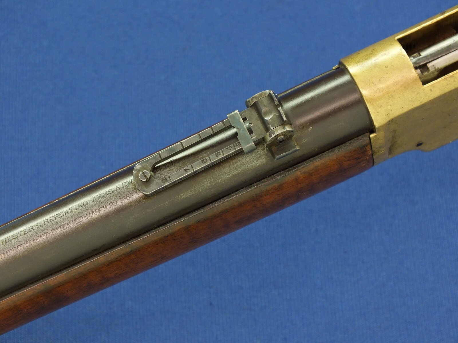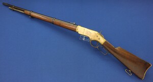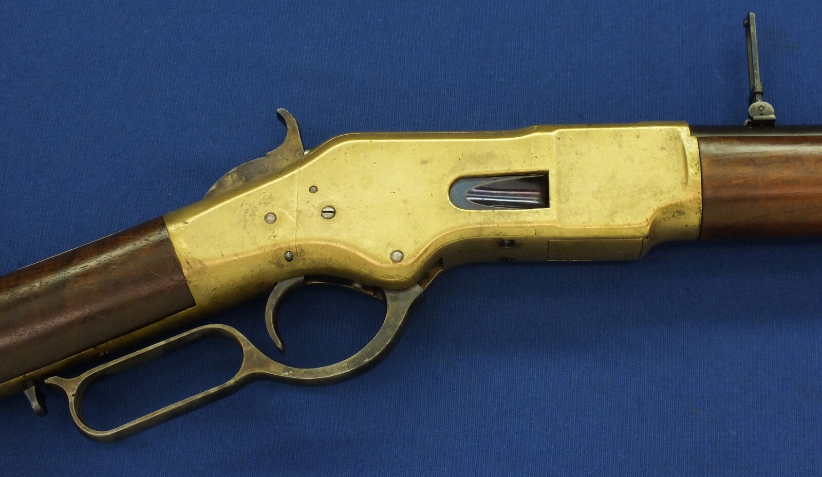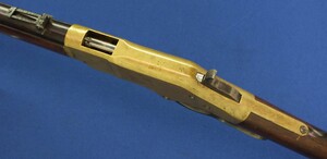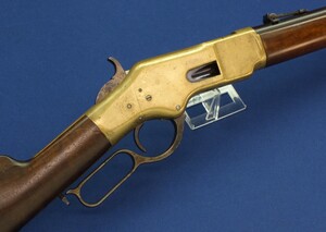 A rare antique American Winchester Model 1866 Yellow Boy Musket with Saber Bayonet fitting. 27 inch barrel with clear address. Caliber 44 Henry Rimfire. Length 116cm. In very good condition.