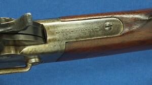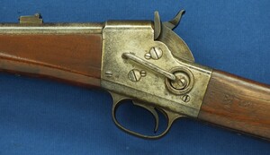 A scarce antique American martially marked US Contract Remington Single Shot Breech-loading "Splitbreech" Carbine Type II. Caliber 50 Rimfire. 20 inch barrel. Length 87cm. In very good condition. Price 3.650 euro.
