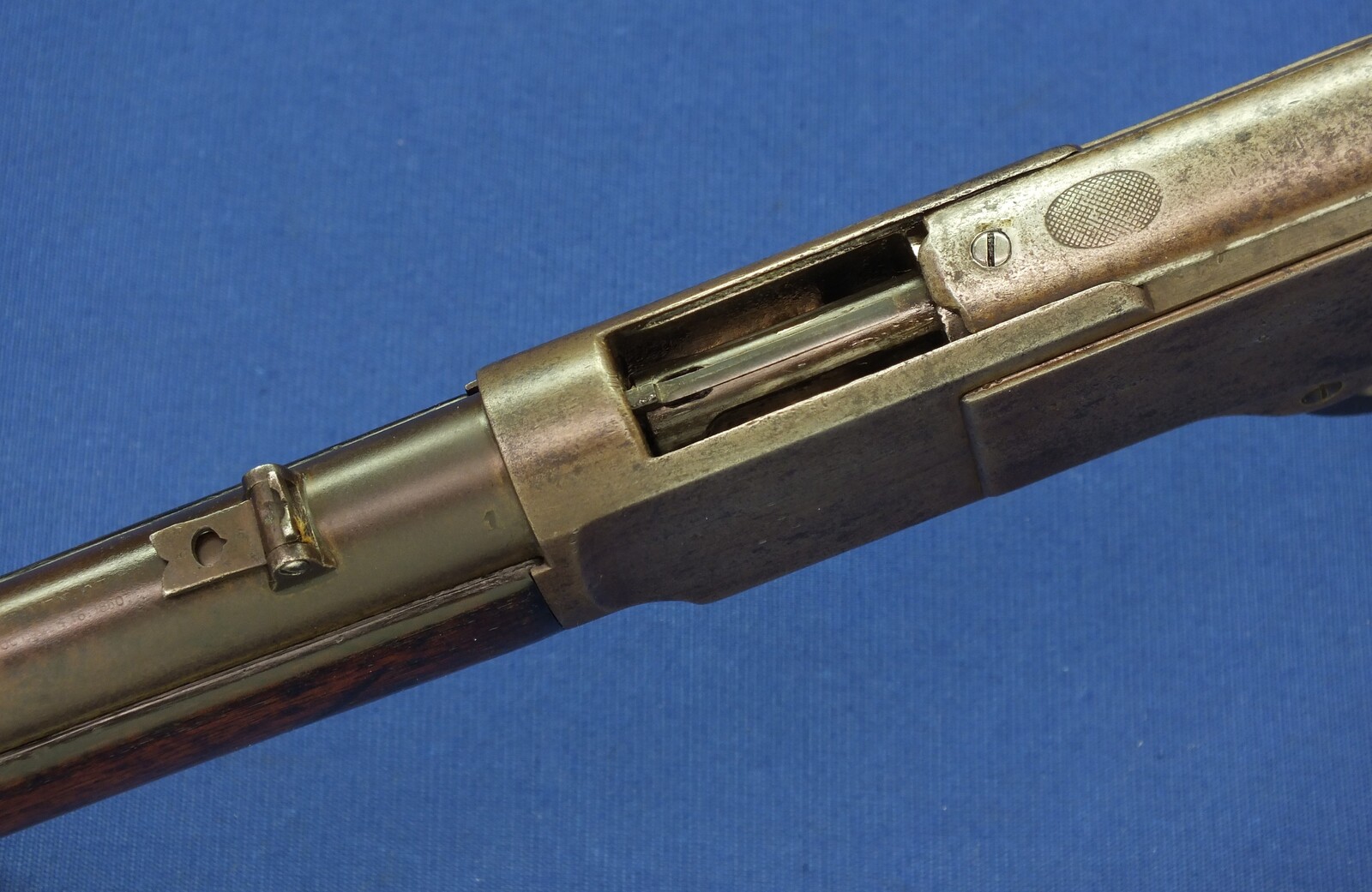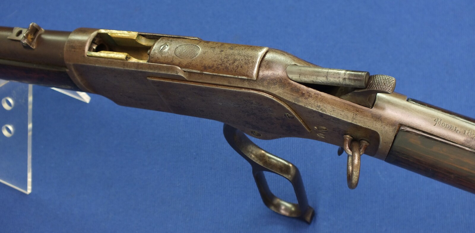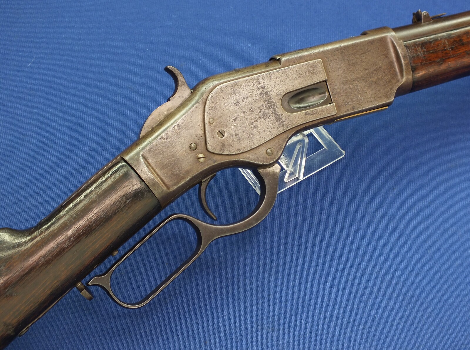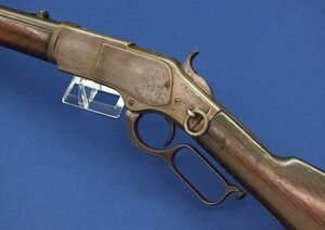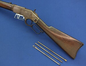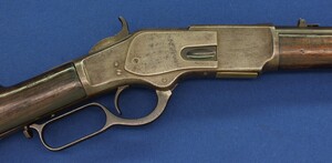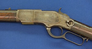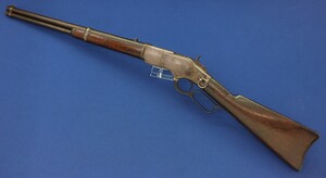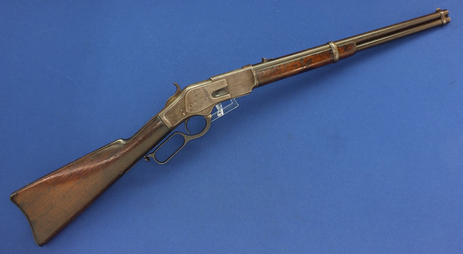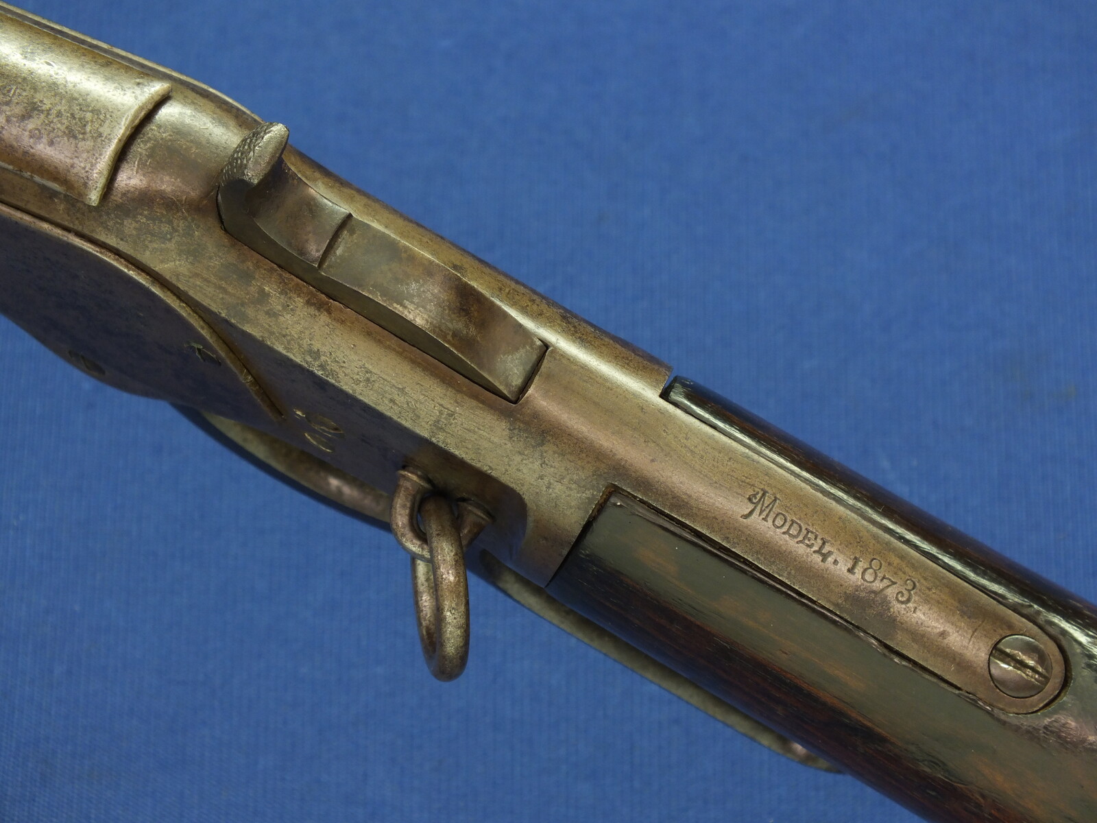 A scarce antique American Winchester first Model 1873 Saddle Ring Carbine with original cleaning rods. Caliber 44-40. 20 inch barrel with clear address. Made 1878. Length 99cm. In very good condition.