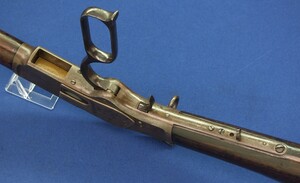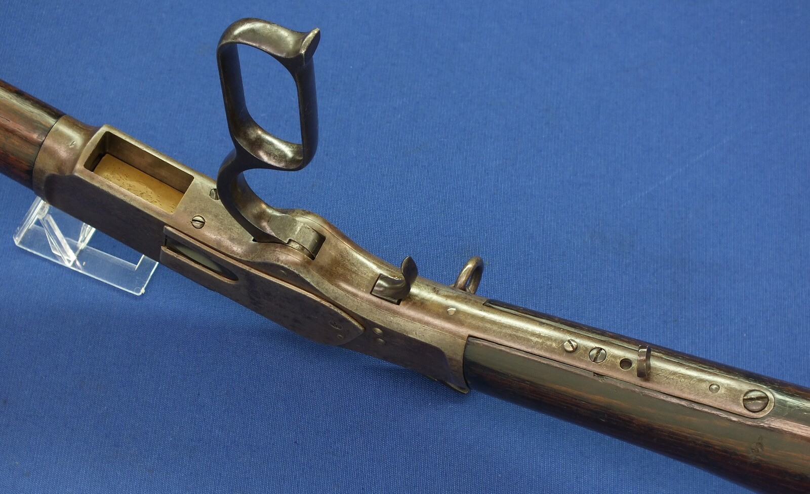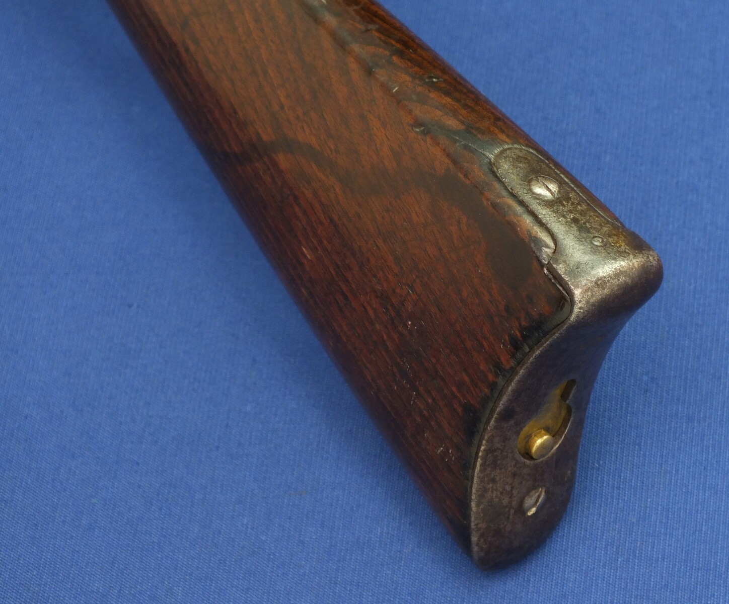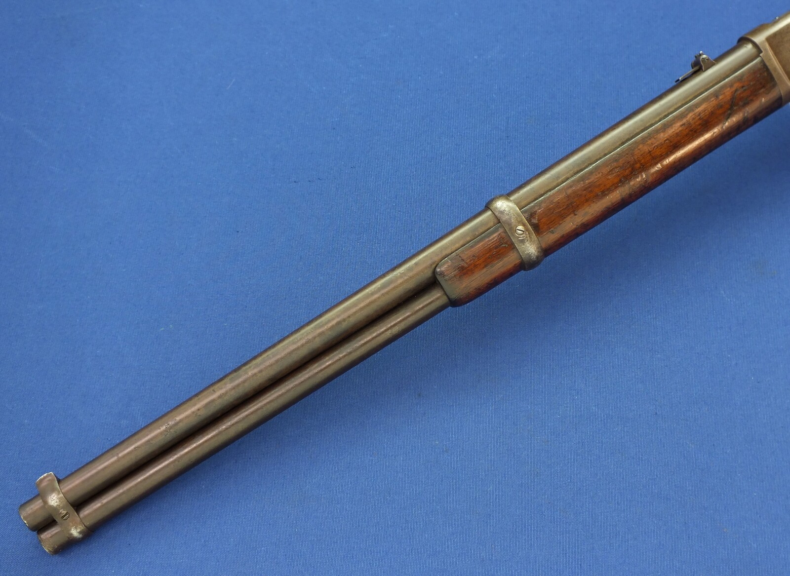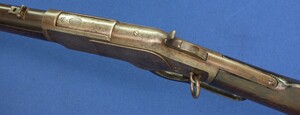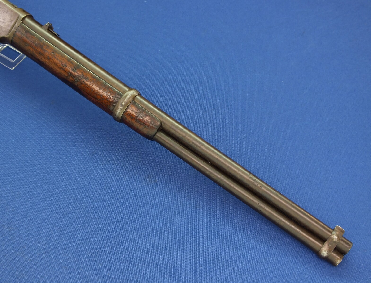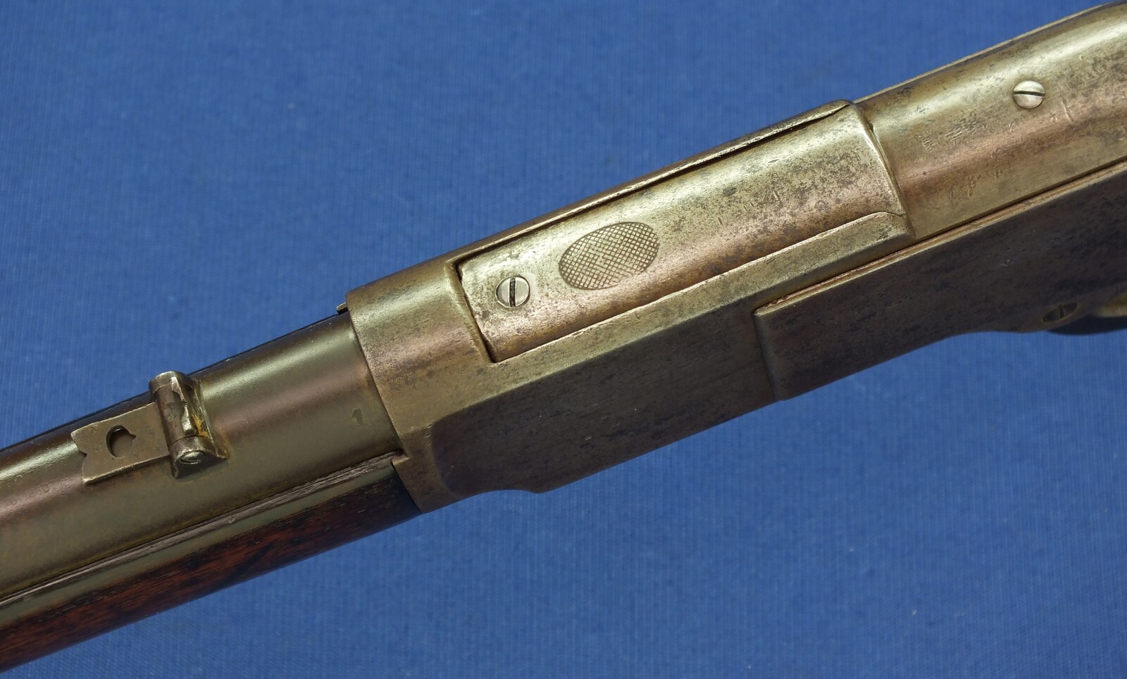 A scarce antique American Winchester first Model 1873 Saddle Ring Carbine with original cleaning rods. Caliber 44-40. 20 inch barrel with clear address. Made 1878. Length 99cm. In very good condition.
