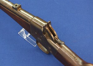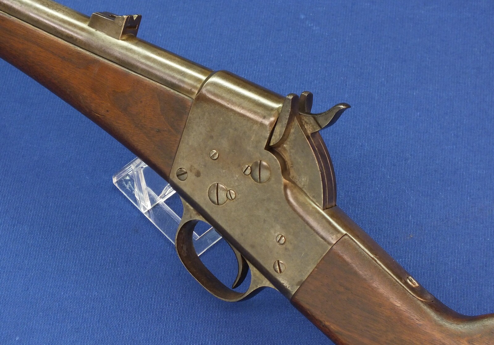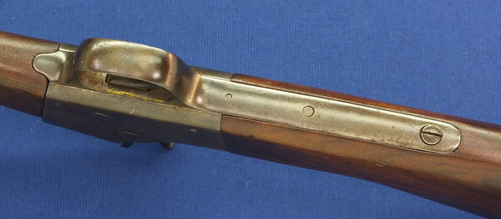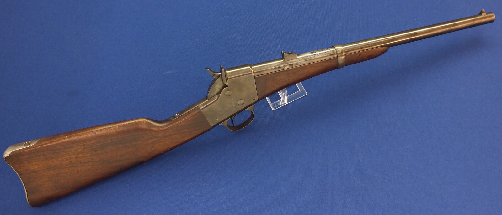An antique American commercial Remington Type III Single shot Split Breech Loading Carbine. Caliber 50 Rimfire, 20 inch barrel. Length 87cm. In very good condition. Price 1.500 euro.