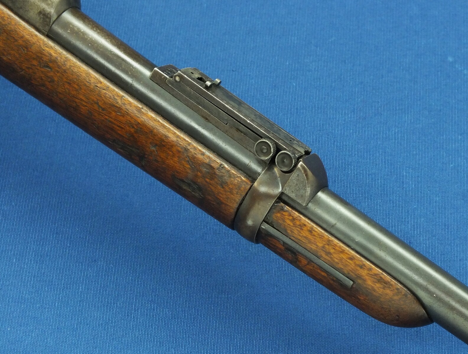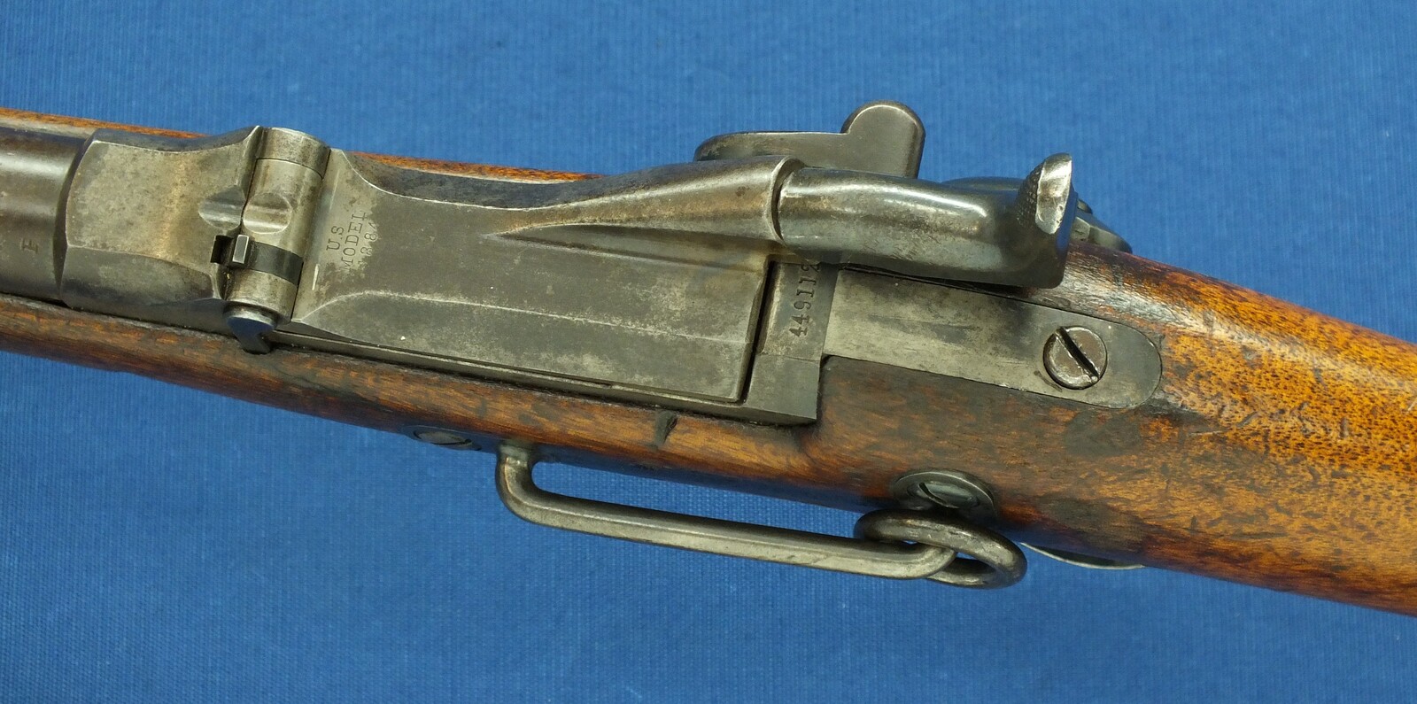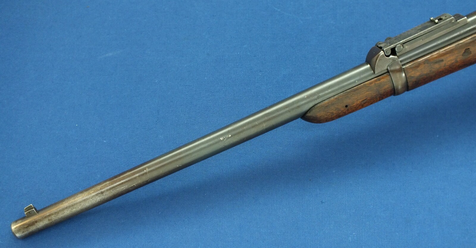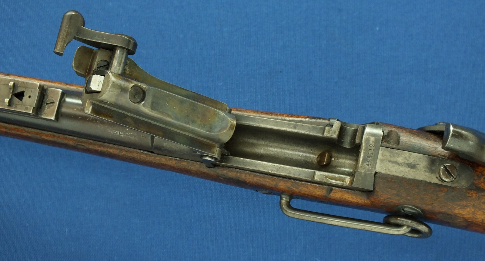 SN449112. A lott of original blue finish present. With government alternation of Front Sight cover and special protector barrel band