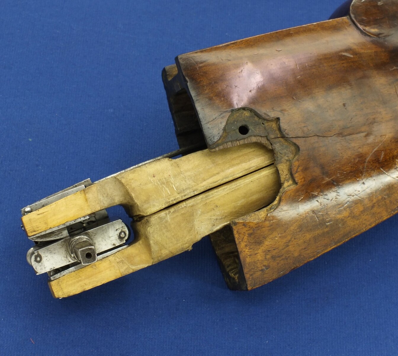 Fine original blue barrel. All the brass mounts fine flower engraved with rests of gilding. Set triggers. Diopter. Fine carved root wood stock in original finish. A Maroc leather Case monogrammed "HB" with perfect made tools and darts-tubes. Also together with some other tools.