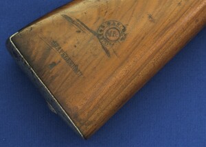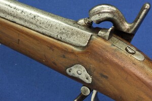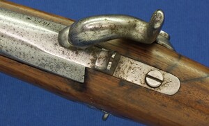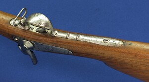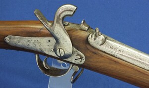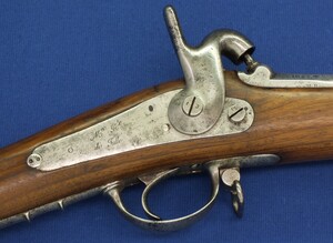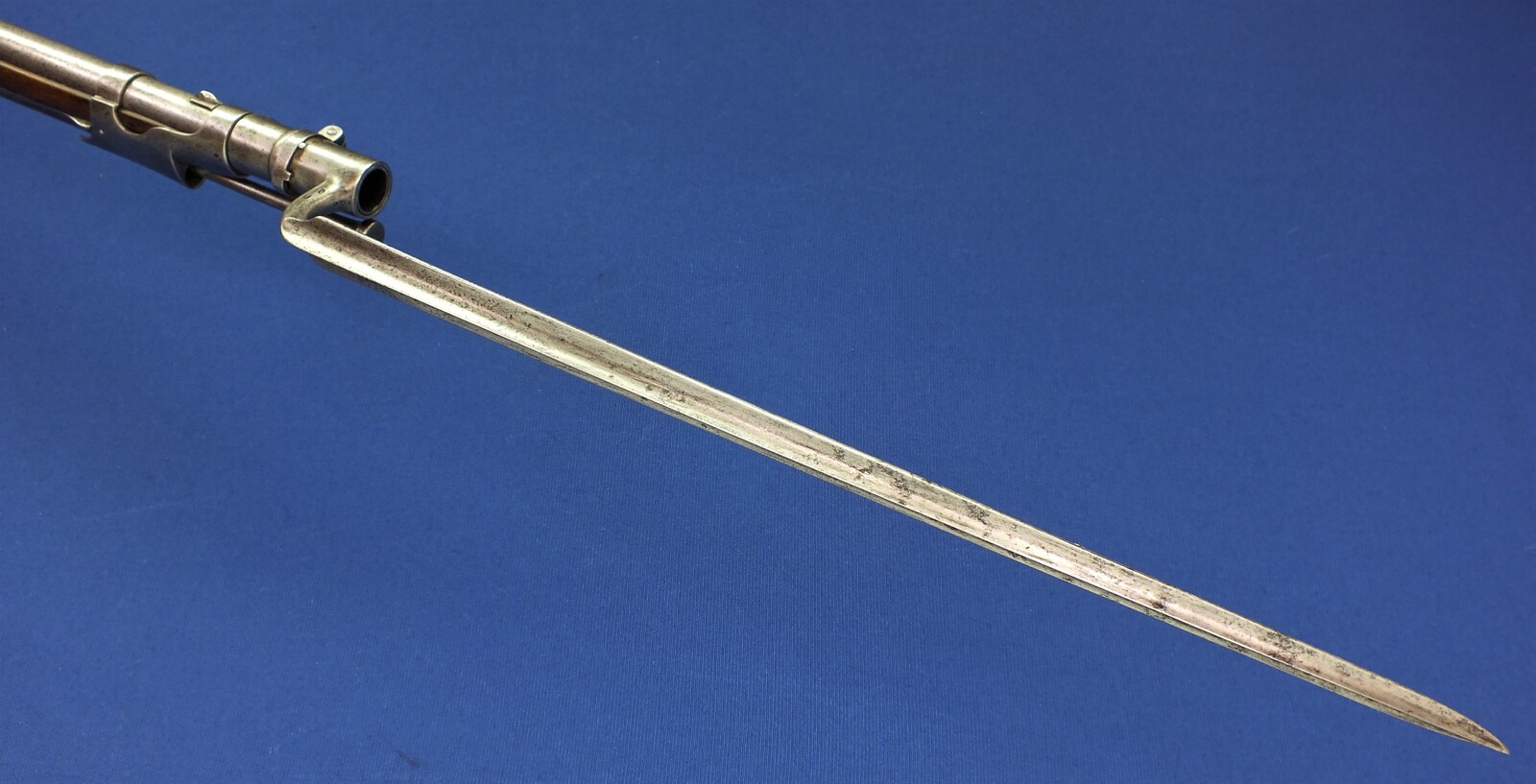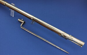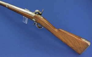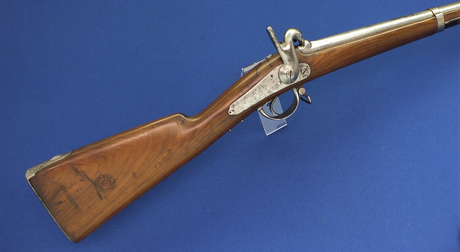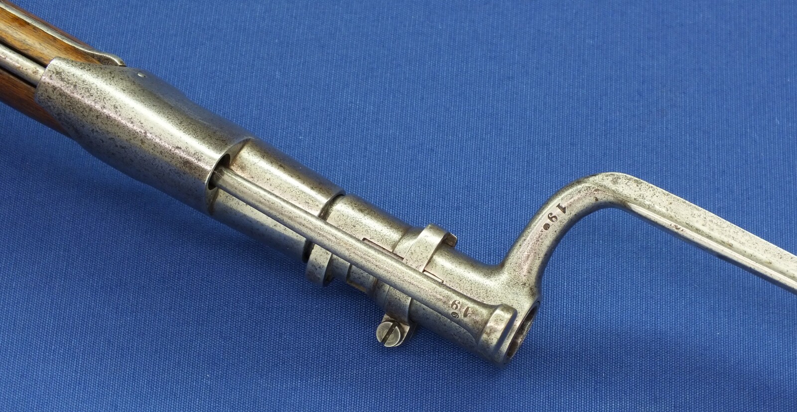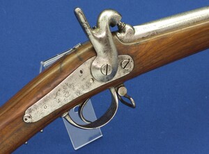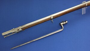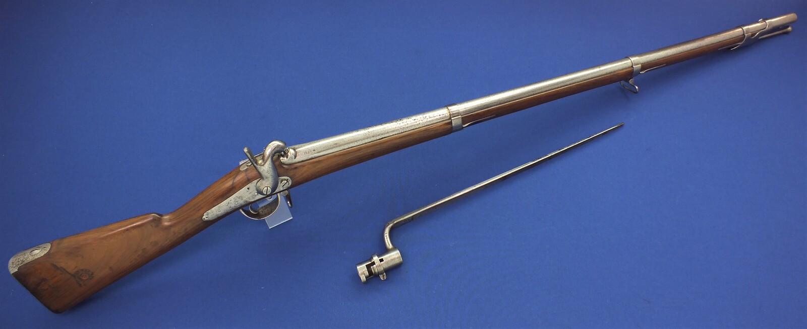 A very nice antique French military infantry Rifle model 1842 with match numbered ramrod and Bayonet. Manufacture Royal de Tulle signed Lock. Length 142cm, Caliber 18mm. In very good condition.