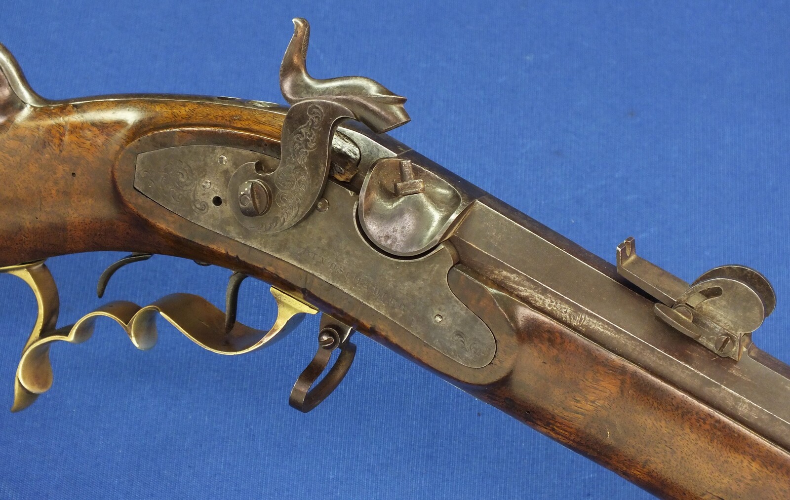 An antique Swiss Percussion Stutzer/Target Rifle. Lock Signed Bindschädler (Zürich 1850), 91cm Octagon barrel Signed Pfenninger Staefa(Stäfa). Caliber 10,5mm. Length 129cm. In very good condition. Price 1.250 euro.
