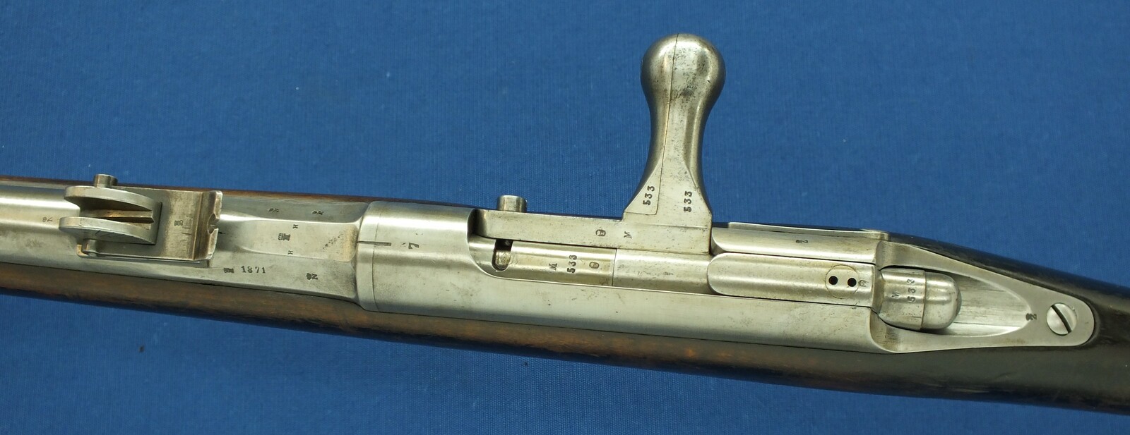 An rare antique Dutch Beuamont Rifle Model 1871. Caliber 11mm. Stock marked KS for Kamerschietoefening. Length 132,5cm. In very good condition. Price 1.500 euro.