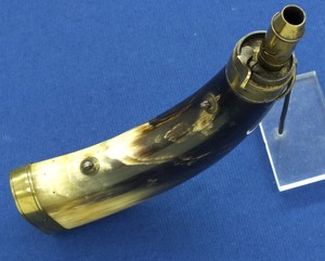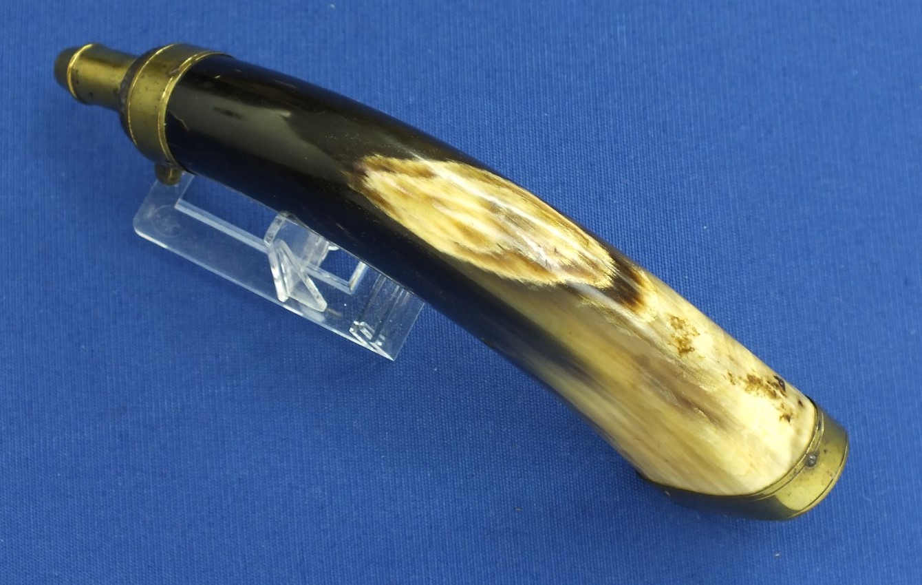 A fine antique 19th century Powder Horn with Brass Mounts, length 21,5 cm. In very good condition. Price 220 euro
