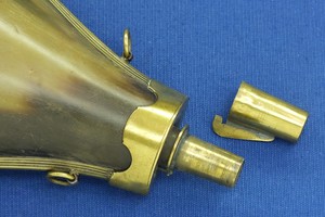 A fine antique Powderflask of green horn with Brass mounts, circa 1800. height 18 cm, in very good condition. Price 250 euro