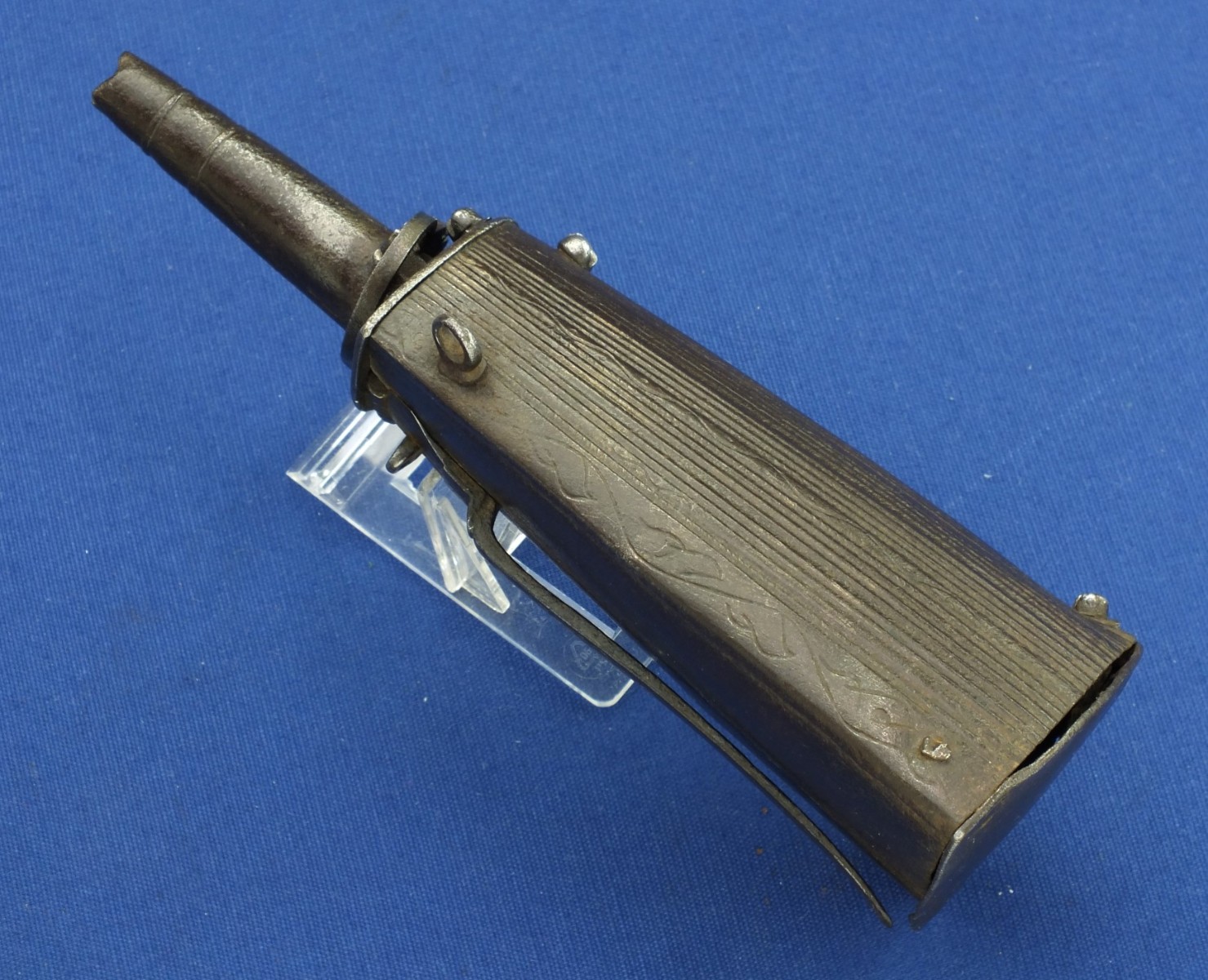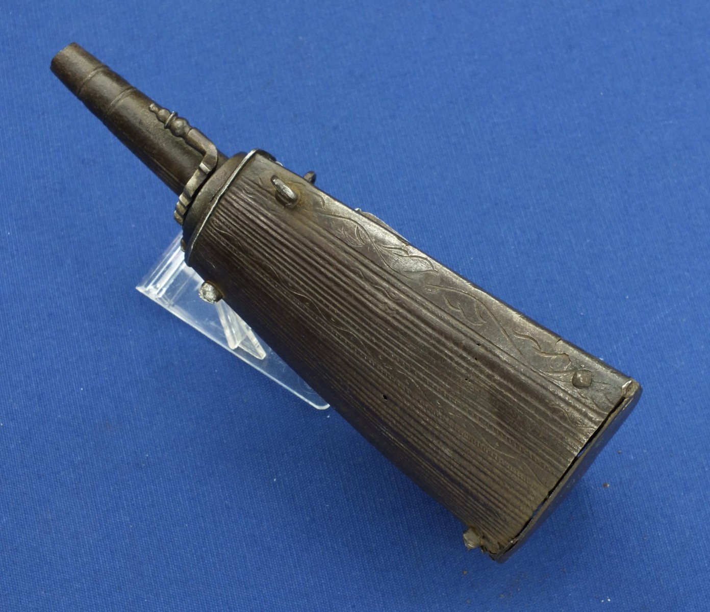 A very nice and scarce Italian (Brescian) Iron Powderflask with a Belthook, circa 1600, height 19,5 cm, in very good condition. Price 1.500 euro