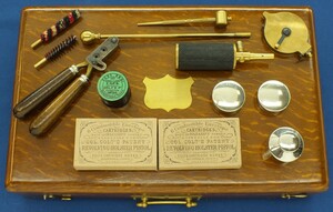 A Vintage/antique Oak case refitted and relined red interior made to fit Colt Single Action Army Percussion Revolver. 41x26x9cm. In very good condition.
