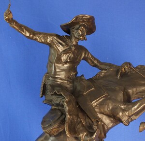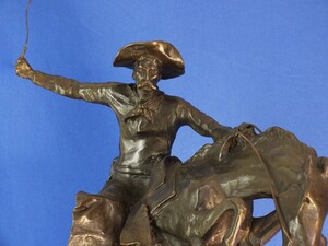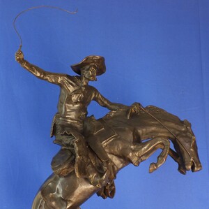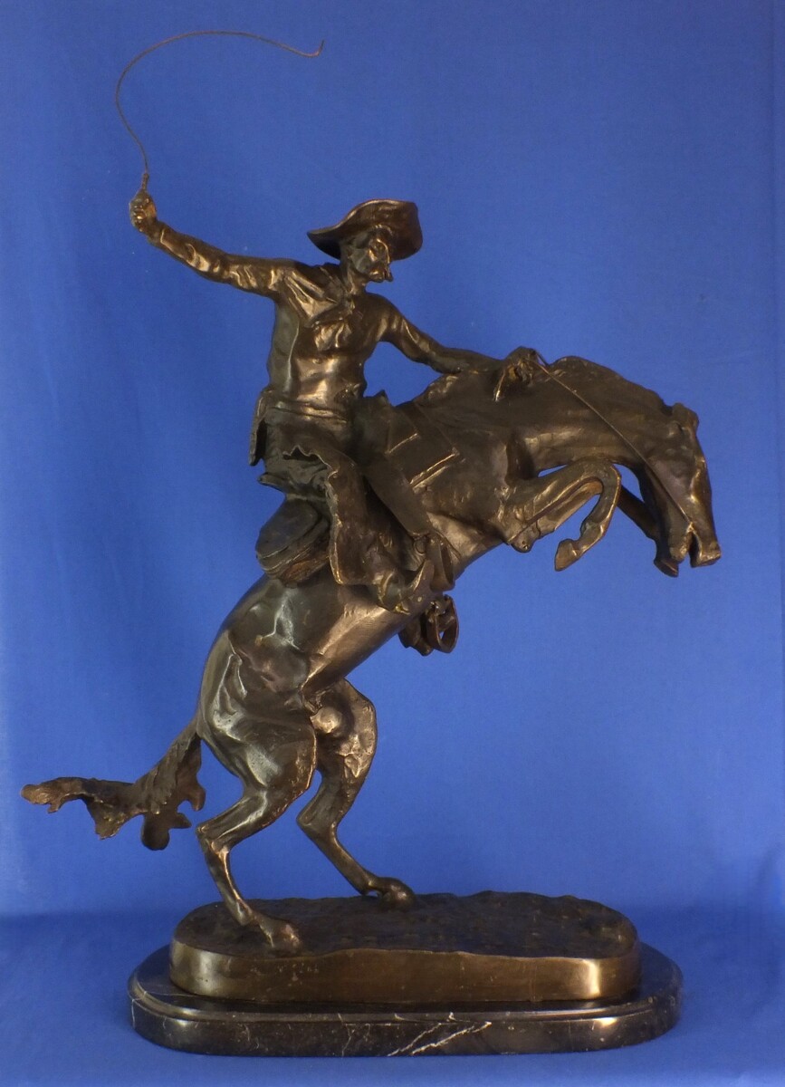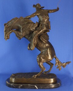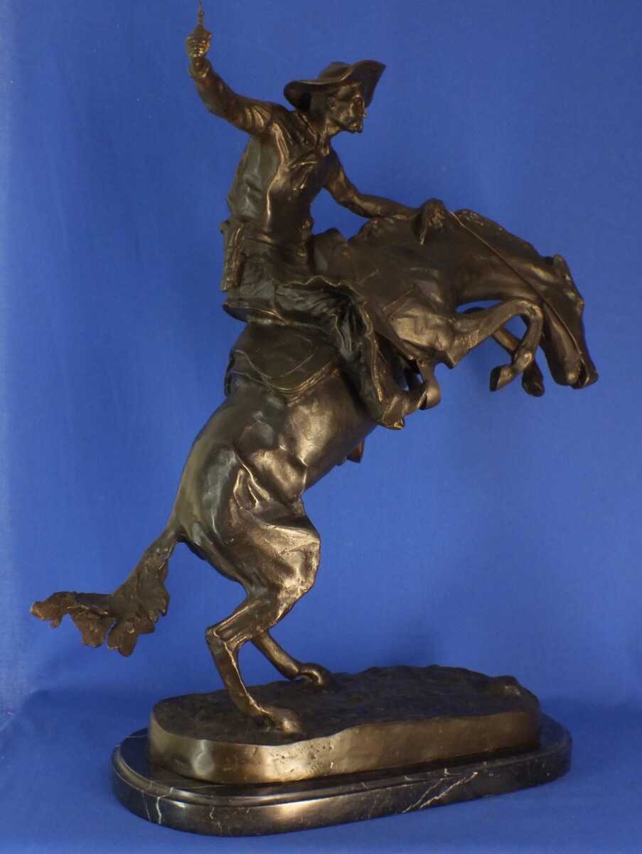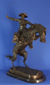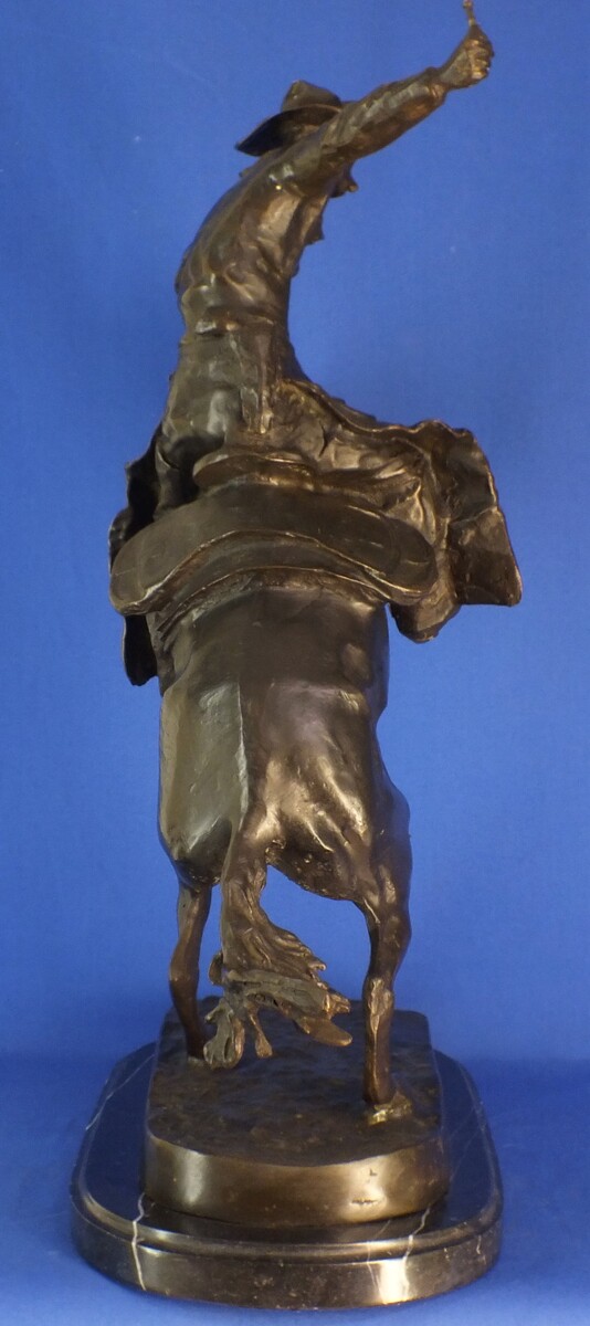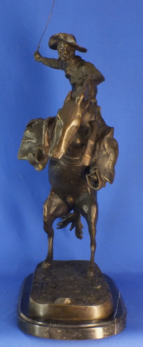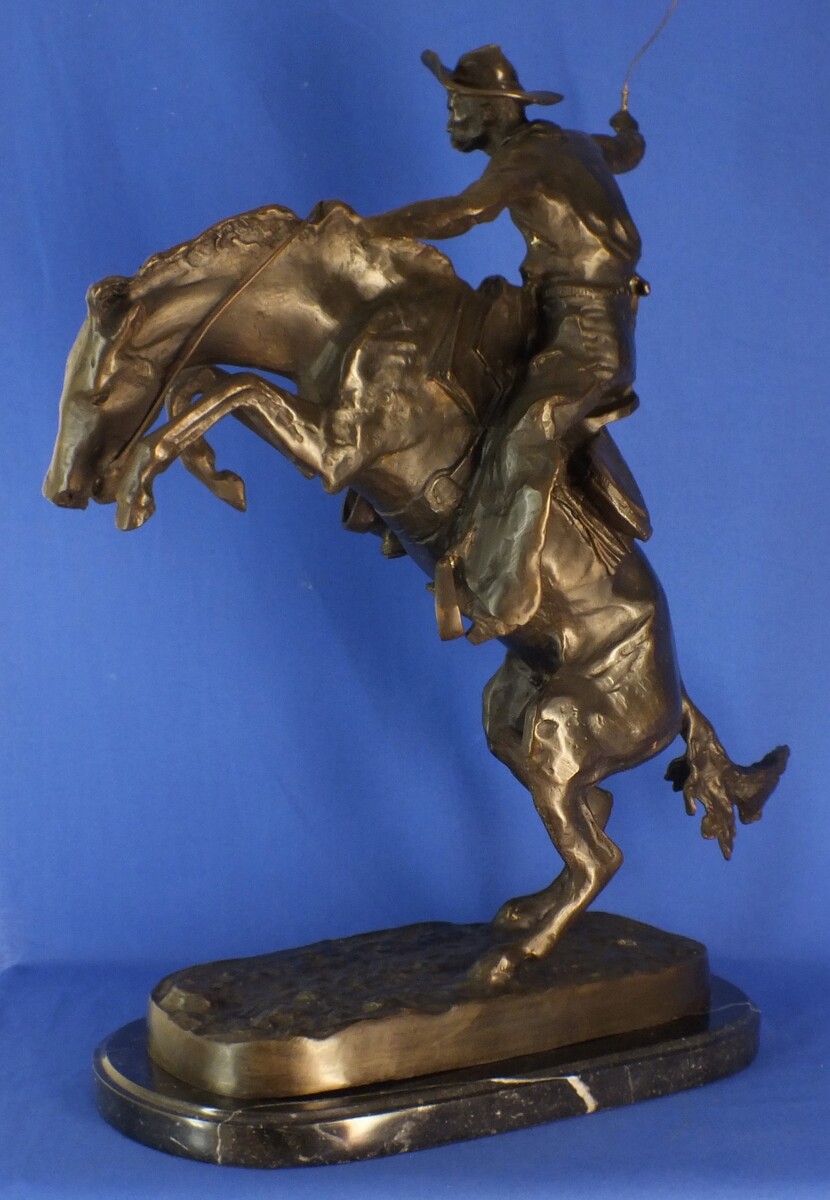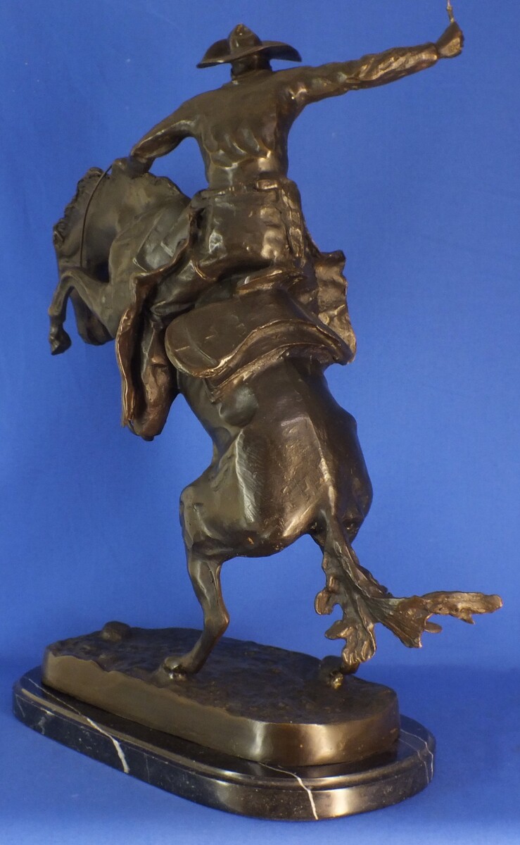 Vintage reproduction Bronze sculpture "The Bronco Buster" by Frederic Remington on a marble base. Height 60cm, base 40 x 22cm. In very good condition.