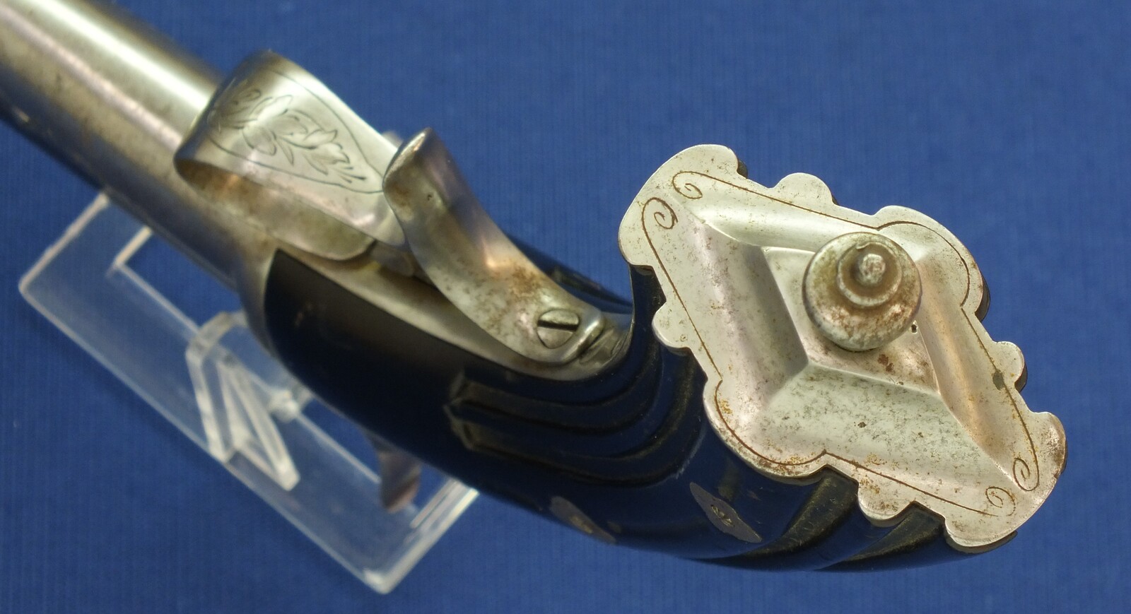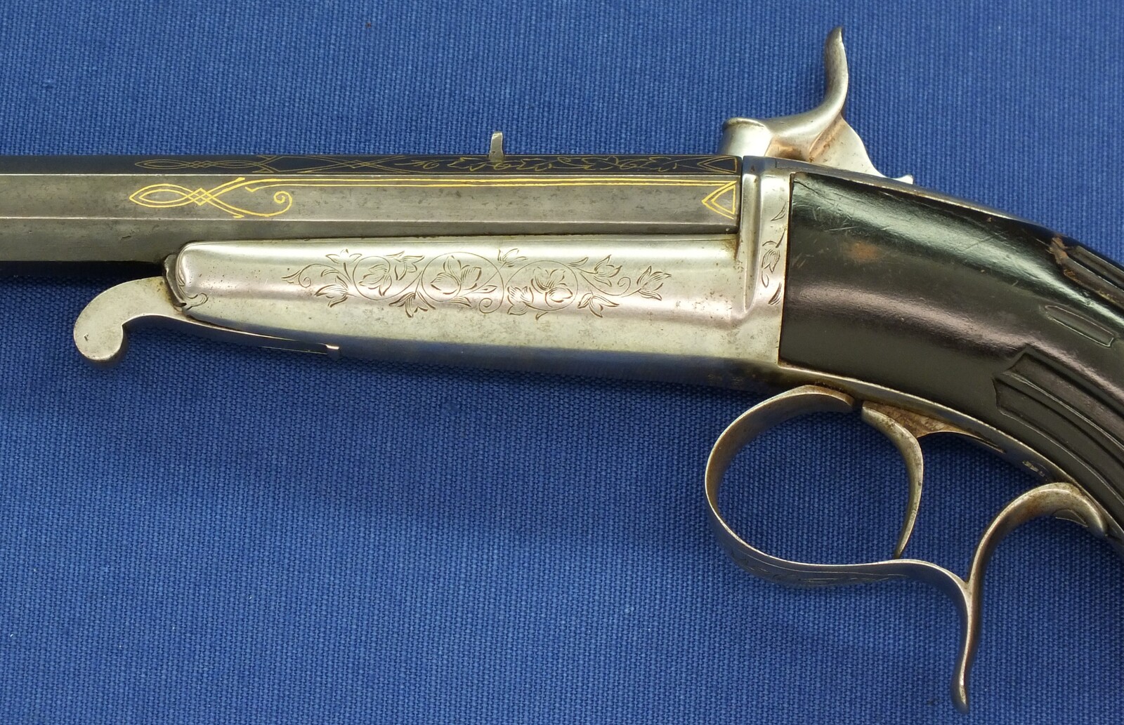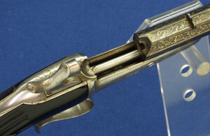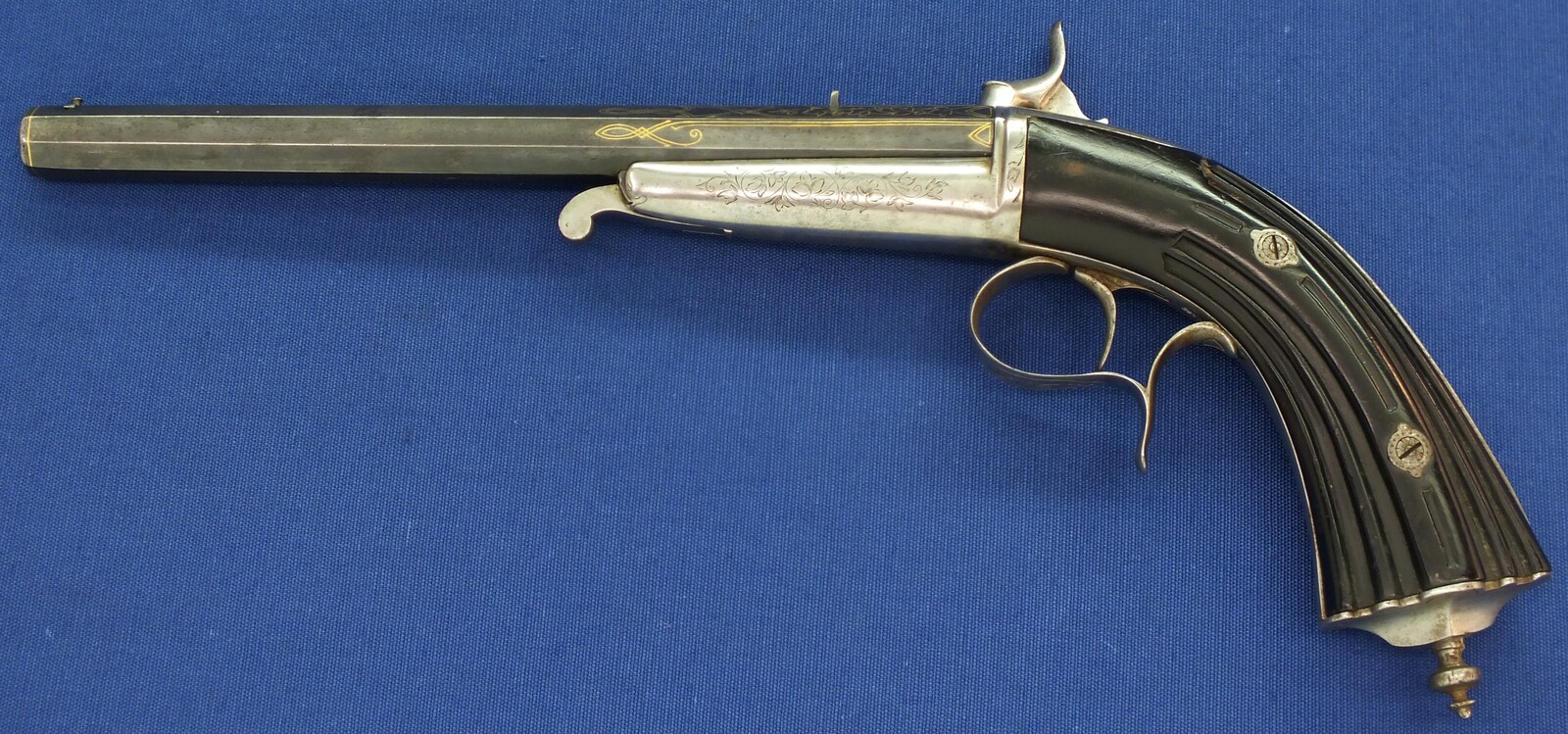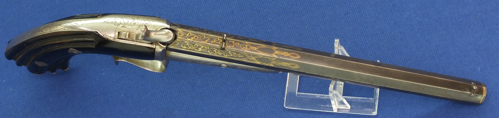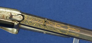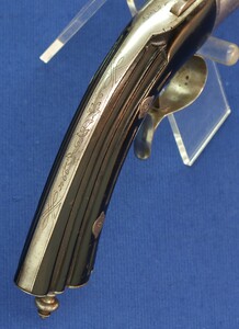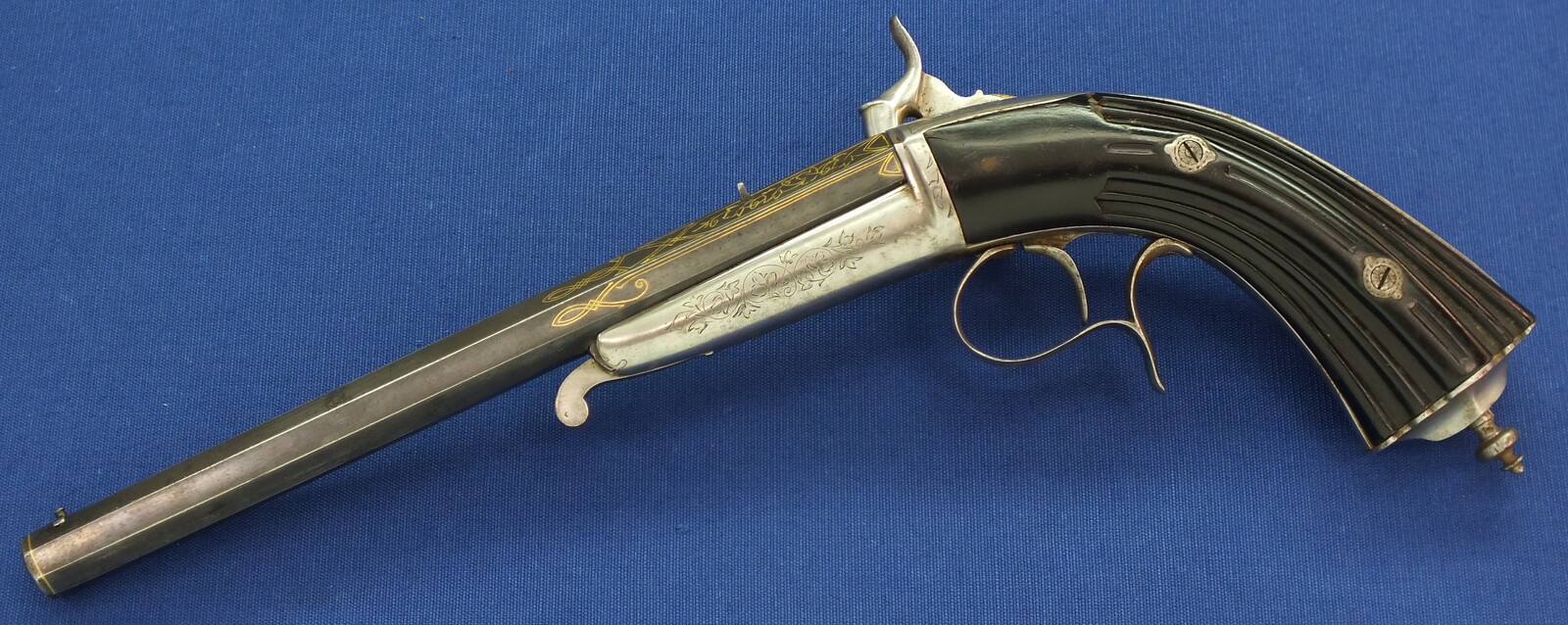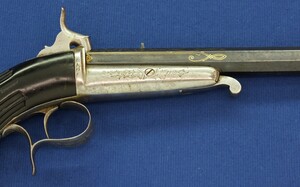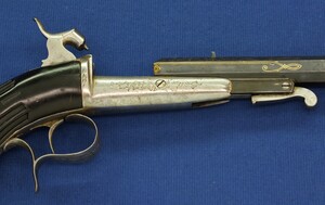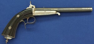 A fine antique Belgian 6mm System Gaubert Brevete Flobert Target/Saloon pistol. 9 inch octagon barrel. Length 37cm. In very good condition.