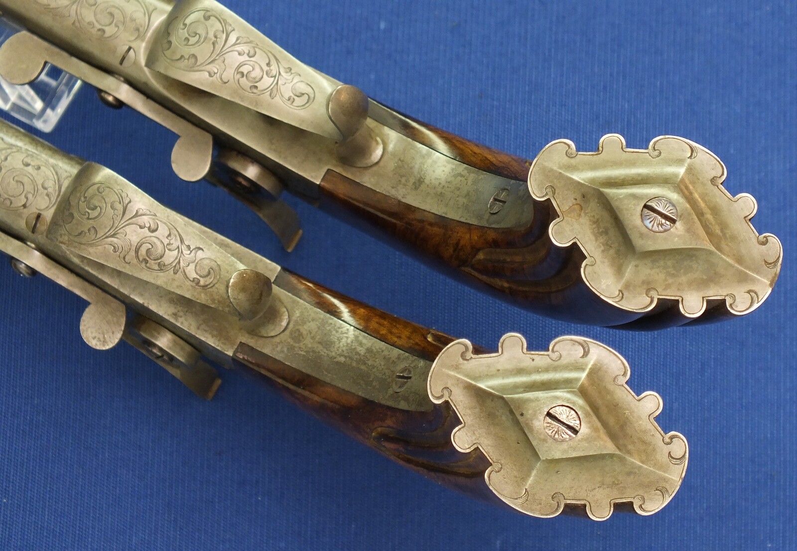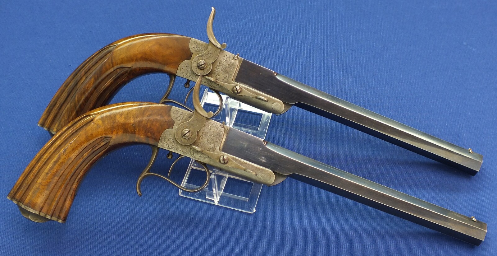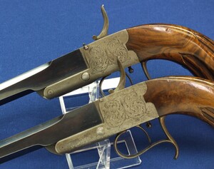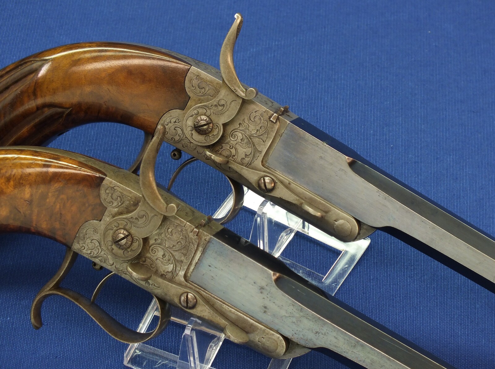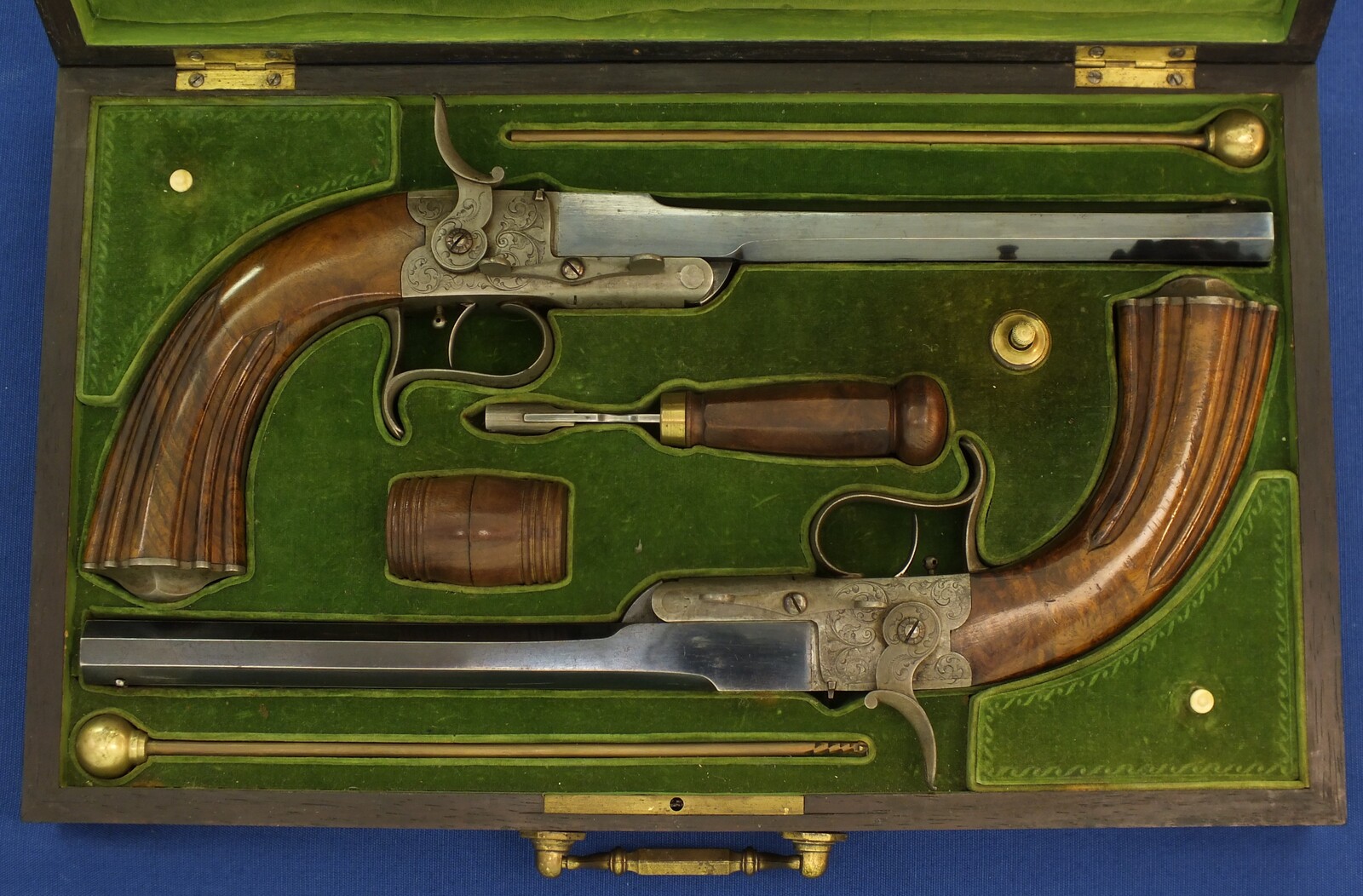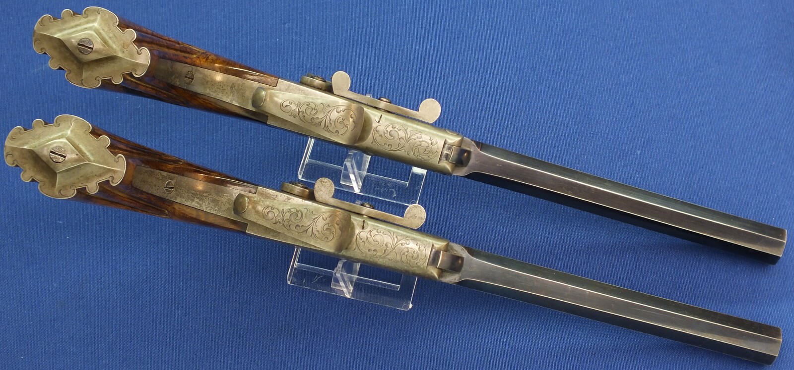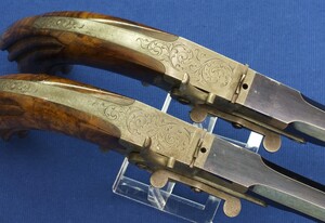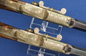 Rosewood veneered case 41x25x7cm. Fine scroll engraved actions, hammers, trigger-guards and butt-caps. Fine Burr Walnut grips