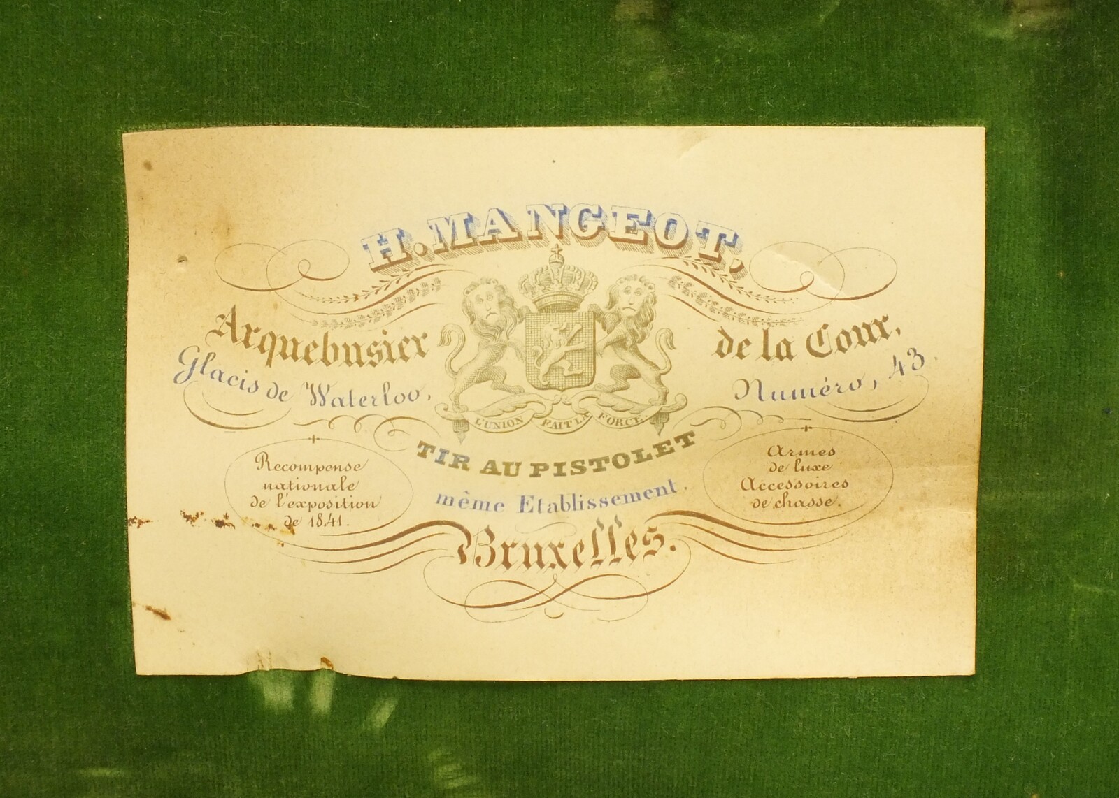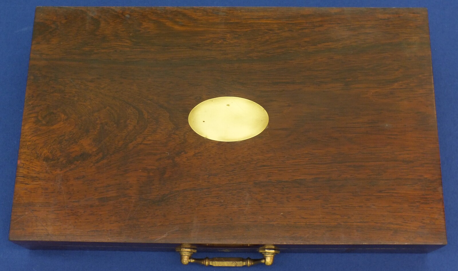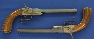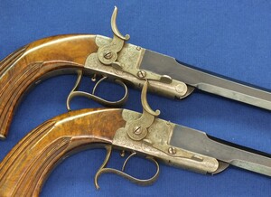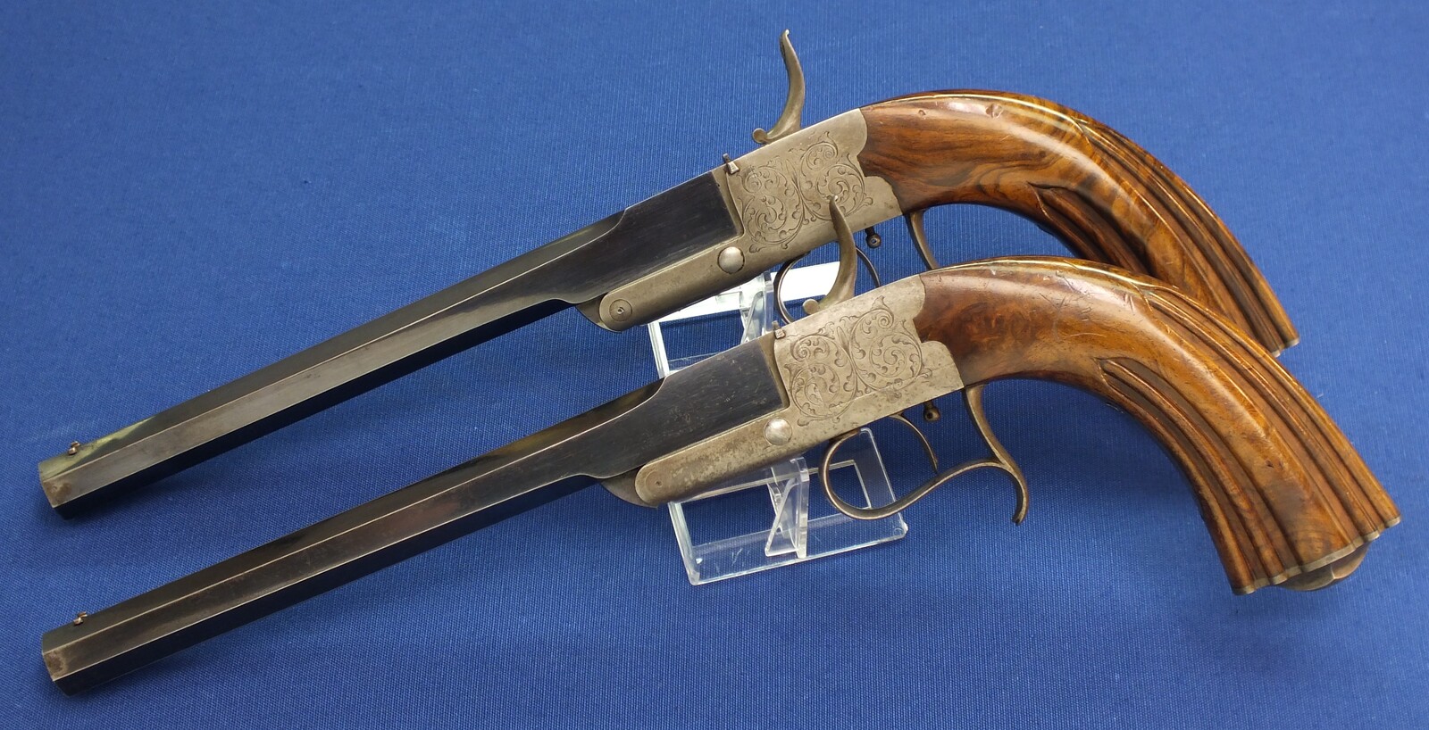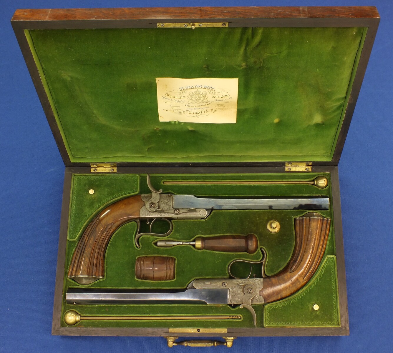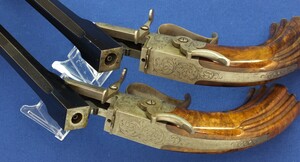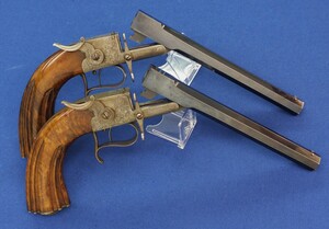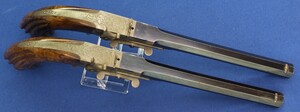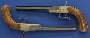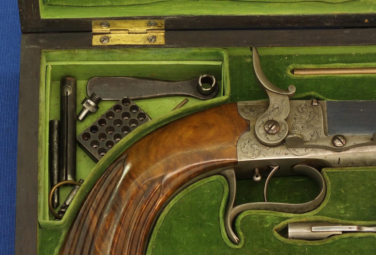 Rosewood veneered case 41x25x7cm. Fine scroll engraved actions, hammers, trigger-guards and butt-caps. Fine Burr Walnut grips