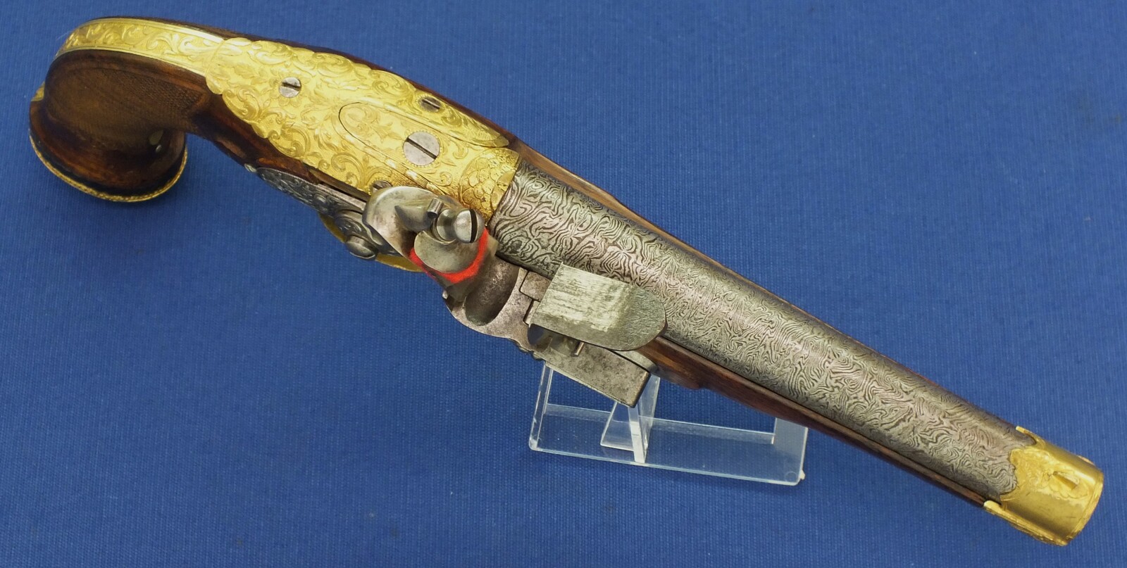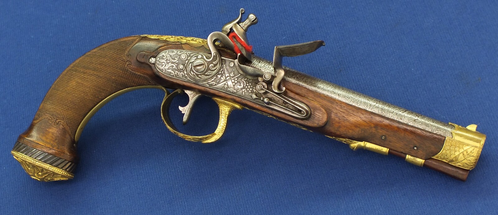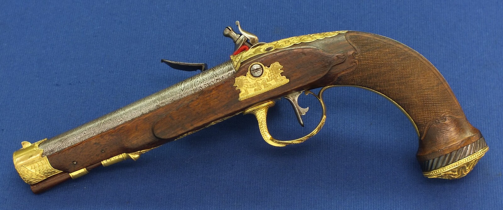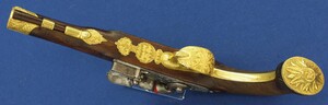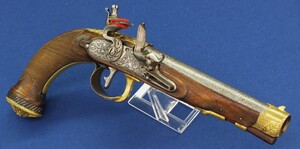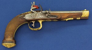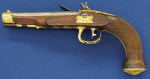 A fine antique circa 1800-20 Karlsbad type Flintlock pistol with Damascus barrel. Caliber 12mm. Length 30cm. In very good condition.