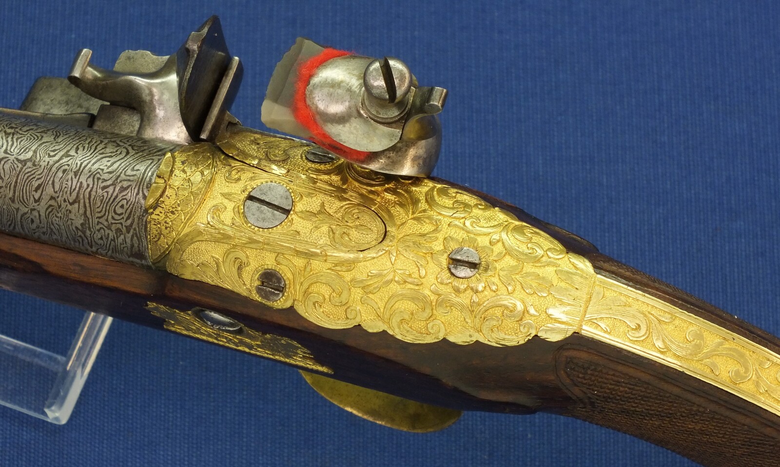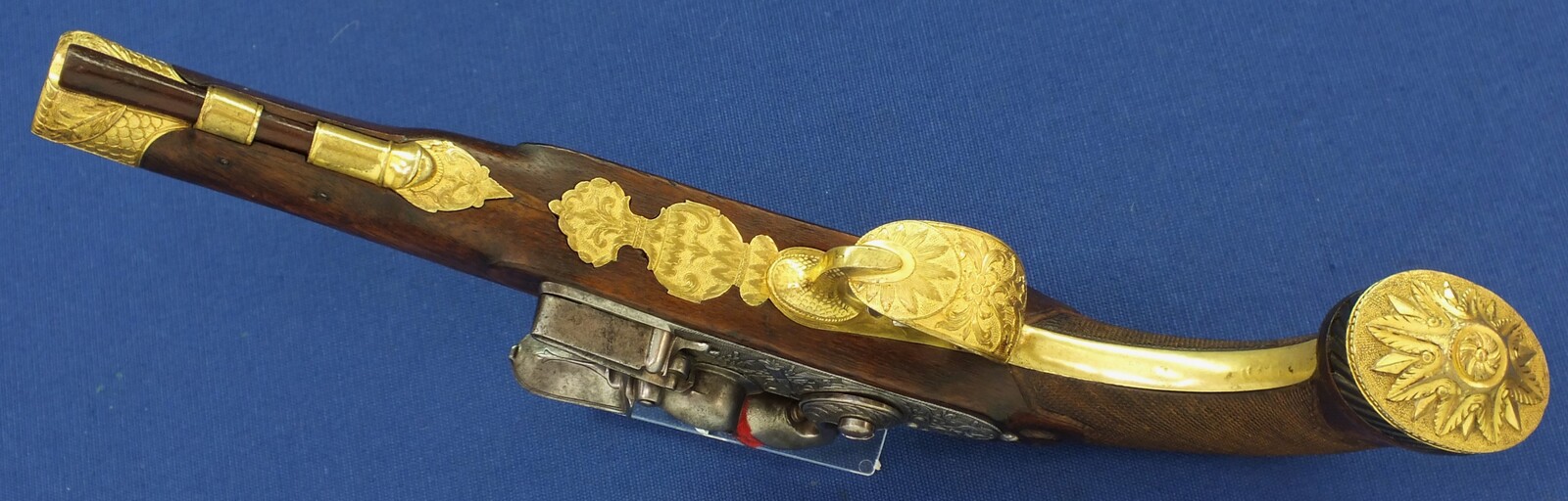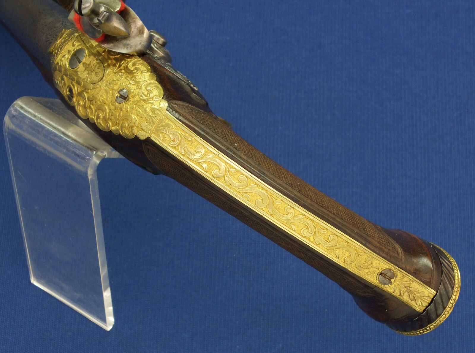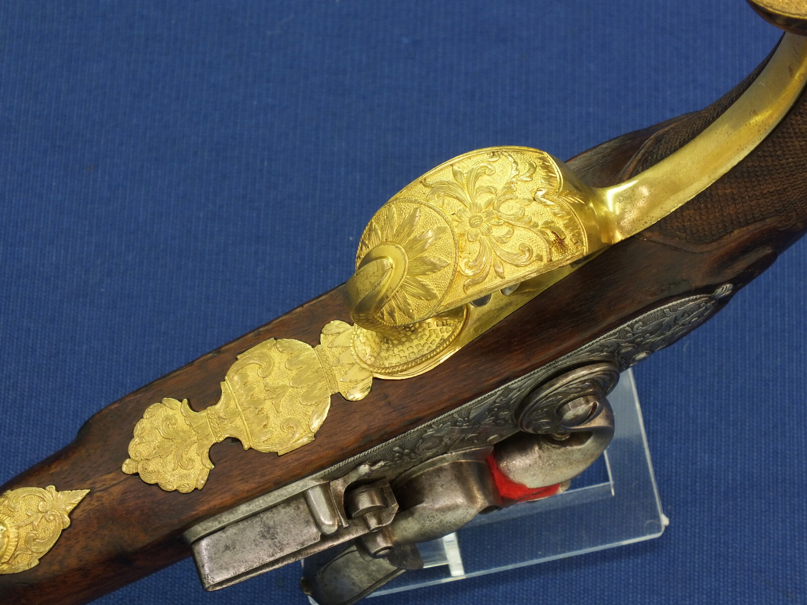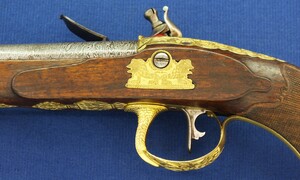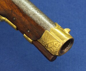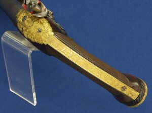 Fine carved and chequered Walnut stock with fine Brass Gilded chisseled Mounts. Fine chisseled Lock