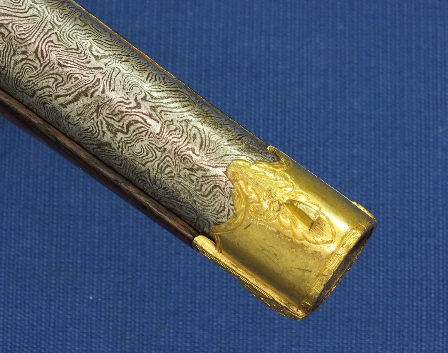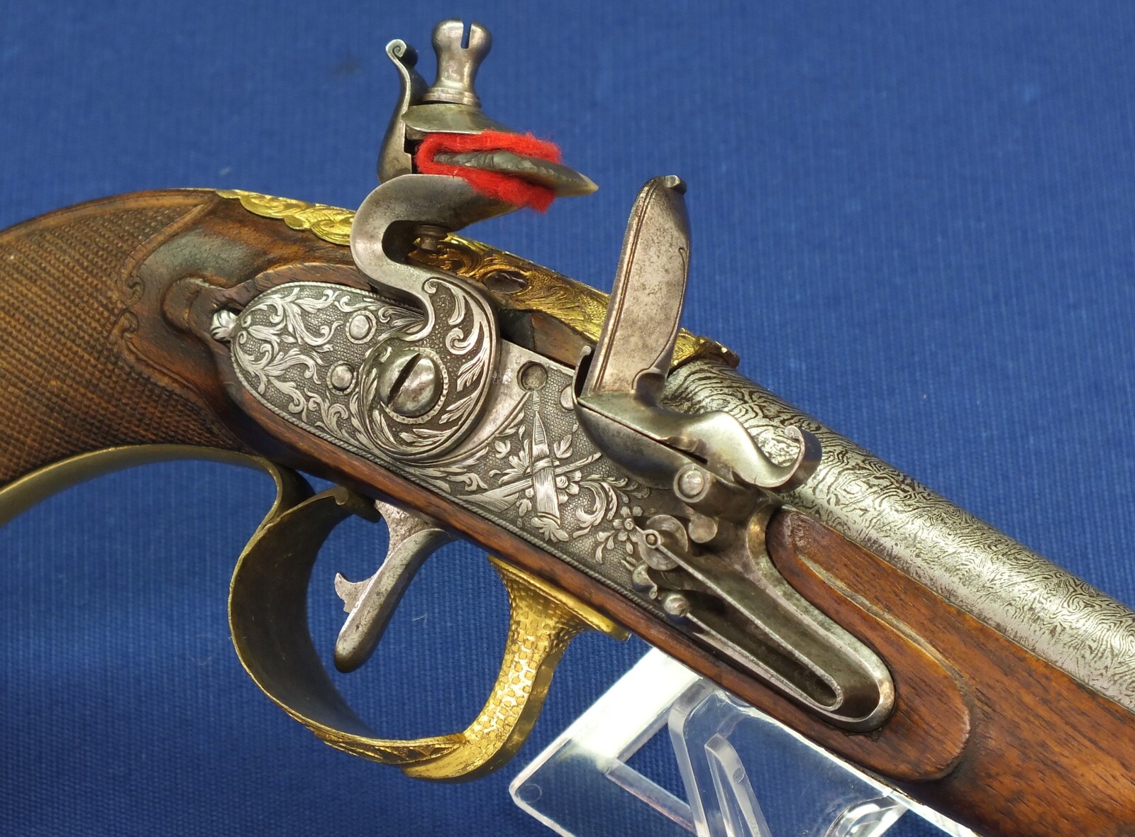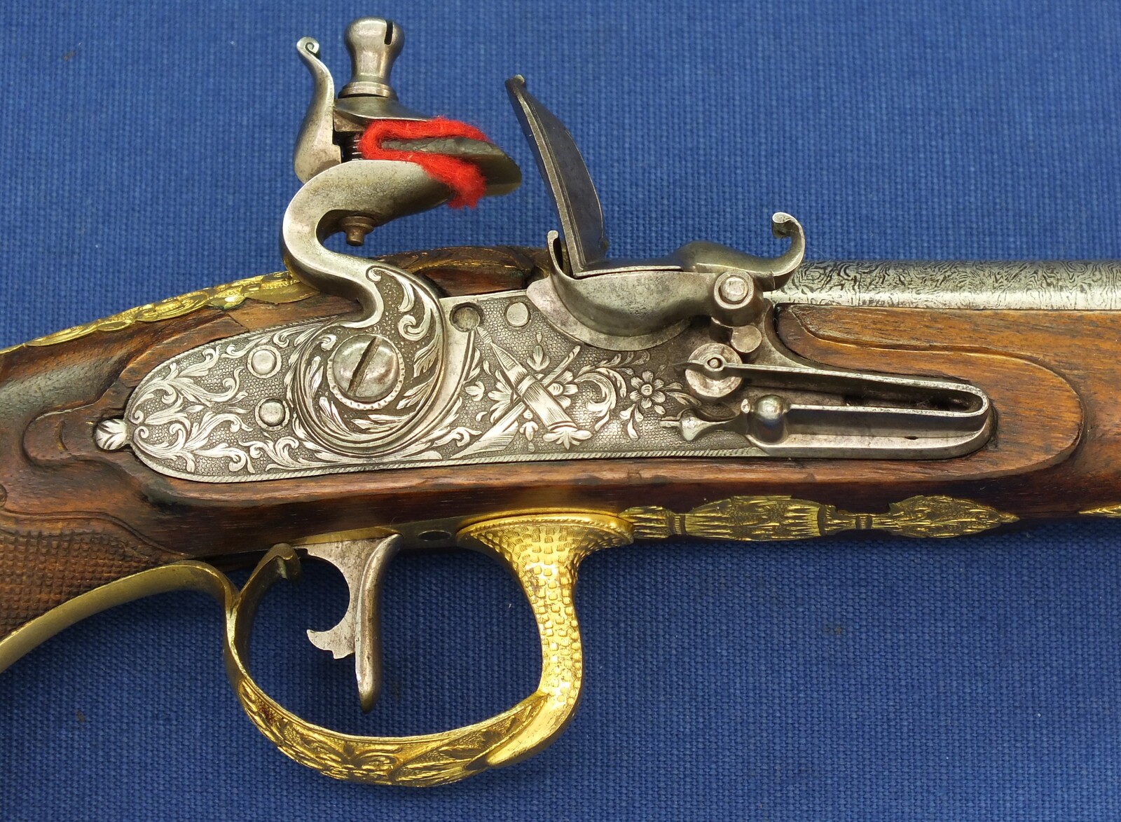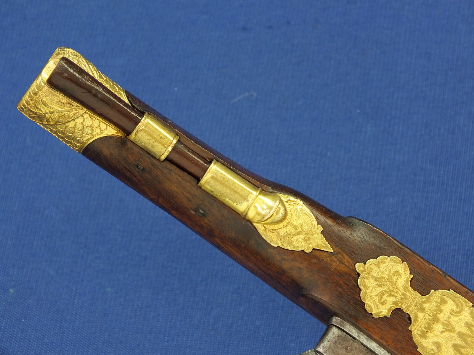 Fine carved and chequered Walnut stock with fine Brass Gilded chisseled Mounts. Fine chisseled Lock