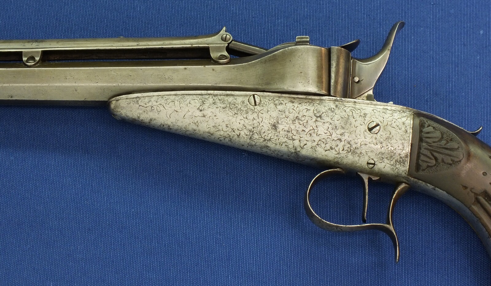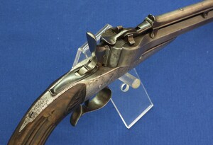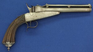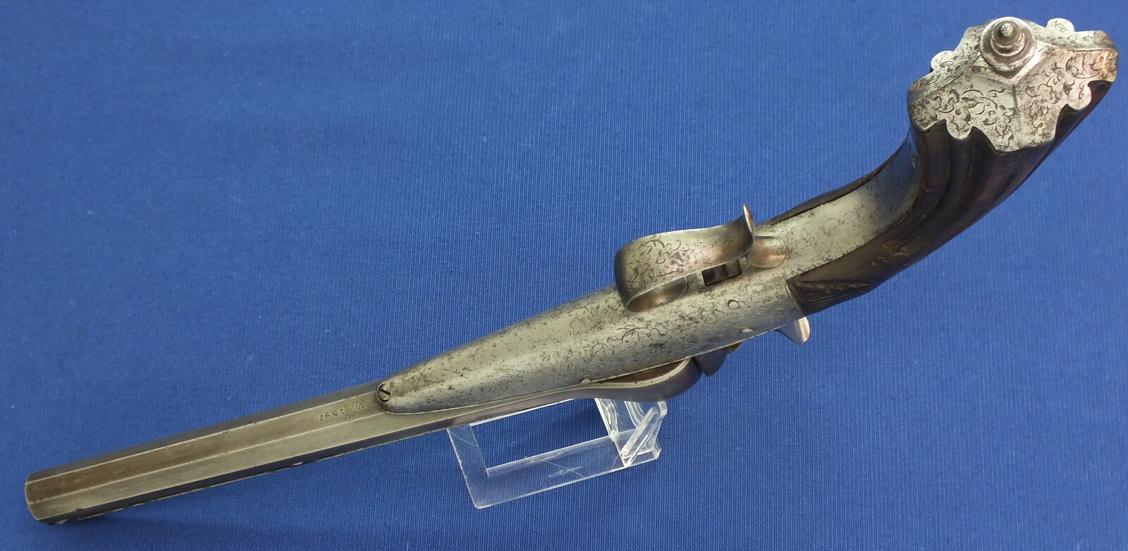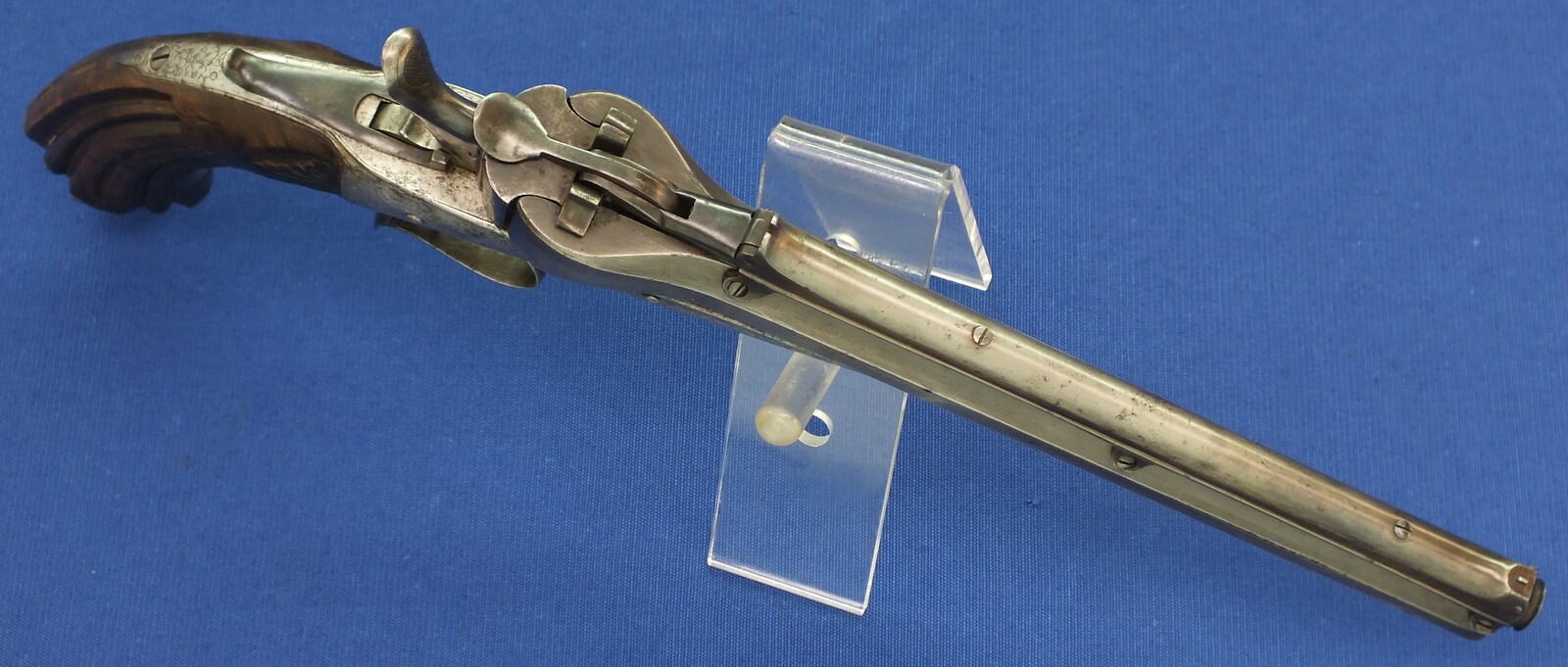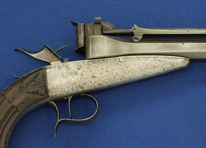 A rare antique circa 1860 Belgian Victor Colette's Gravity Pistol. Caliber 10mm, length 39cm. Floral engraved action and butt-cap. SN1597. In very good condition.