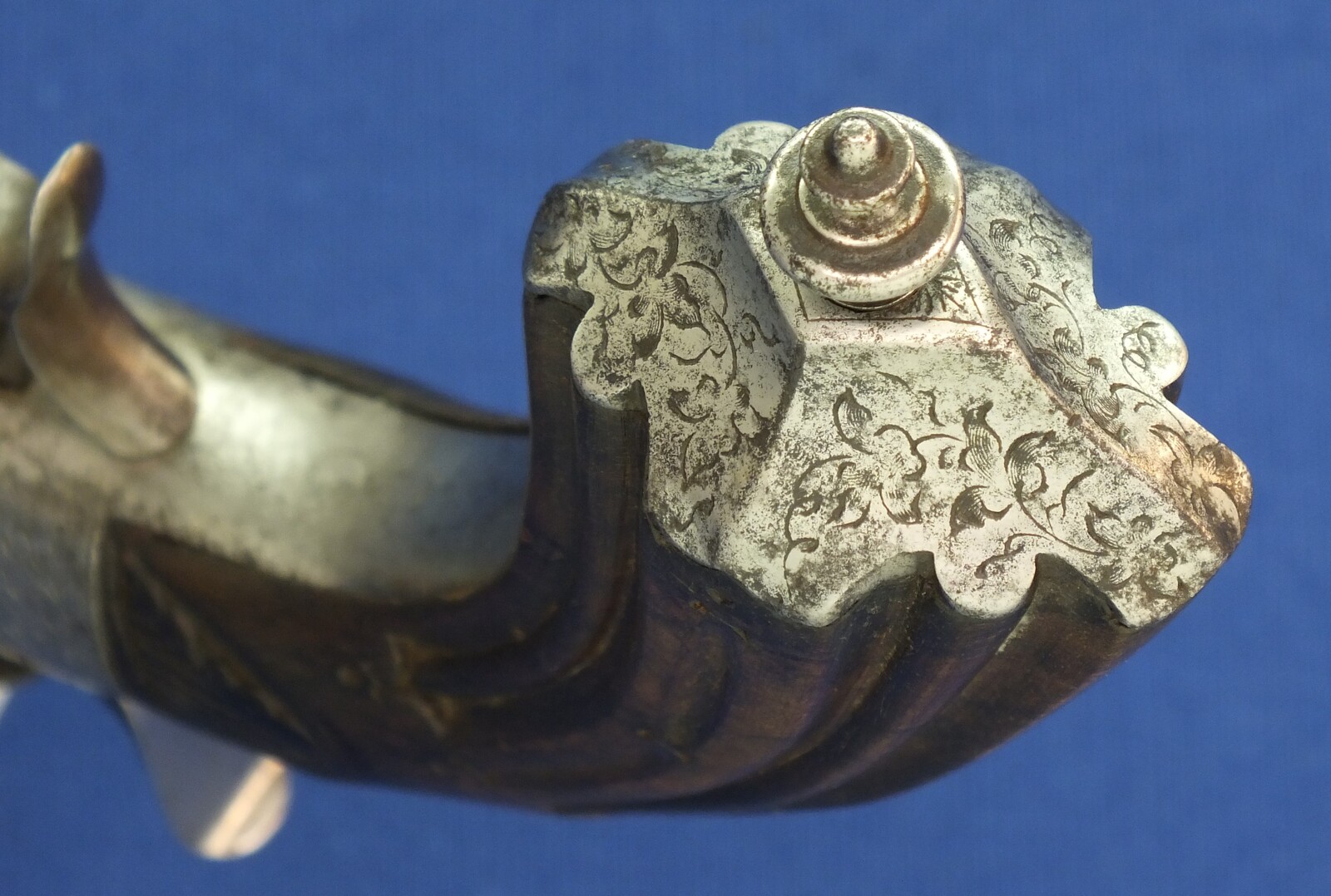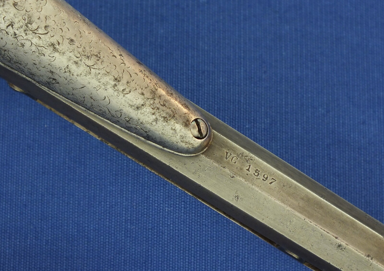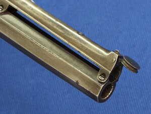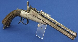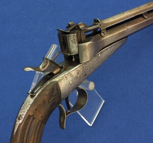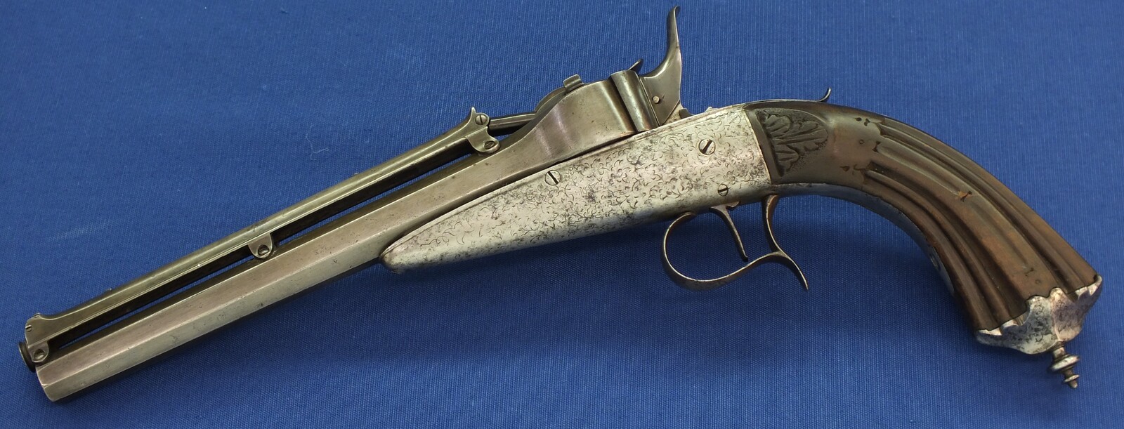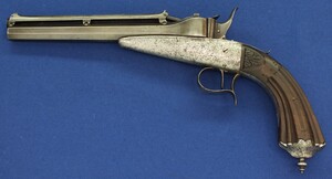 A rare antique circa 1860 Belgian Victor Colette's Gravity Pistol. Caliber 10mm, length 39cm. Floral engraved action and butt-cap. SN1597. In very good condition.