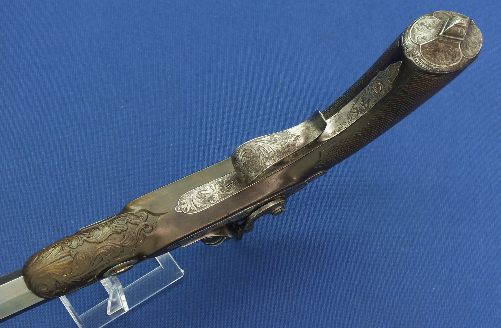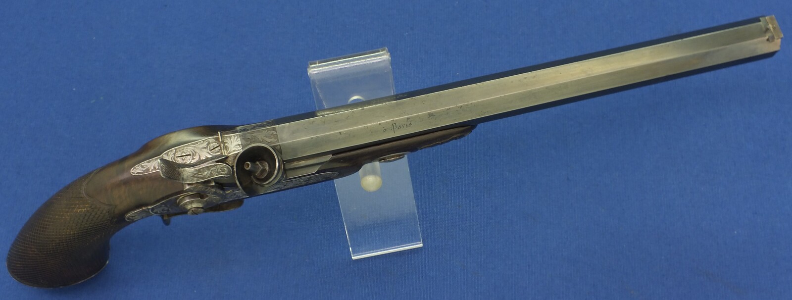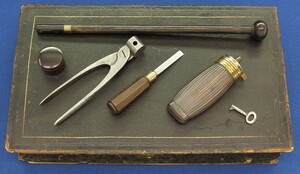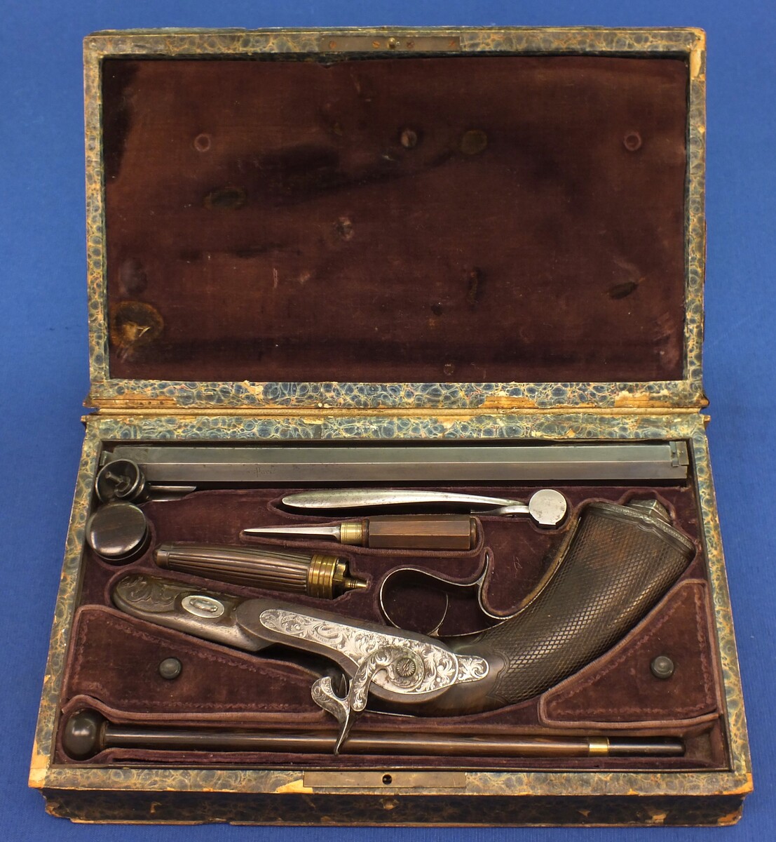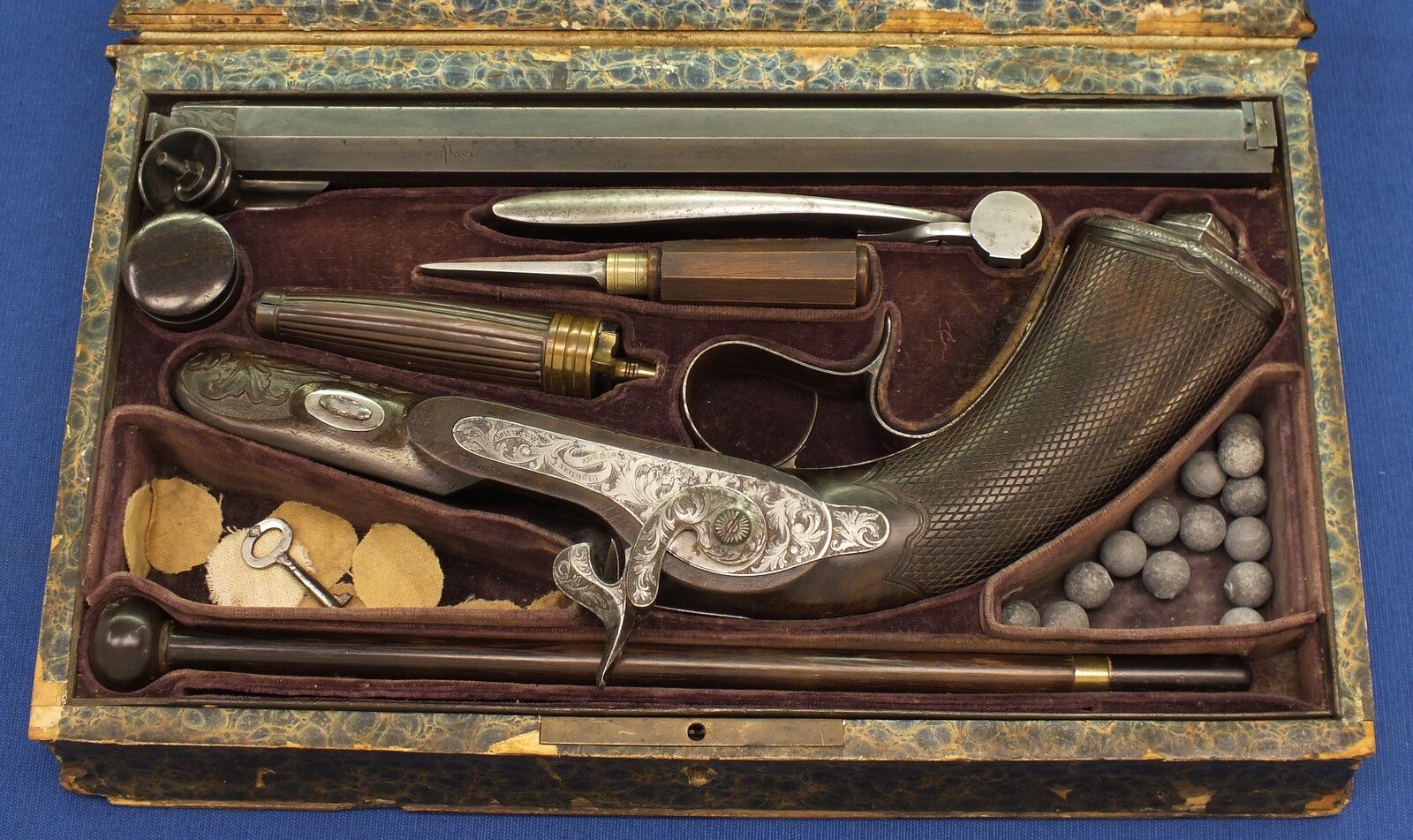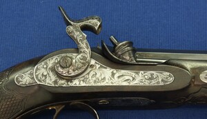 Original leather covered book casing with original accoutrements. Signed in Gold on spine. Fine carved and chequered Walnut stock, Fine chisseled and engraved steel mounts. Barrel signed Geerinckx a Paris, lock Signed: Lepage-Moutier Arquebusier du Roi (Gunmaker for the King/court)