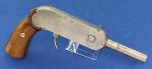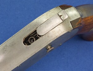 This gun was invented in 1878 and probably no more than couple hundred were made with maybe a dozen surviving examples. Gun was loaded by slide on top of frame which also retains fixed rear sight, The cartridges are placed in cups which are mounted on an endless chain and are brought successively to the barrel and discharged. The charge of fulminate or quick powder may form an integral part of the hollow projectile, which is placed in the cup on the chain