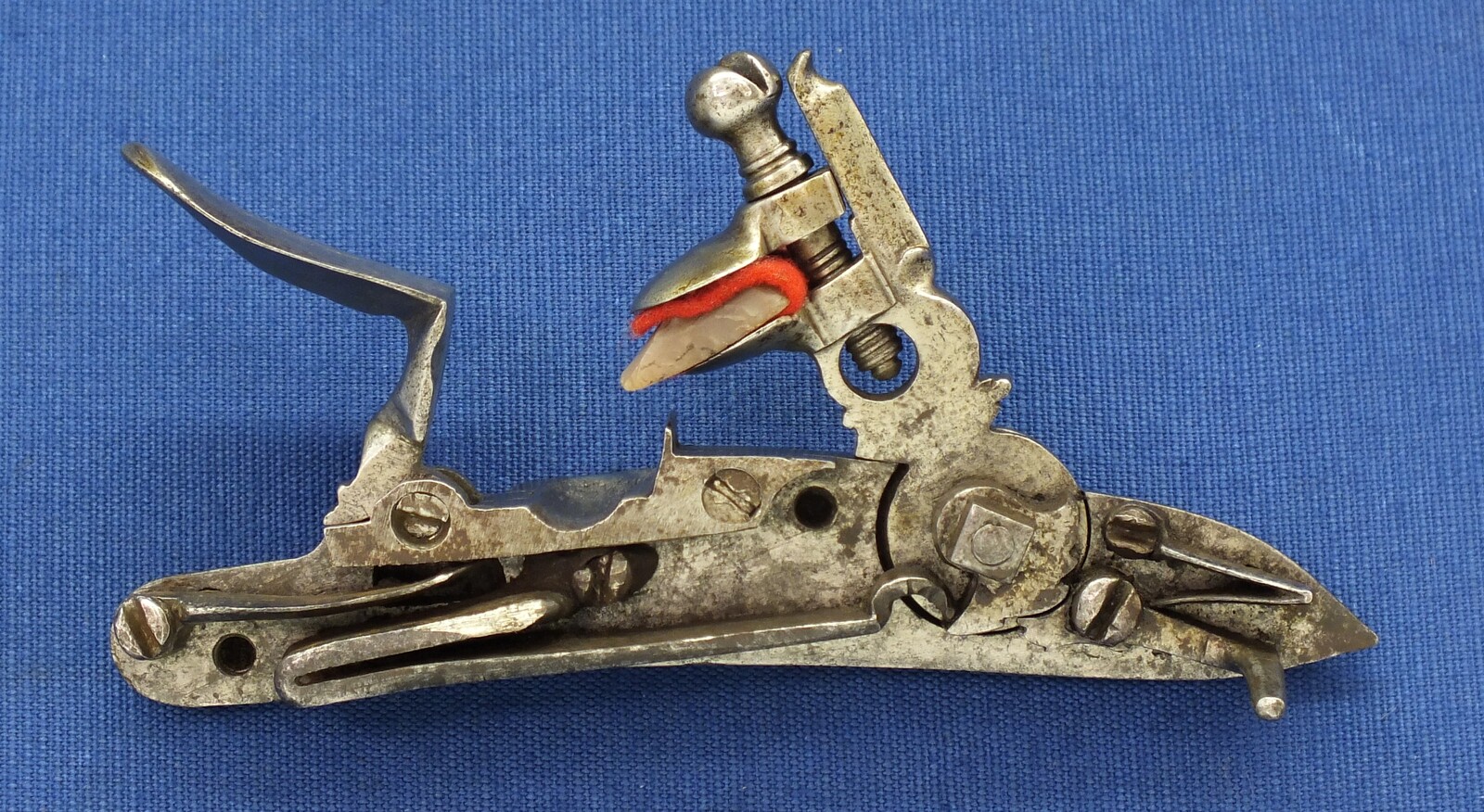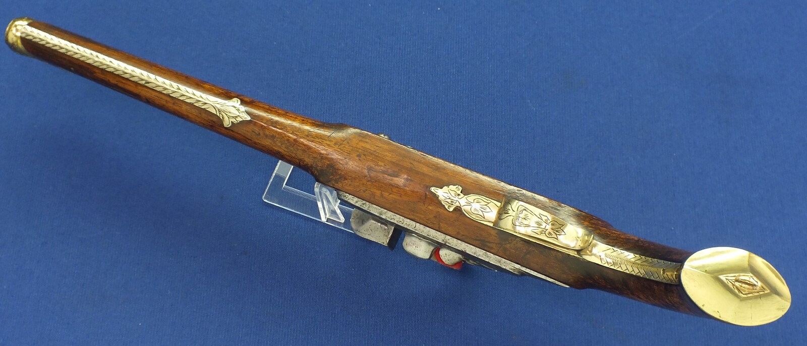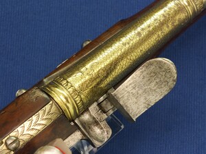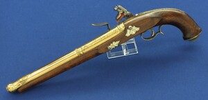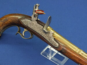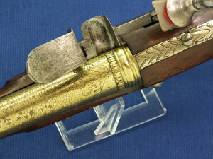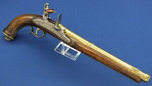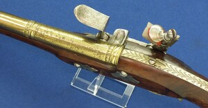 An antique 19th century Eastern Flintlock pistol with decorative gilded Brass Cannon barrel with Fish/Sea monster shaped Muzzle. Length 44cm. Caliber 14mm. In very good condition.