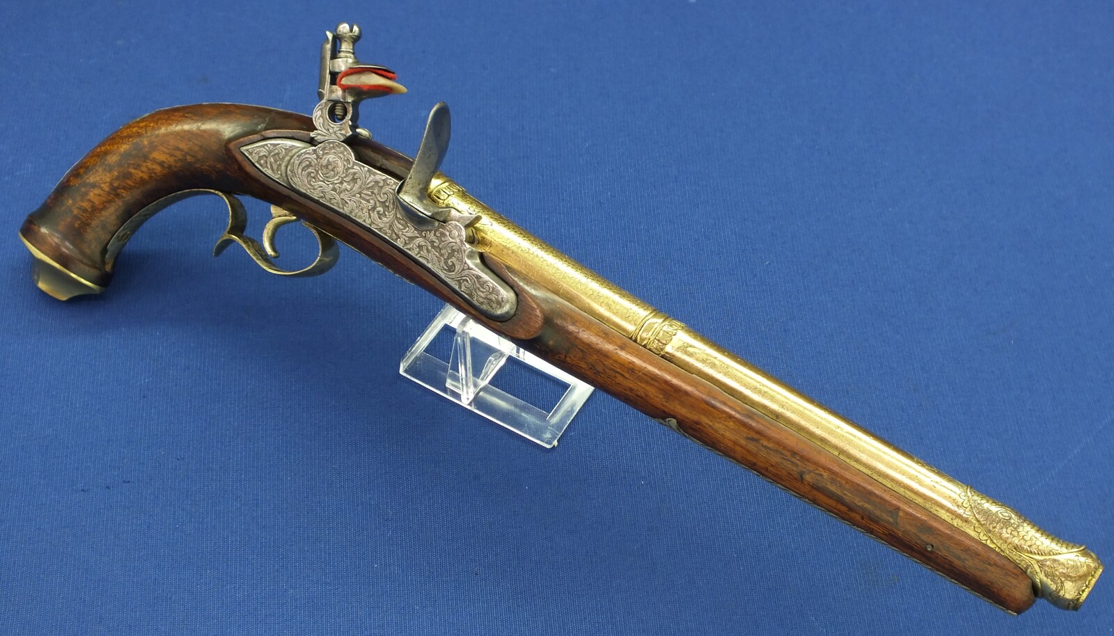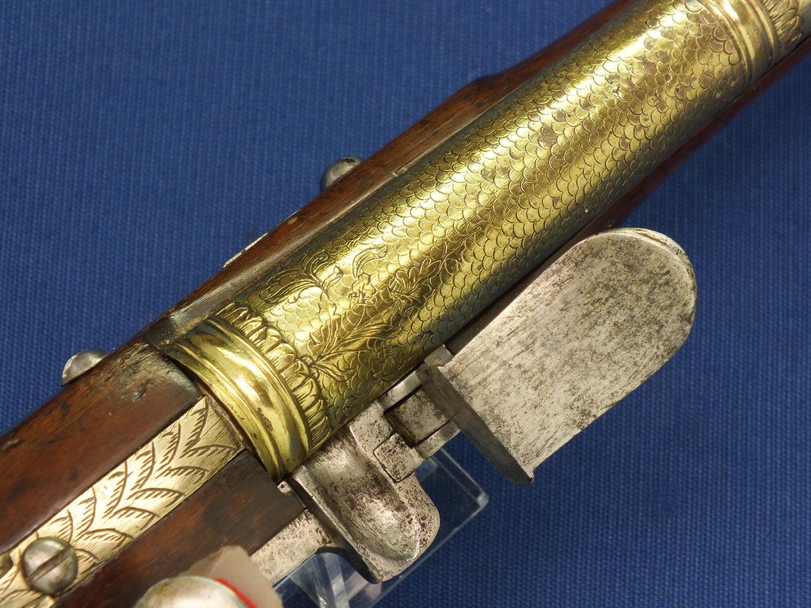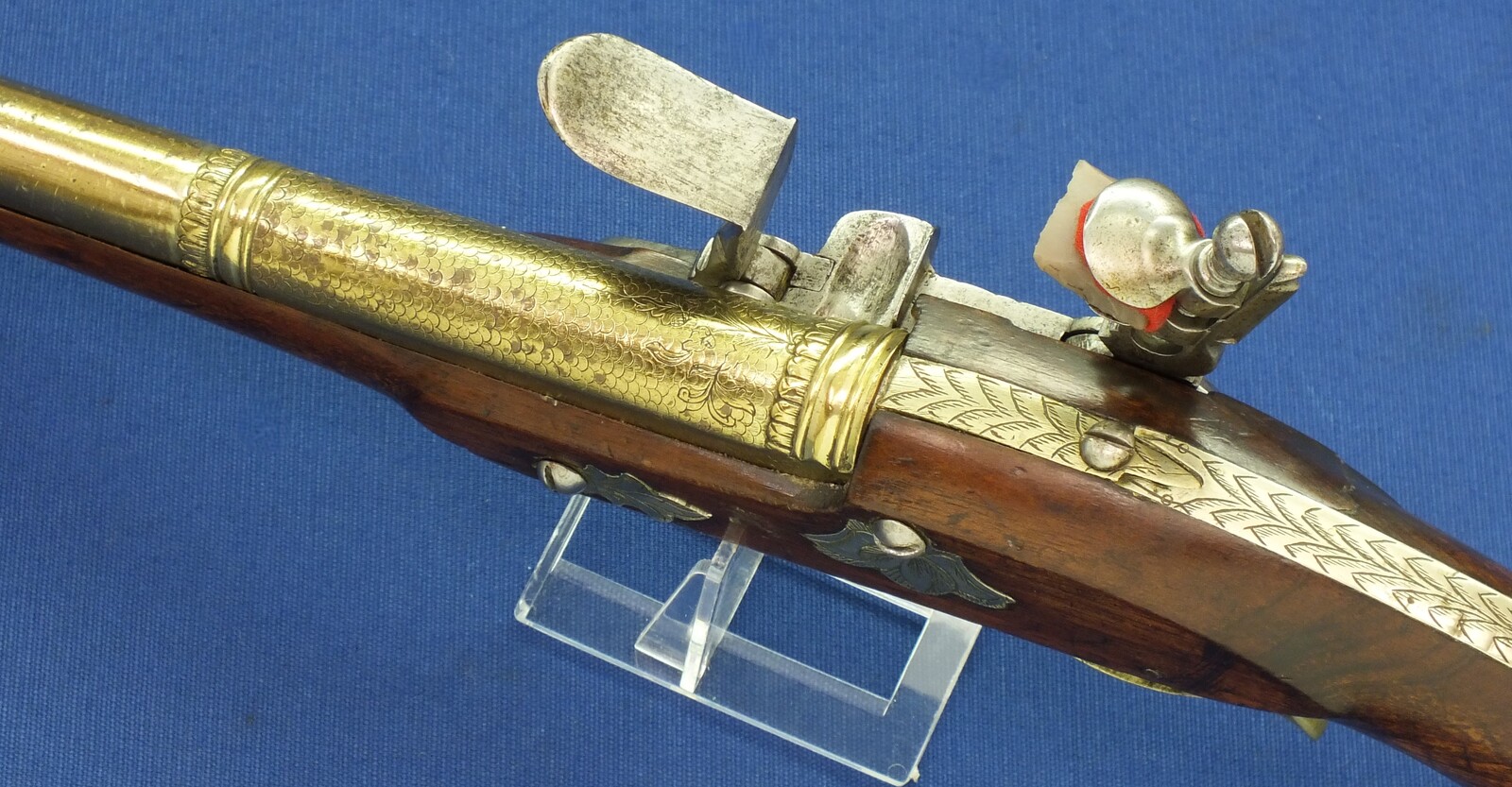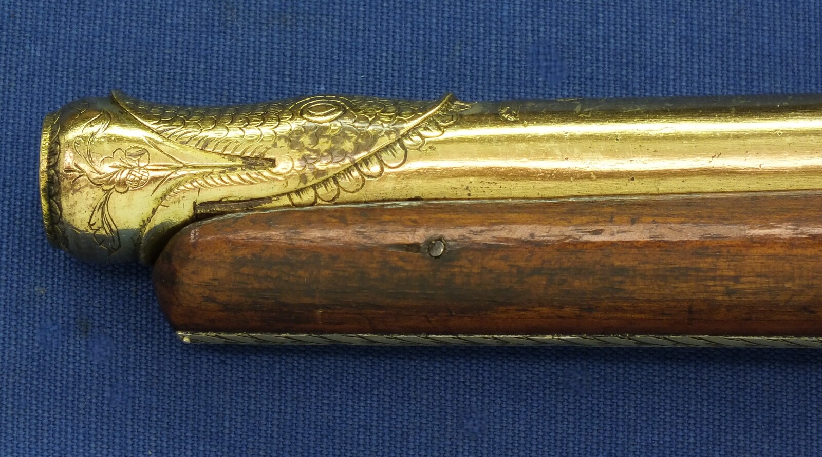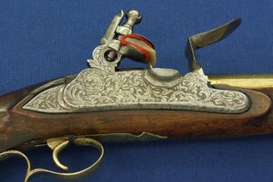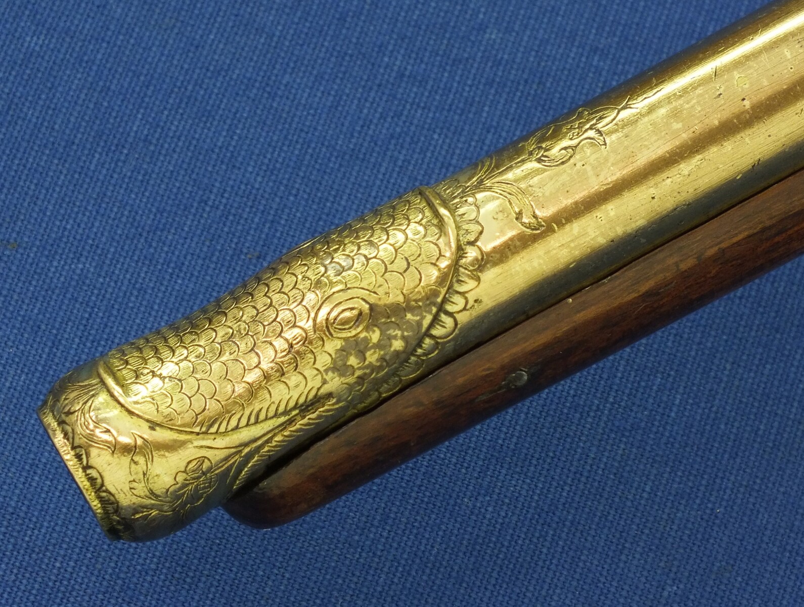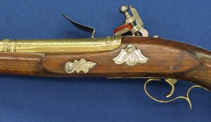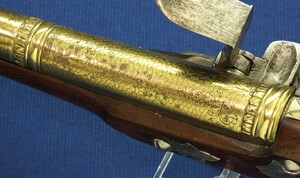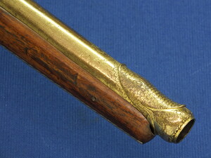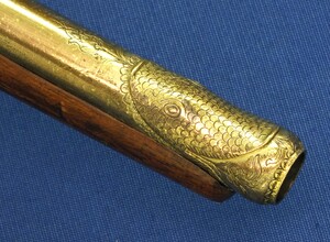 Walnut Stock with Engraved Brass mounts. Fine Engraved Lock probably early 17th Century Dutch/French origin. Fine engraved Brass Barrel decorated with Fish skin and muzzle with Fish/sea monsters head