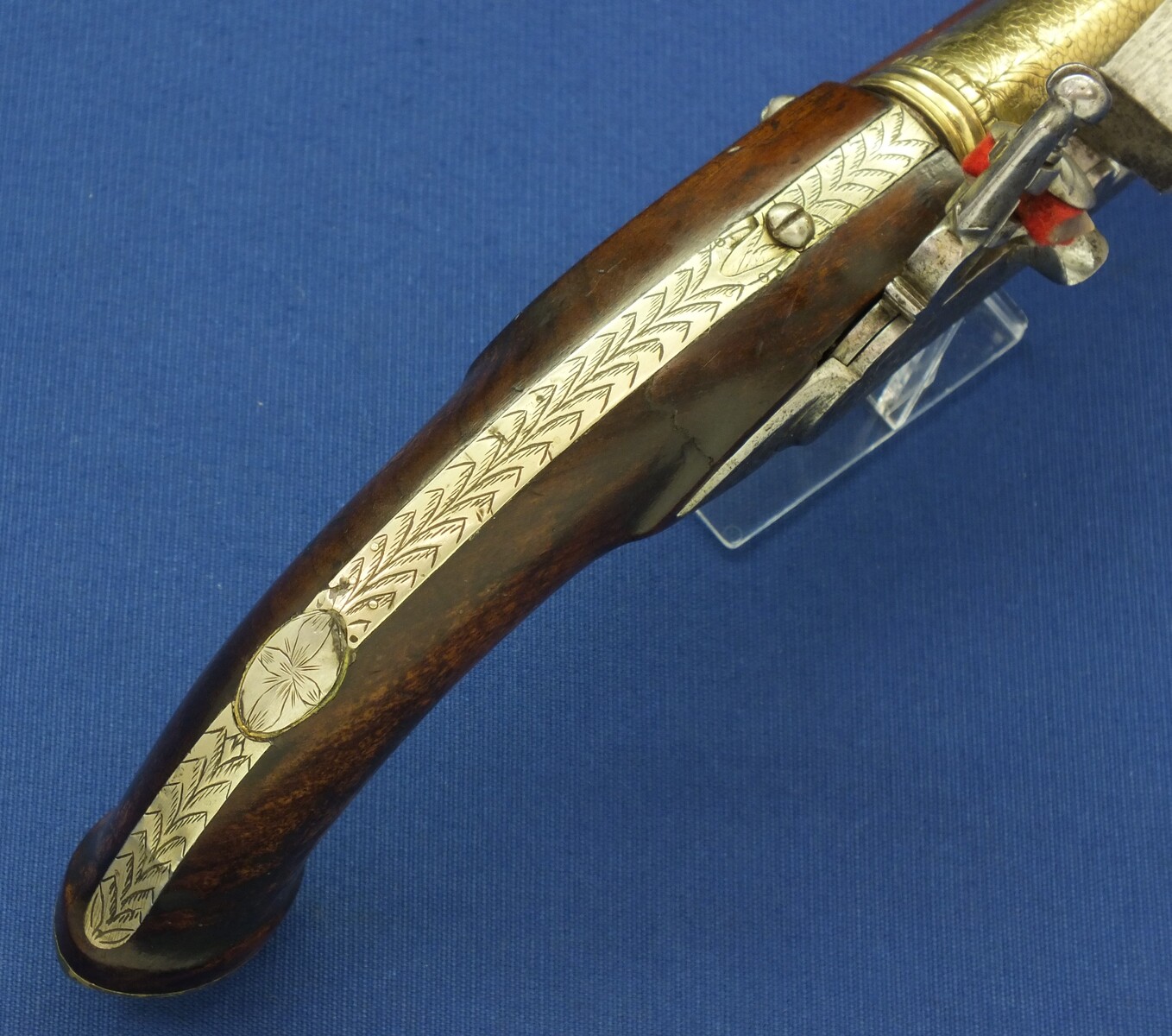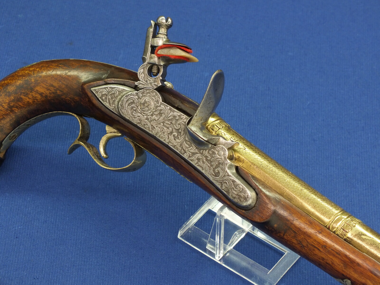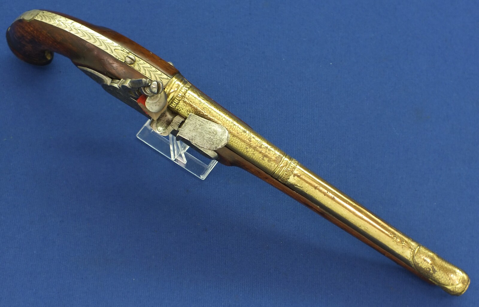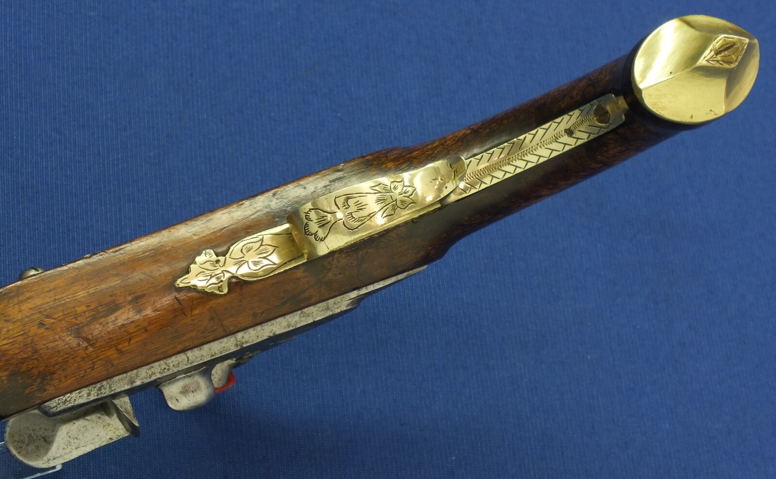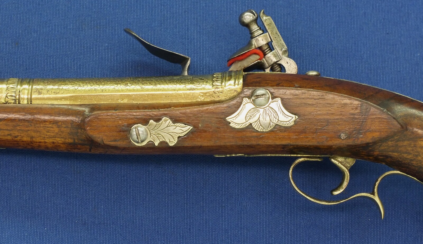 Walnut Stock with Engraved Brass mounts. Fine Engraved Lock probably early 17th Century Dutch/French origin. Fine engraved Brass Barrel decorated with Fish skin and muzzle with Fish/sea monsters head
