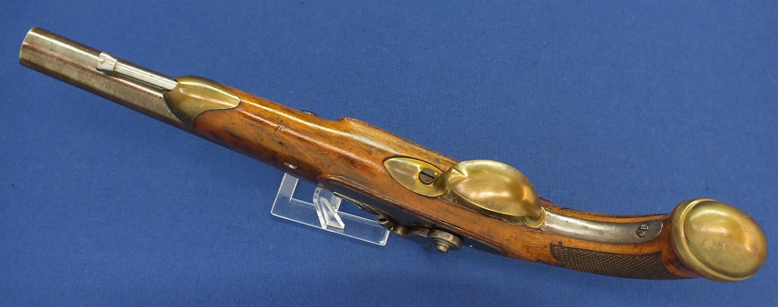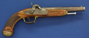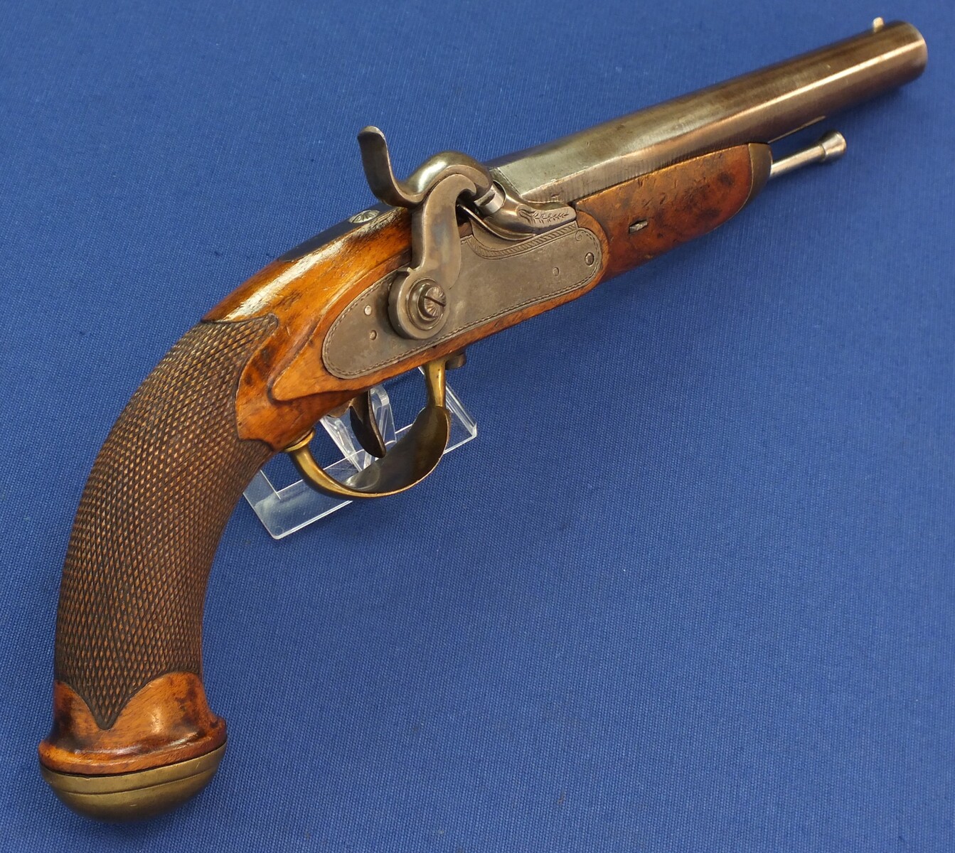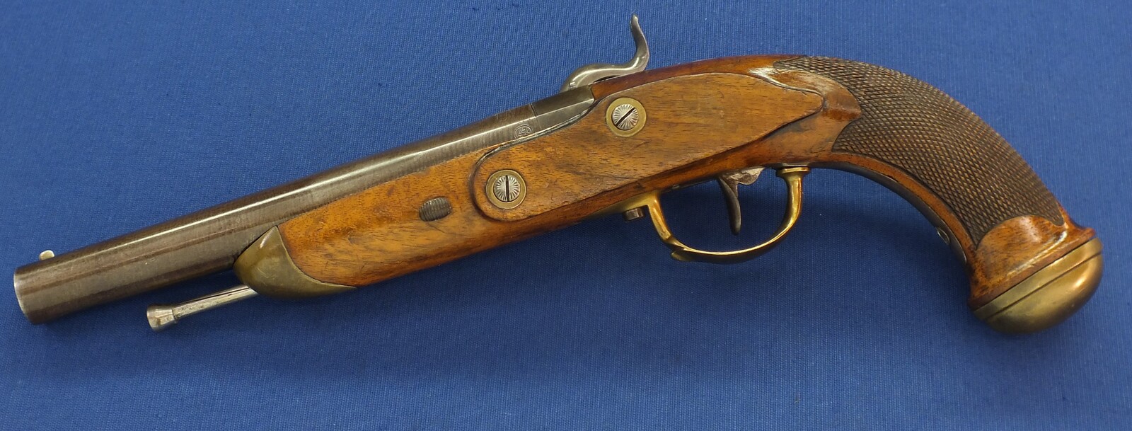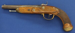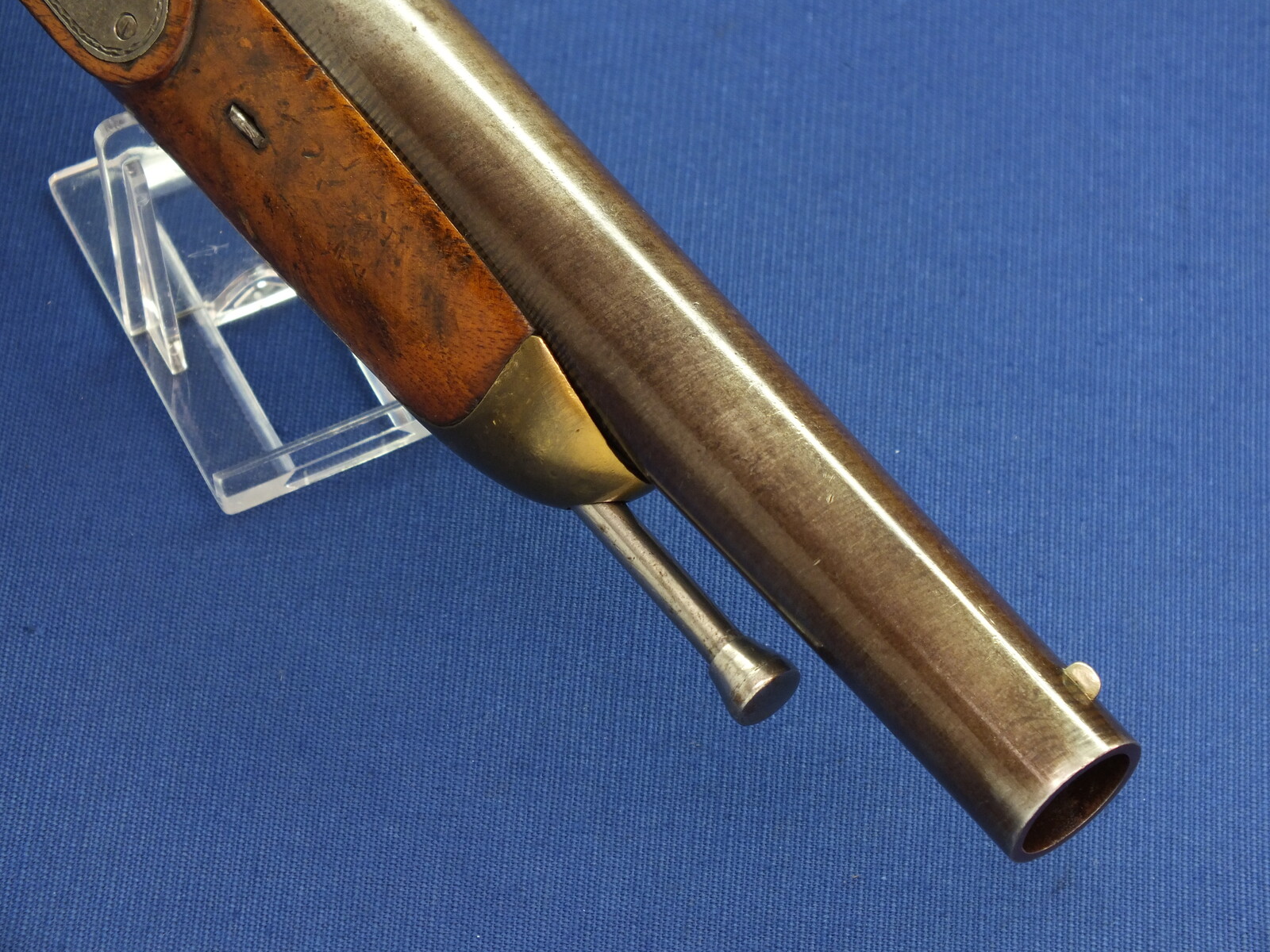 An antique Belgian Model 1816-22 Officers percussion Pistol. Damascened Barrel. Caliber 17,5mm smooth. Length 38cm. In very good condition.