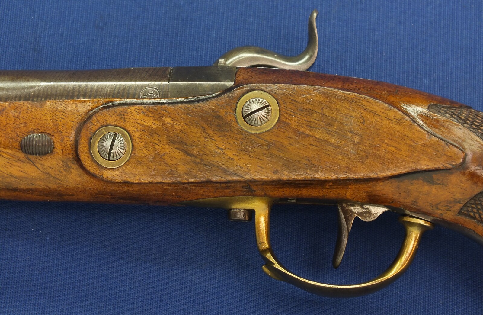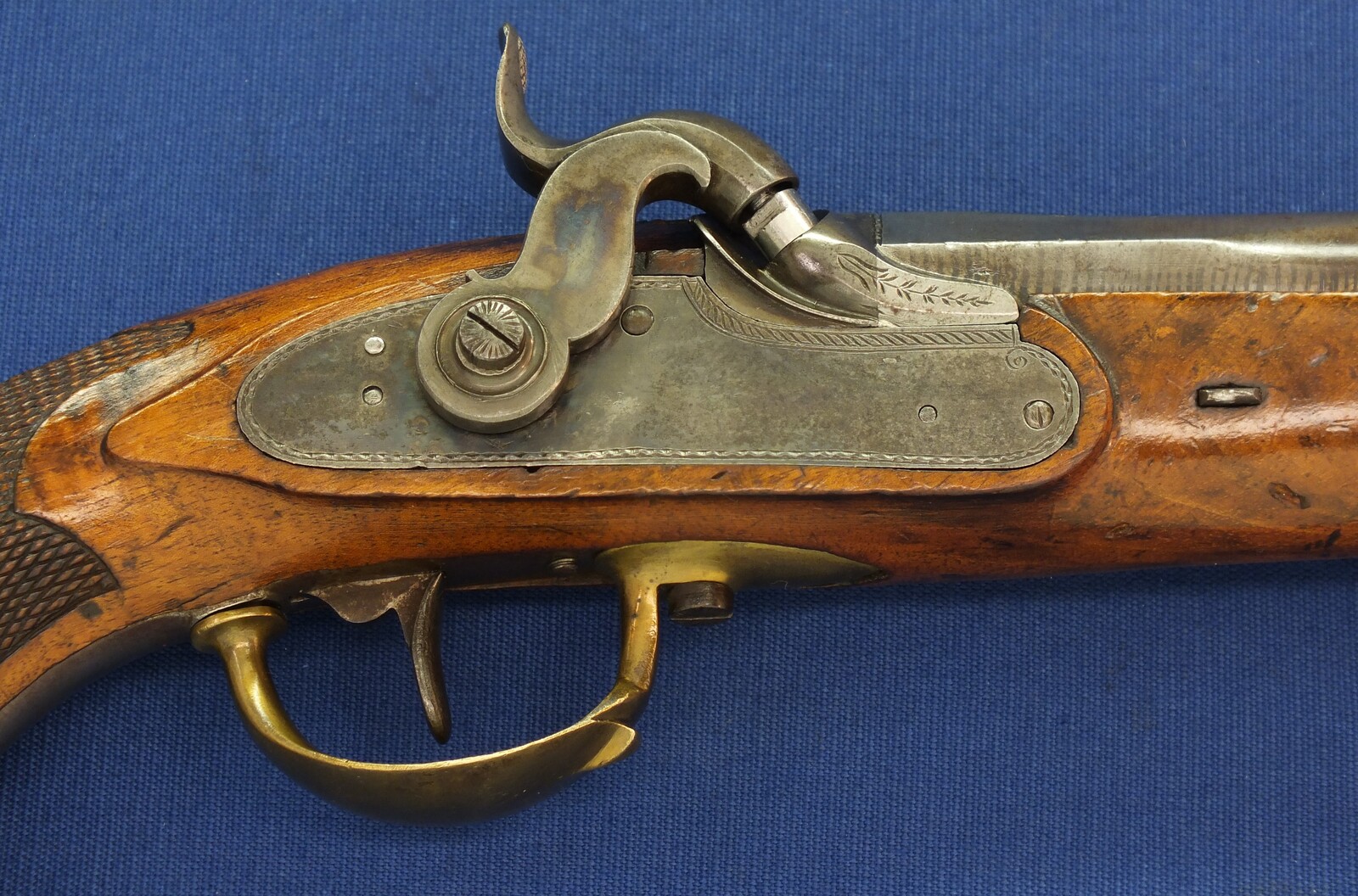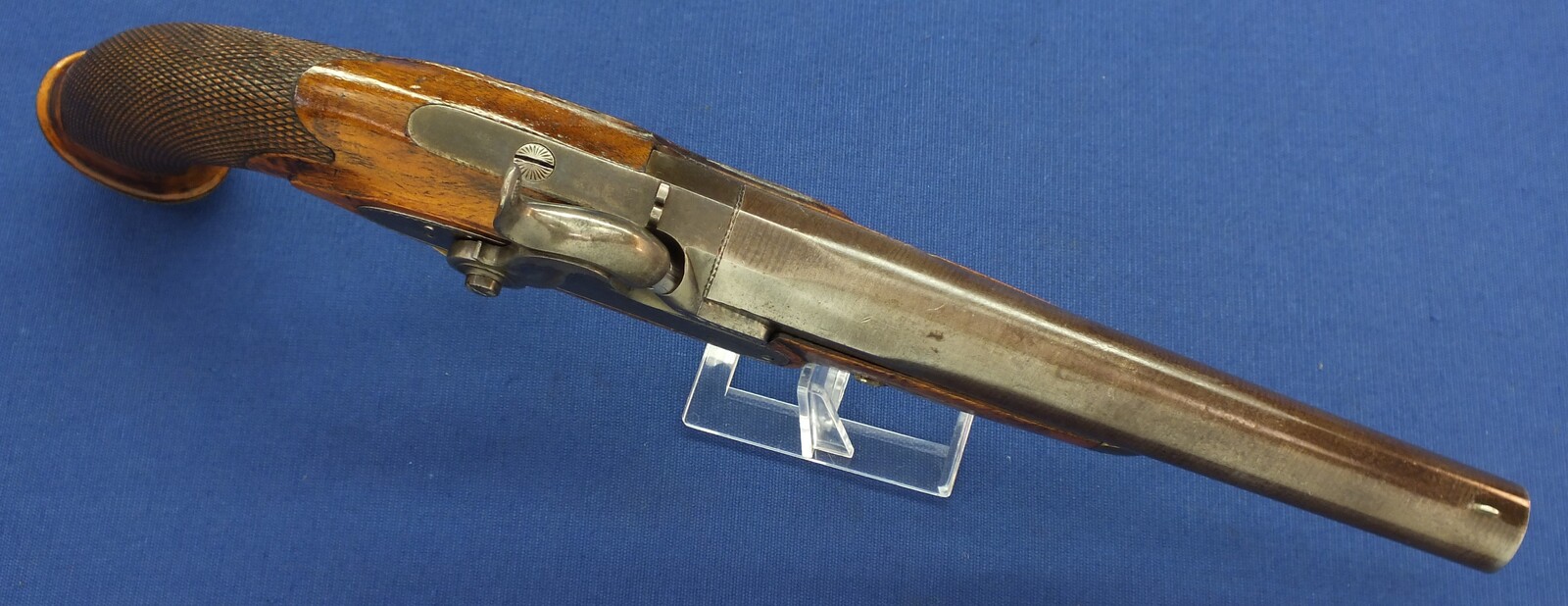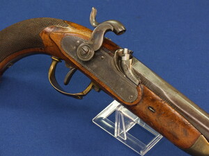 An antique Belgian Model 1816-22 Officers percussion Pistol. Damascened Barrel. Caliber 17,5mm smooth. Length 38cm. In very good condition.