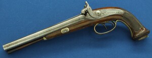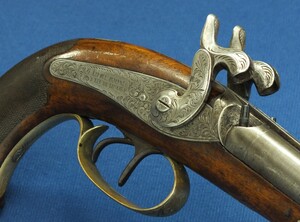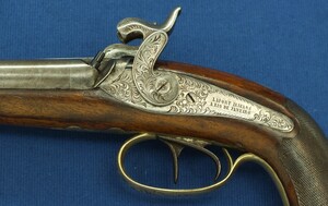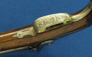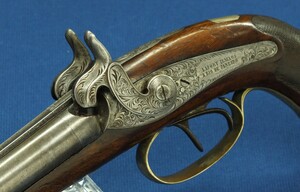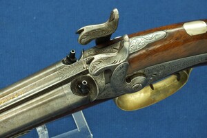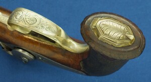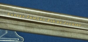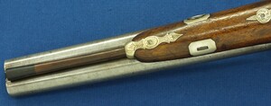 Fine chequered Walnut stock with fine engraved Berlin Silver Mounts. Barrel with ELG proofmark. Made in Belgian and retailed in Brazil.