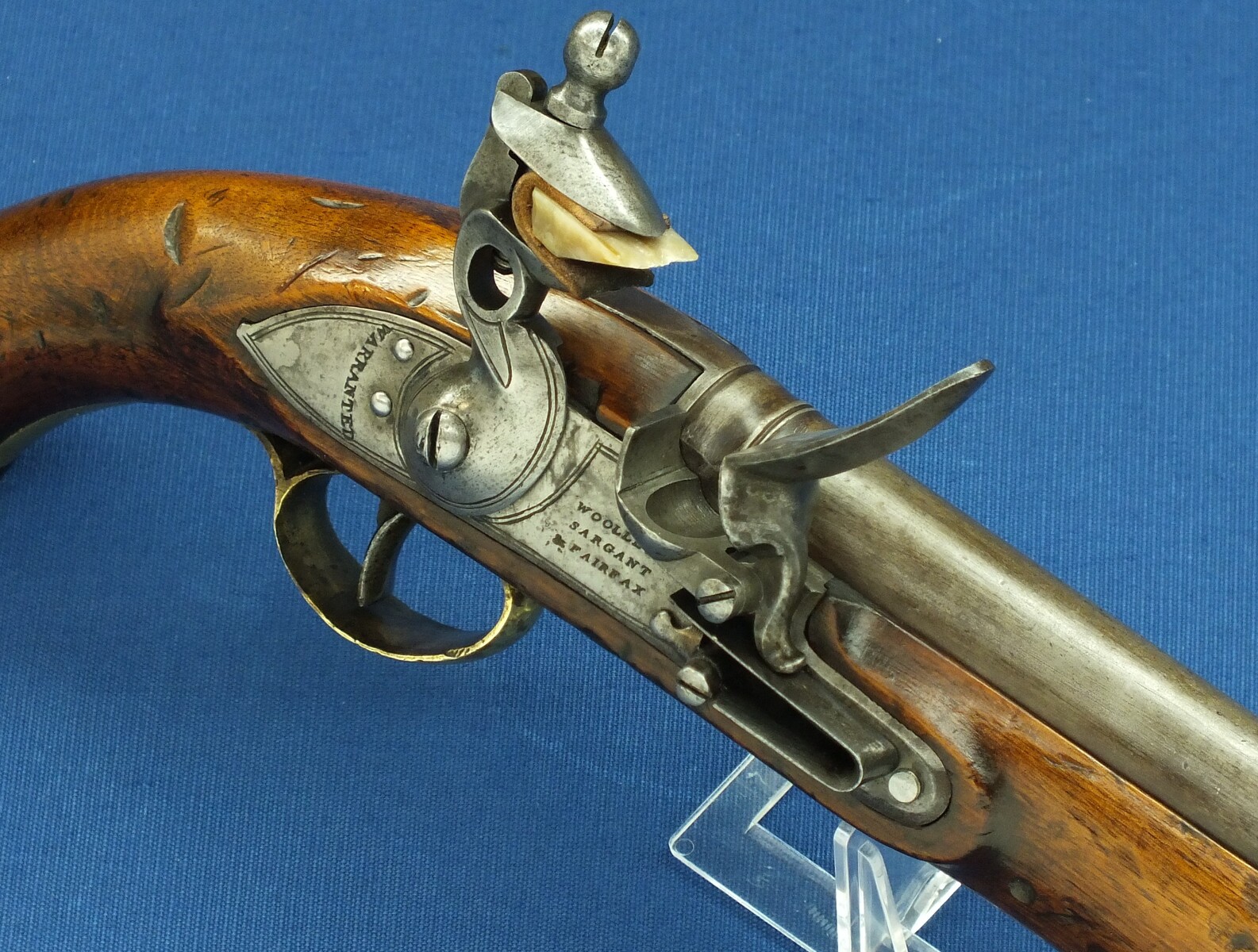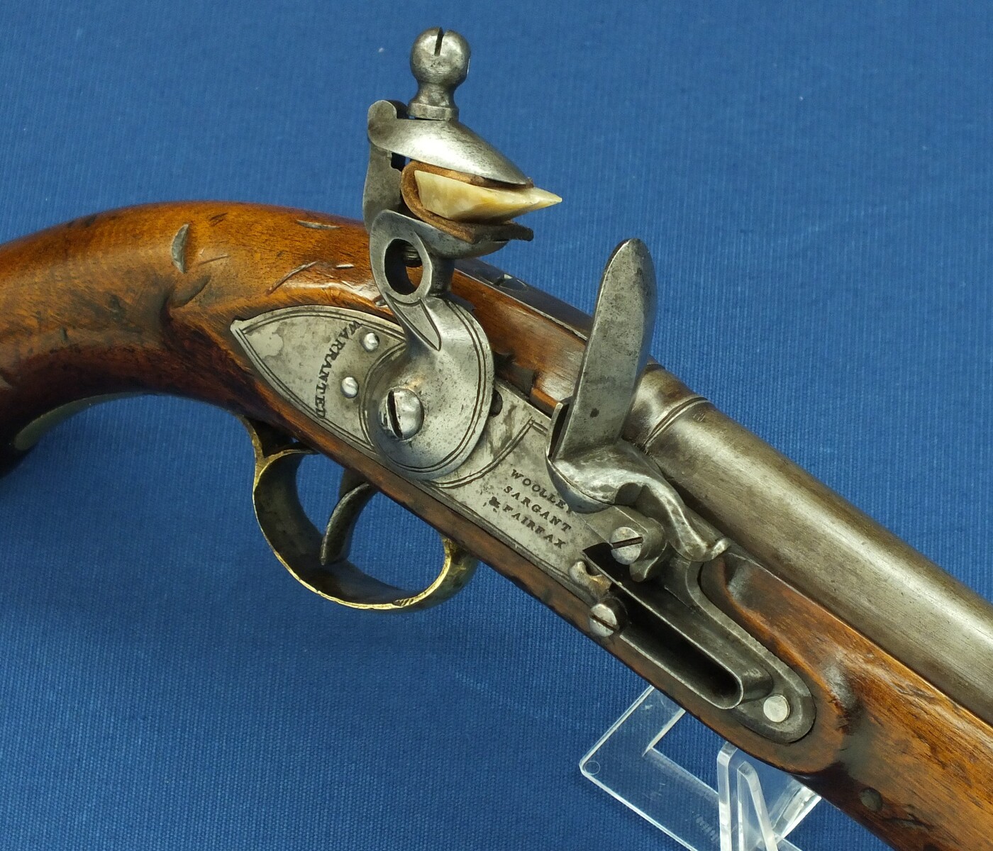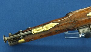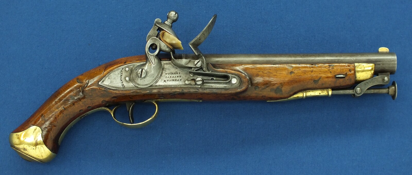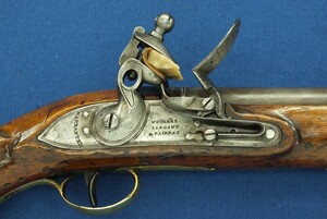 An antique English New Land Pattern Flintlock Pistol by Woolley, Sargant & Fairfax, circa 1800, caliber 16 mm, length 40 cm, in very good condition. Price 1.950 euro