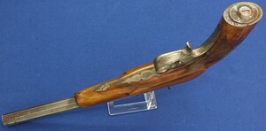 An antique German 4,5mm Target/Saloon percussion Pistol with set-trigger signed: KGL. BAYR. HOFGEWEHRFABRIK V.C. STIEGELE JUN. MÜNCHEN. 8,5 inch octagon barrel. Length 37cm. In very good condition. Price 850 euro.