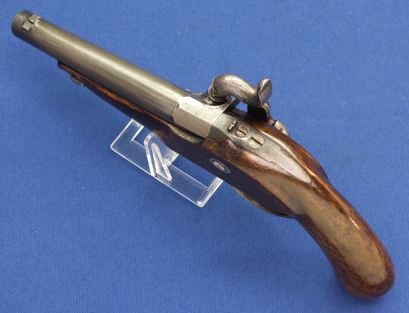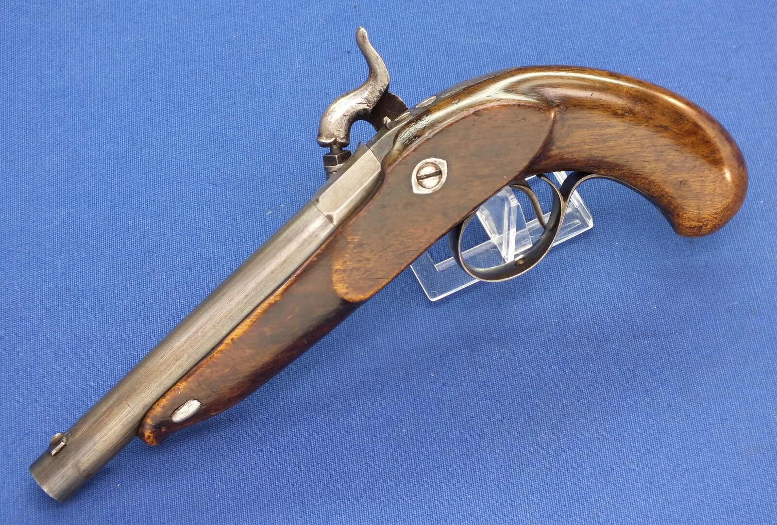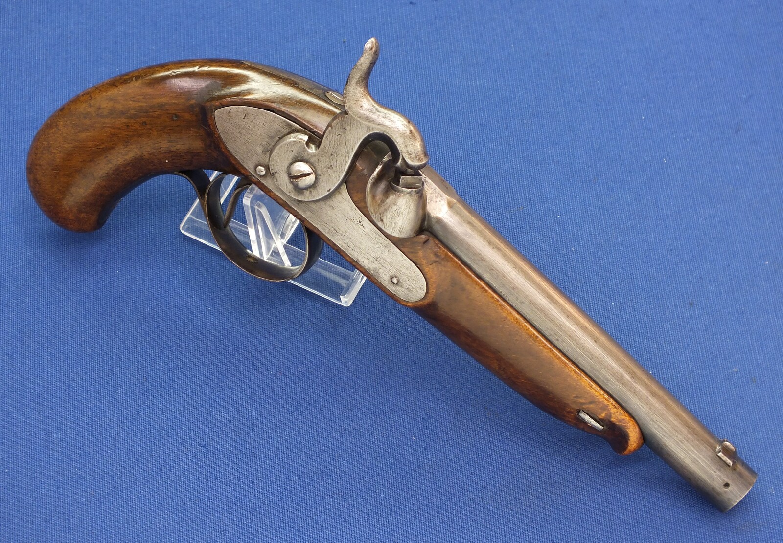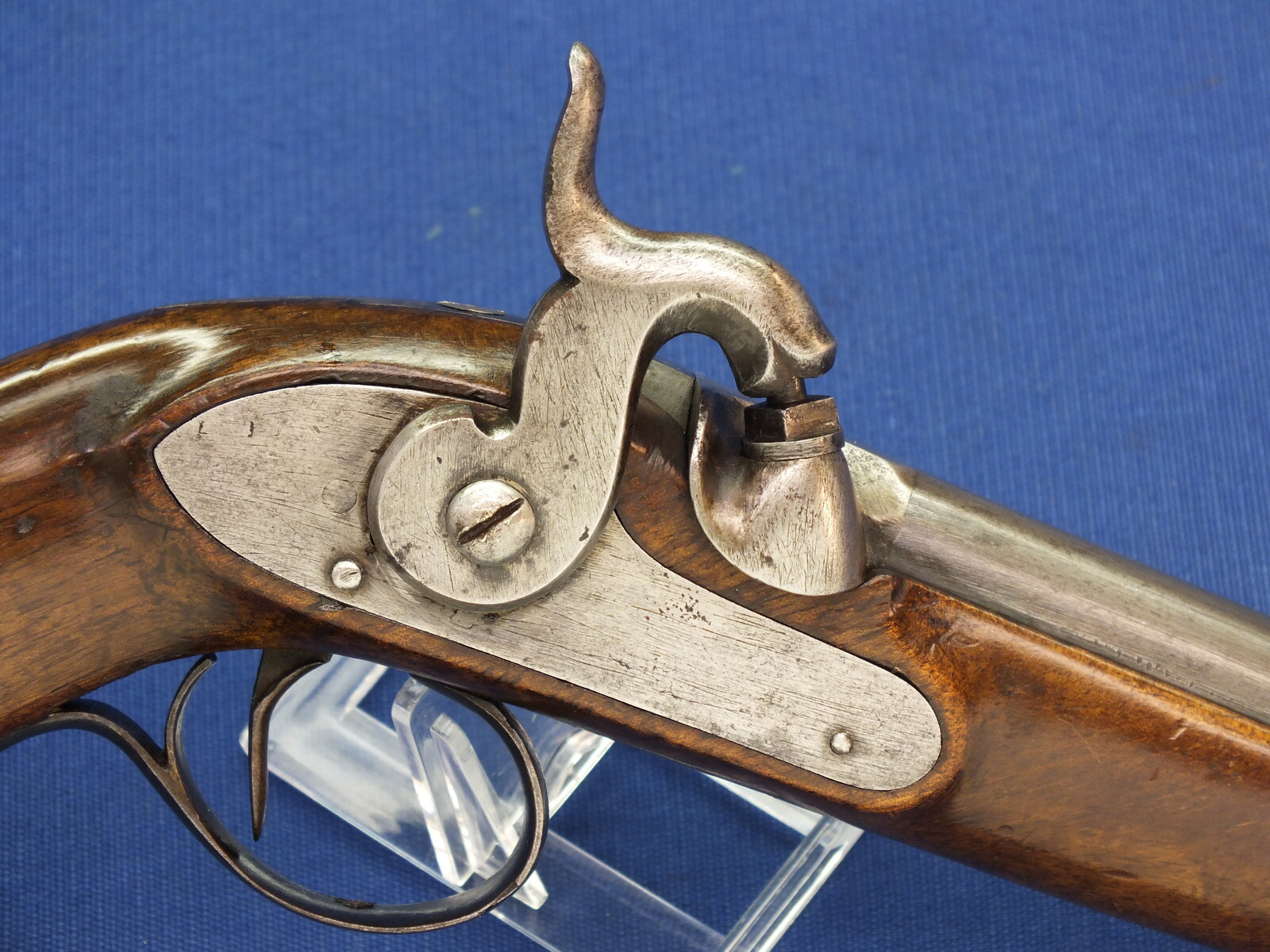 An antique probably Swiss Percussion Pistol with a very rare lock sytem, caliber 10 mm rifled, length 28 cm, adjustable rear-sight, in very good condition