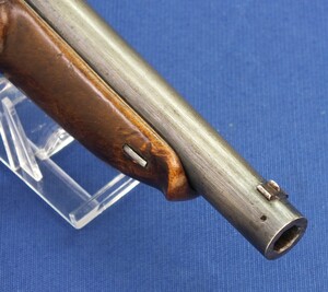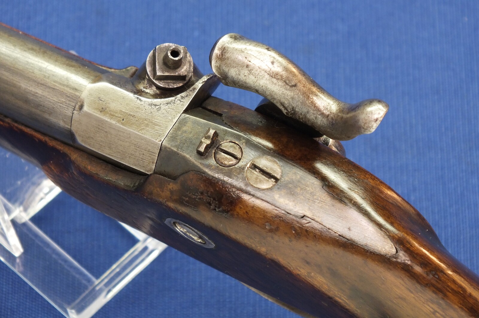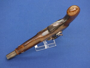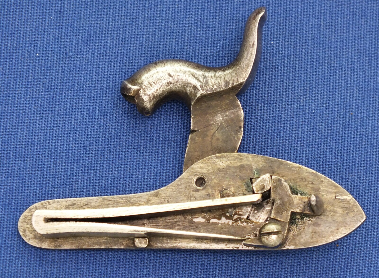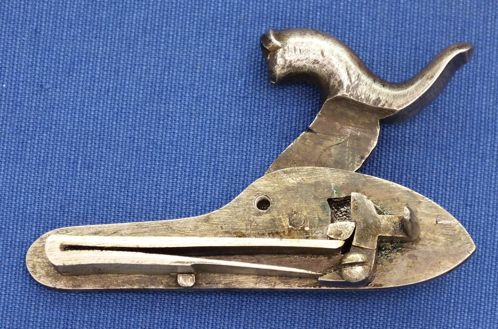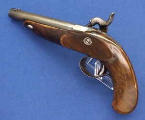 An antique probably Swiss Percussion Pistol with a very rare lock sytem, caliber 10 mm rifled, length 28 cm, adjustable rear-sight, in very good condition
