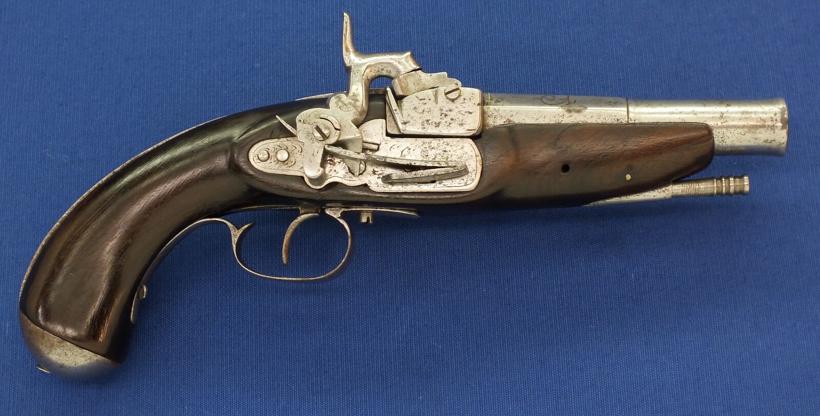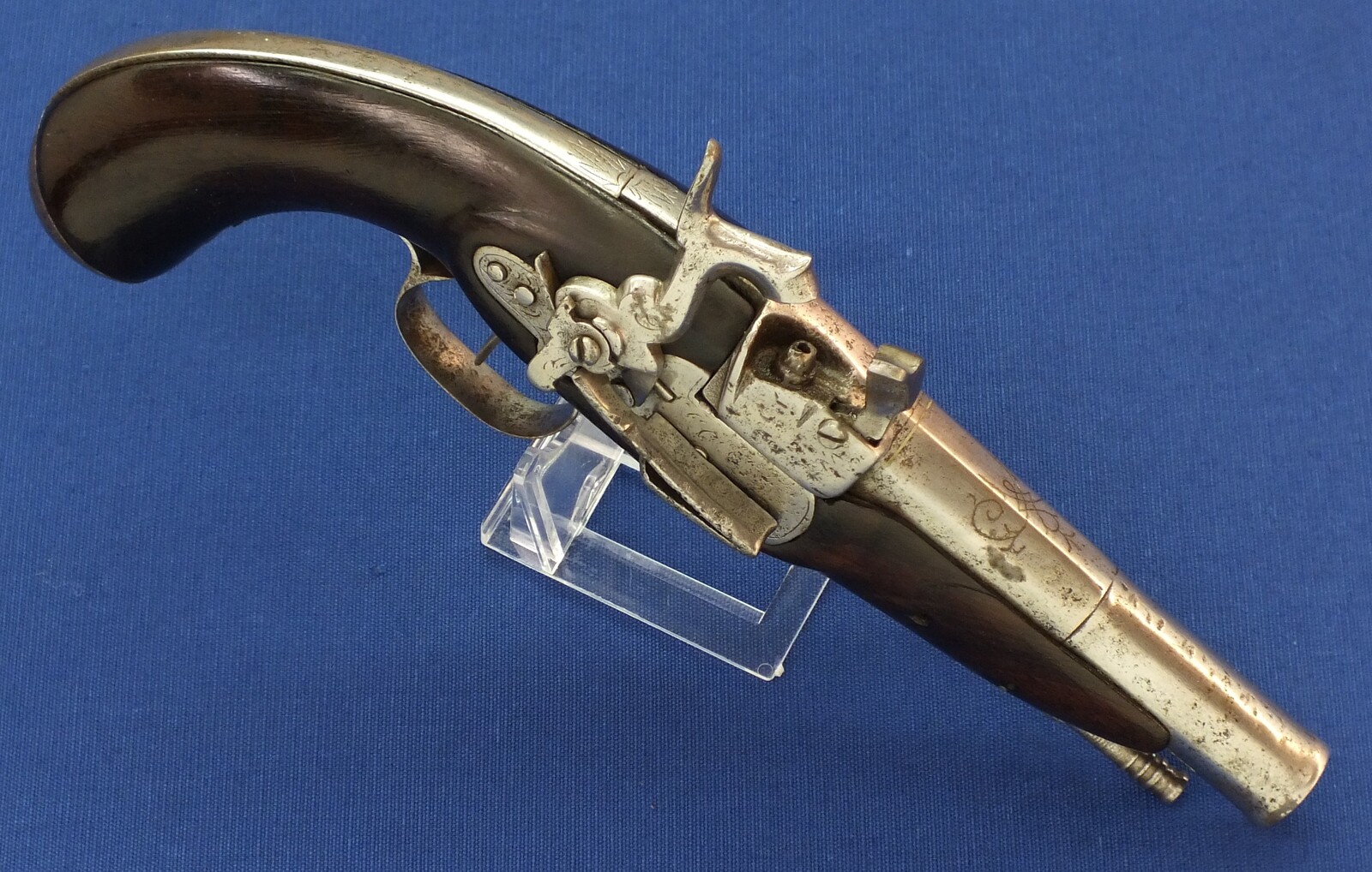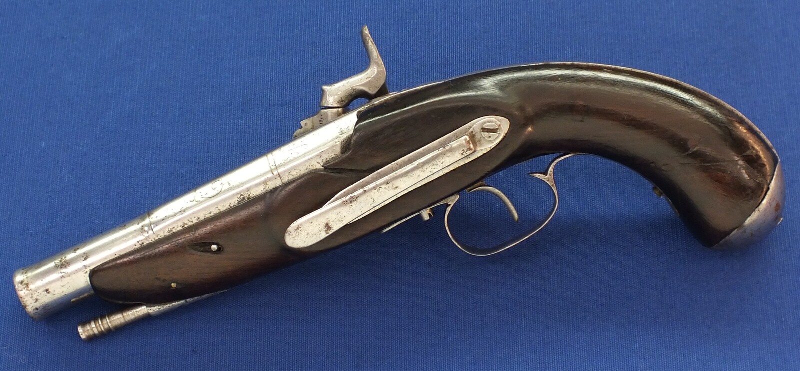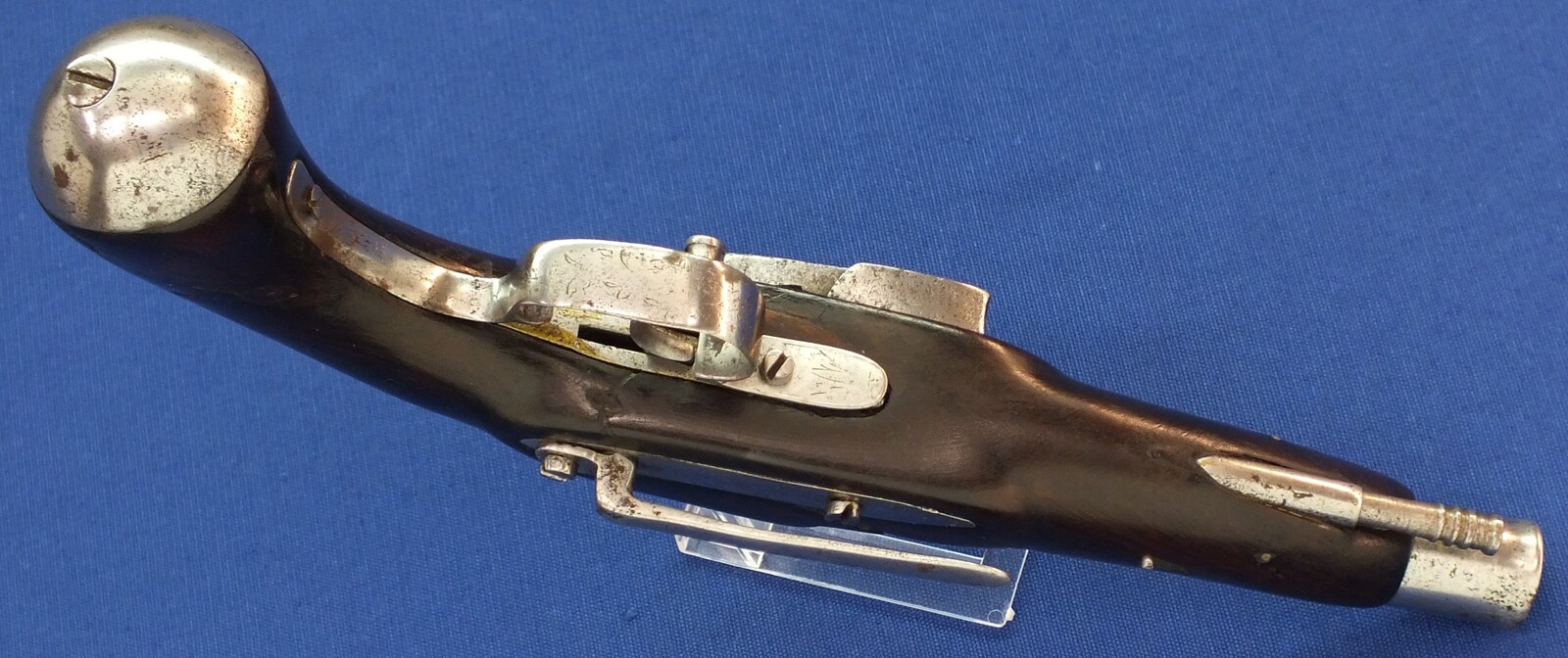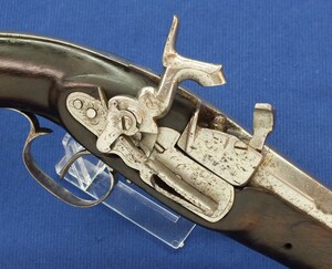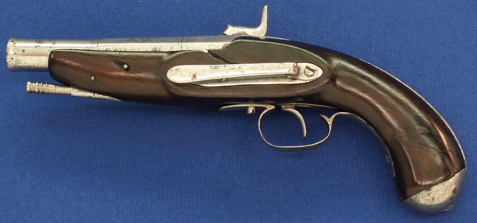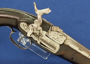 An antique Spanish Miquelet Percussion Belt hook pistol. Caliber 16mm, length 28cm. In fair condition.