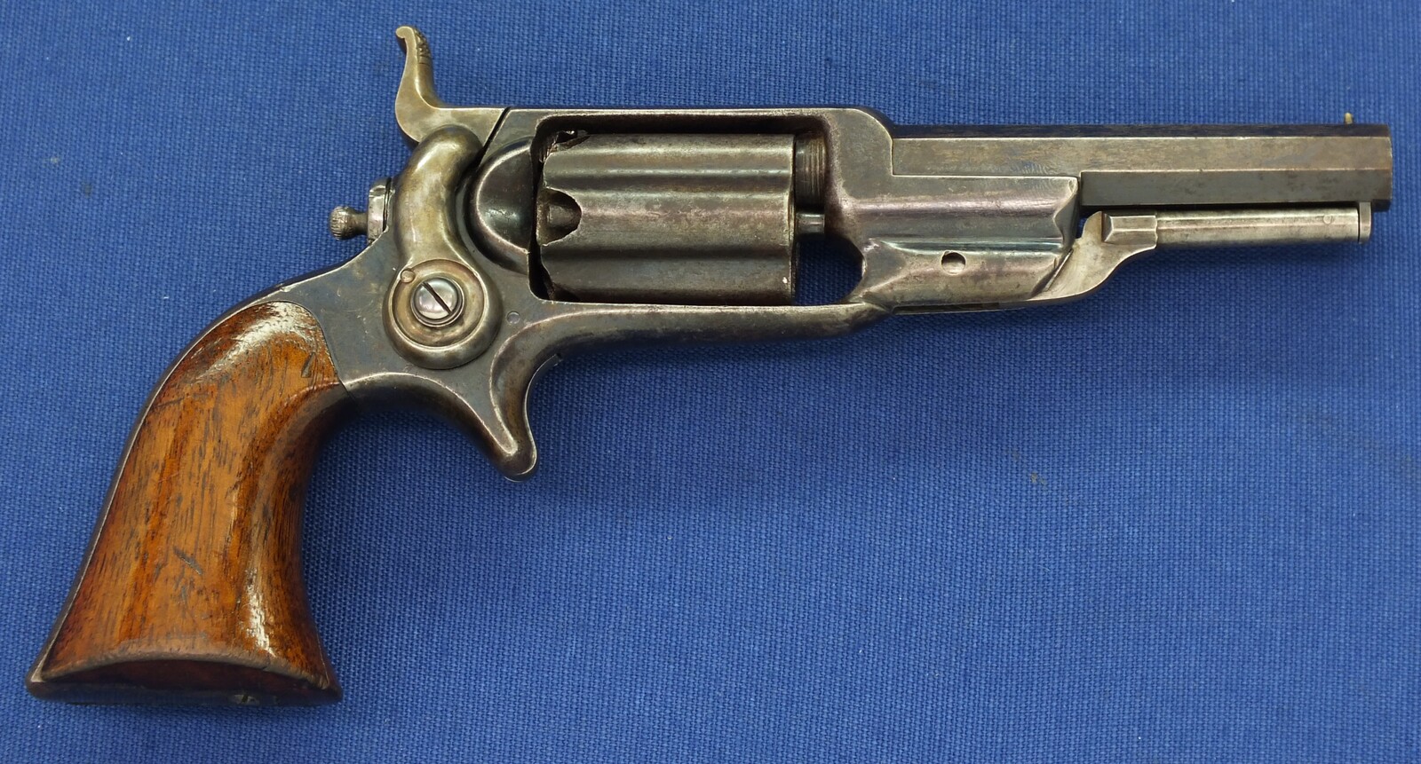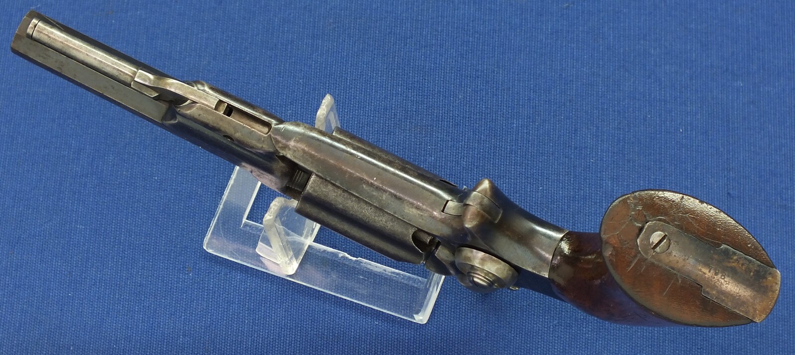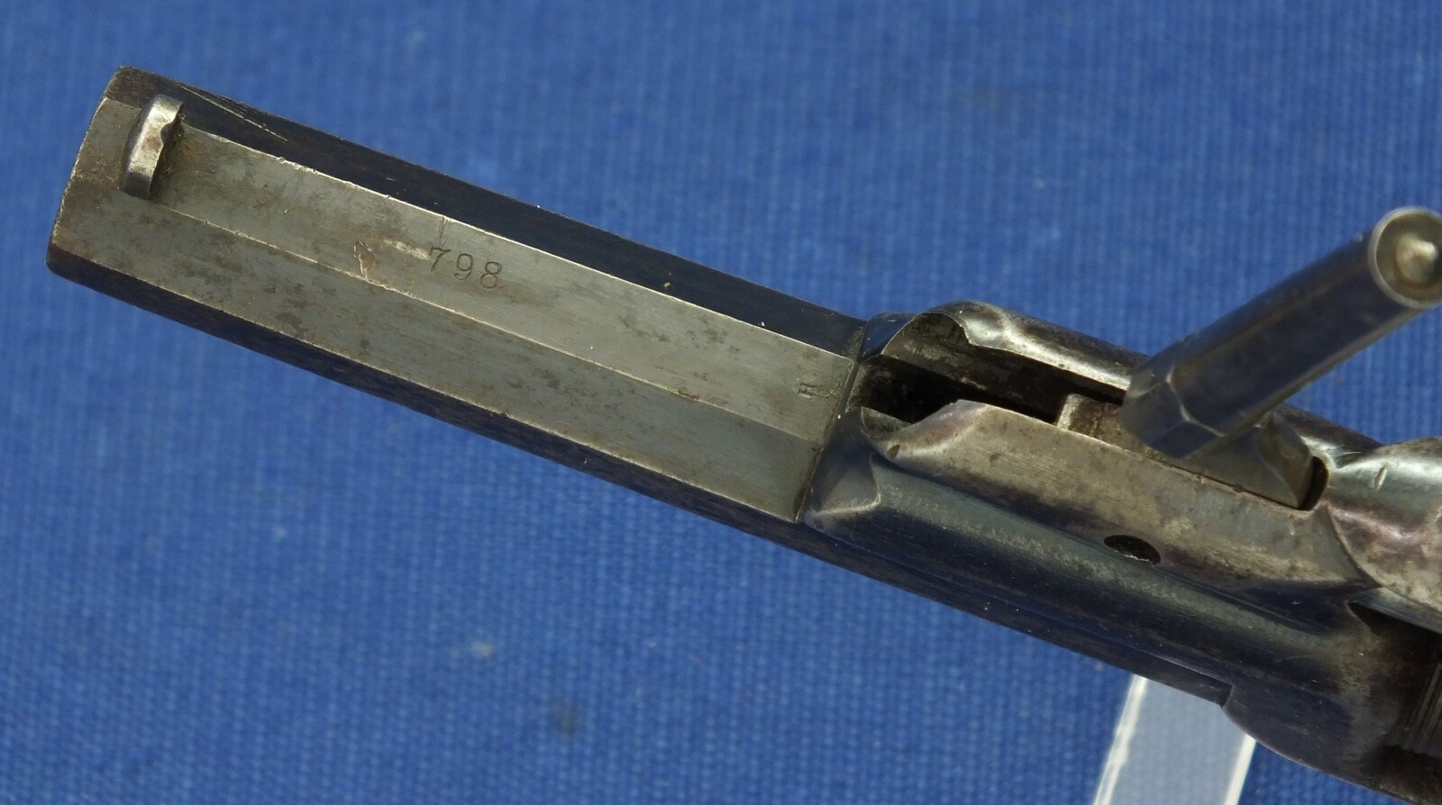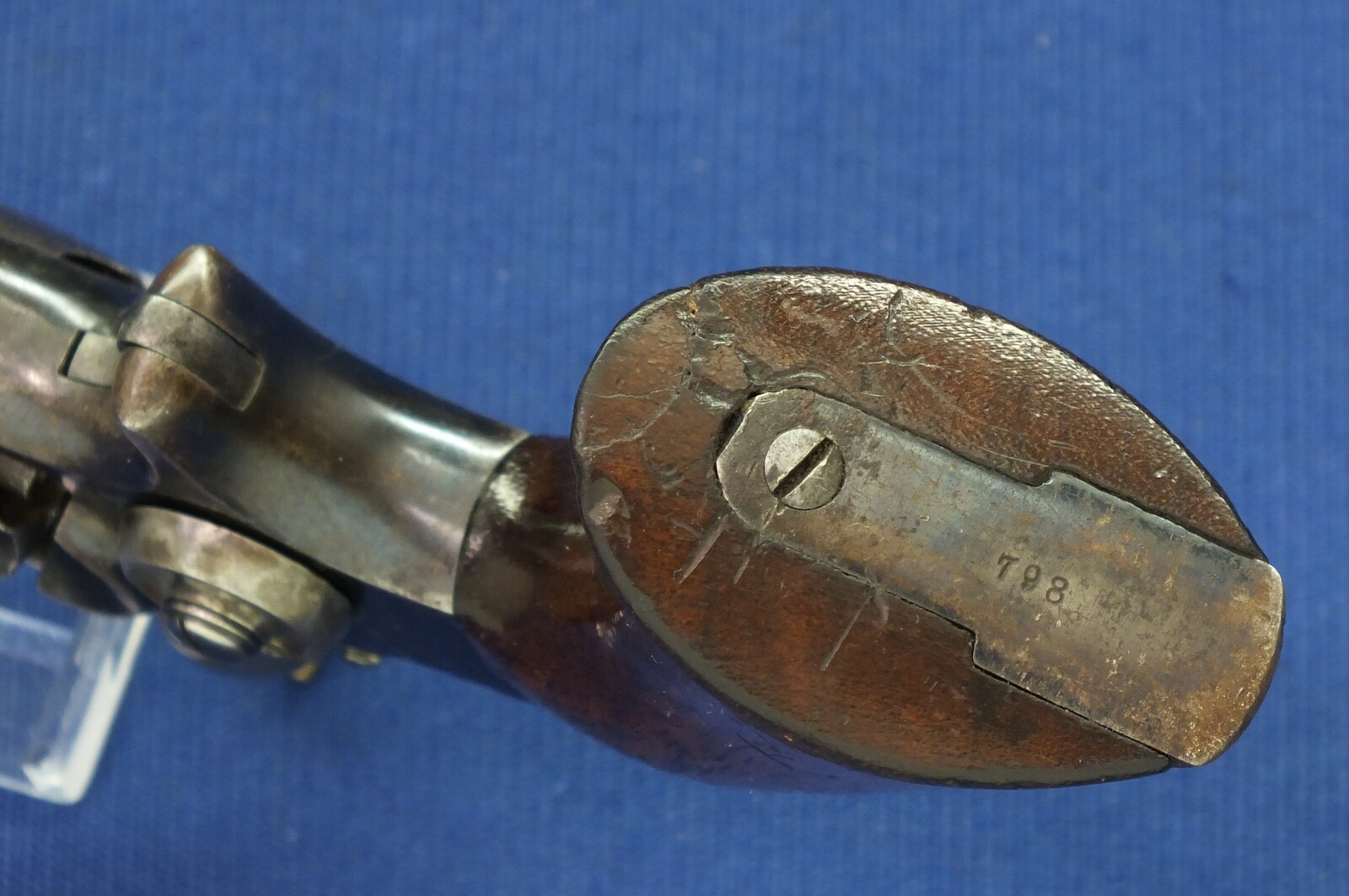 SN798 all matching numbers. A lot of original blue finish with some flaking . Fine varnished Walnut Grip