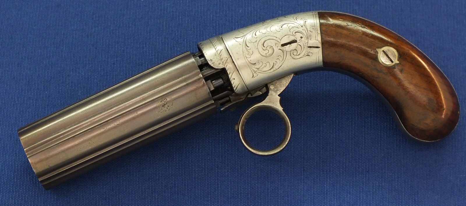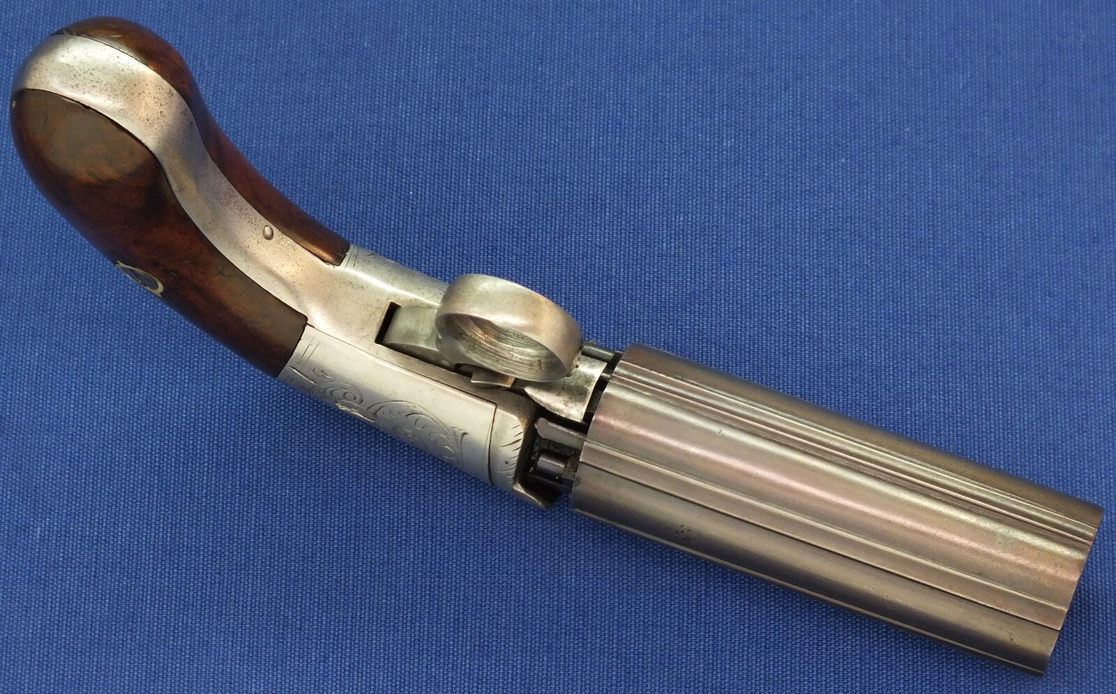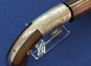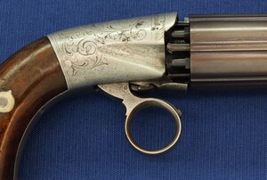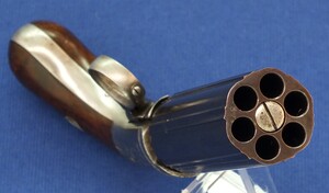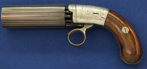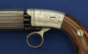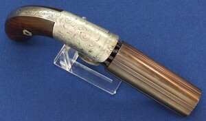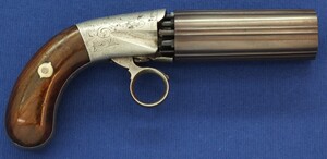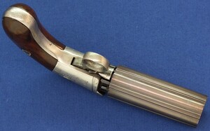 An antique American Blunt & Syms New York 6 shot Underhammer percussion Pepperbox. Caliber 31, 4 inch barrel. Length 21cm. SN57. In very good condition. Price 750 euro.