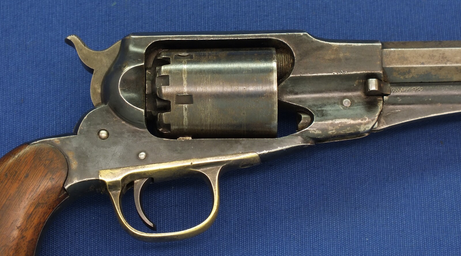 An antique American Civil War Remington New Model Navy 6 shot .36 Caliber Single Action Percussion Revolver. 7 3/8 inch octagon Barrel. Length 35,5cm. In very good condition. Price 2.650 euro.