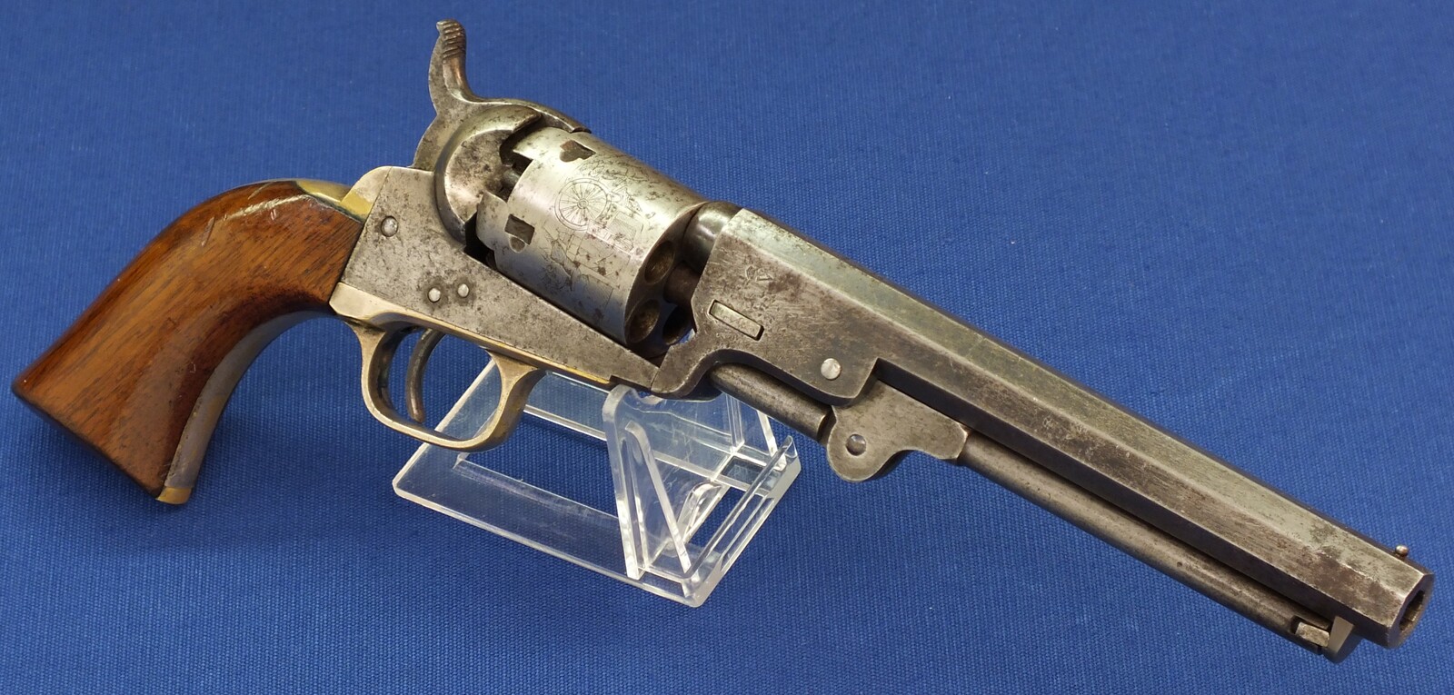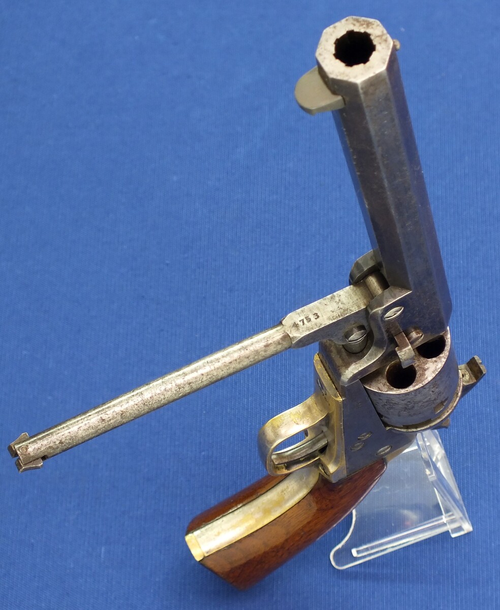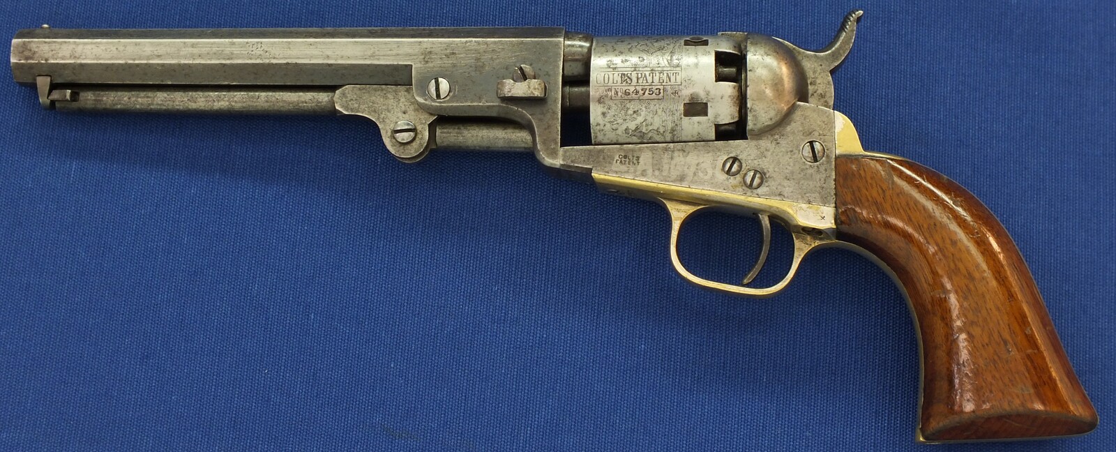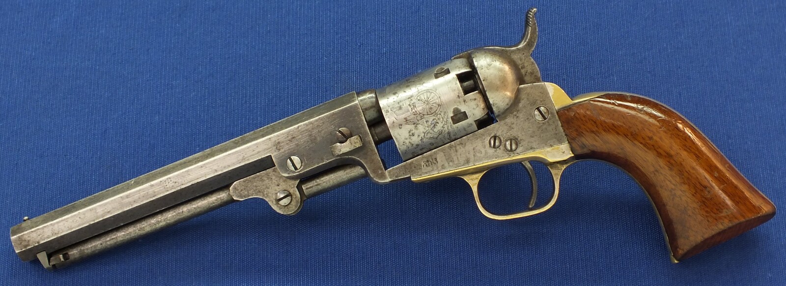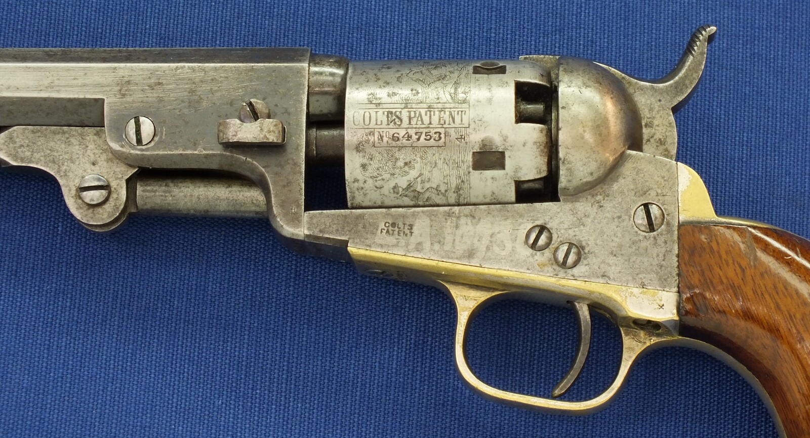 SN64753 all matching numbers made 1853. Rest of original blue. Fine and clear cylinder scene. On cylinder and barrel a crowned V. Fine grip in original finish.
